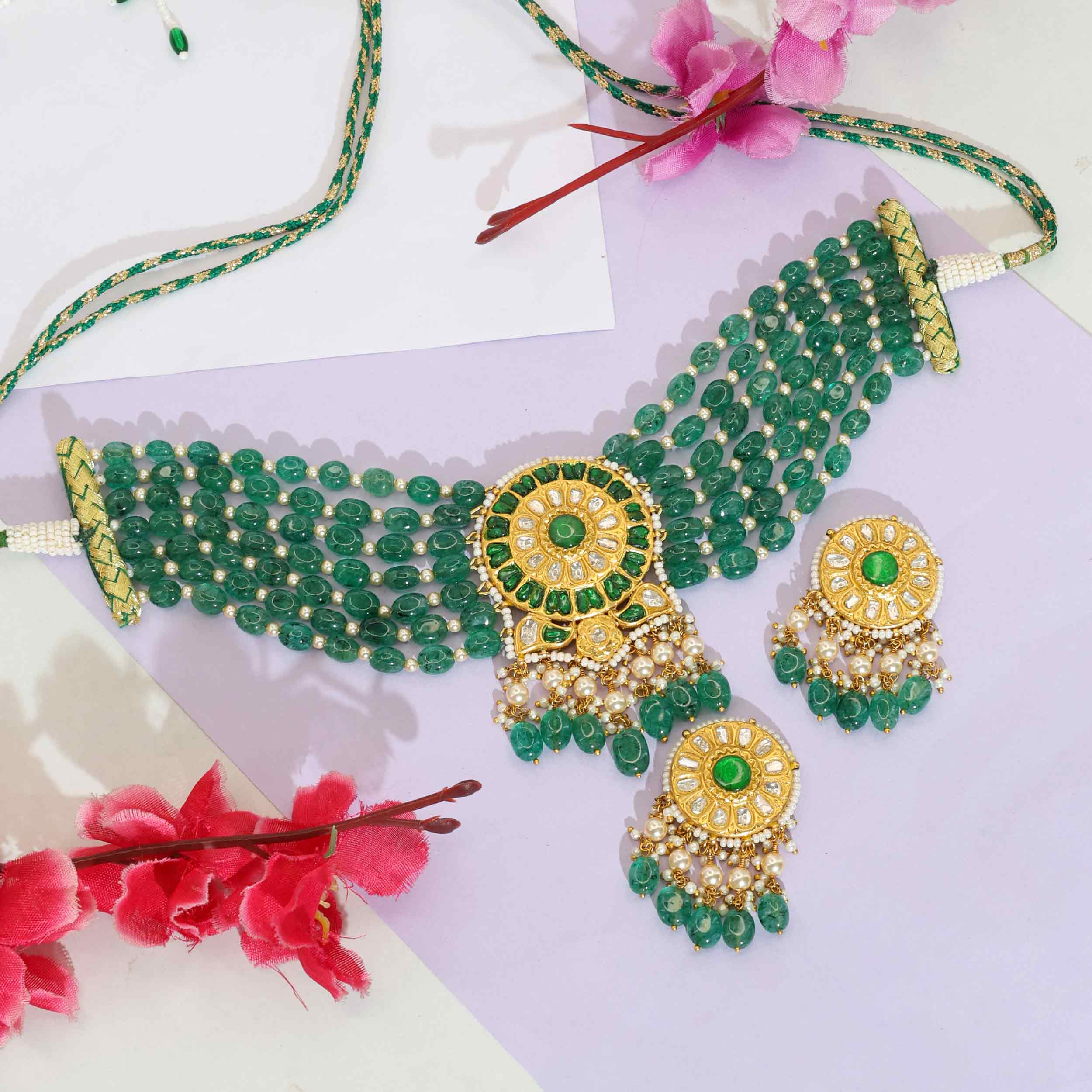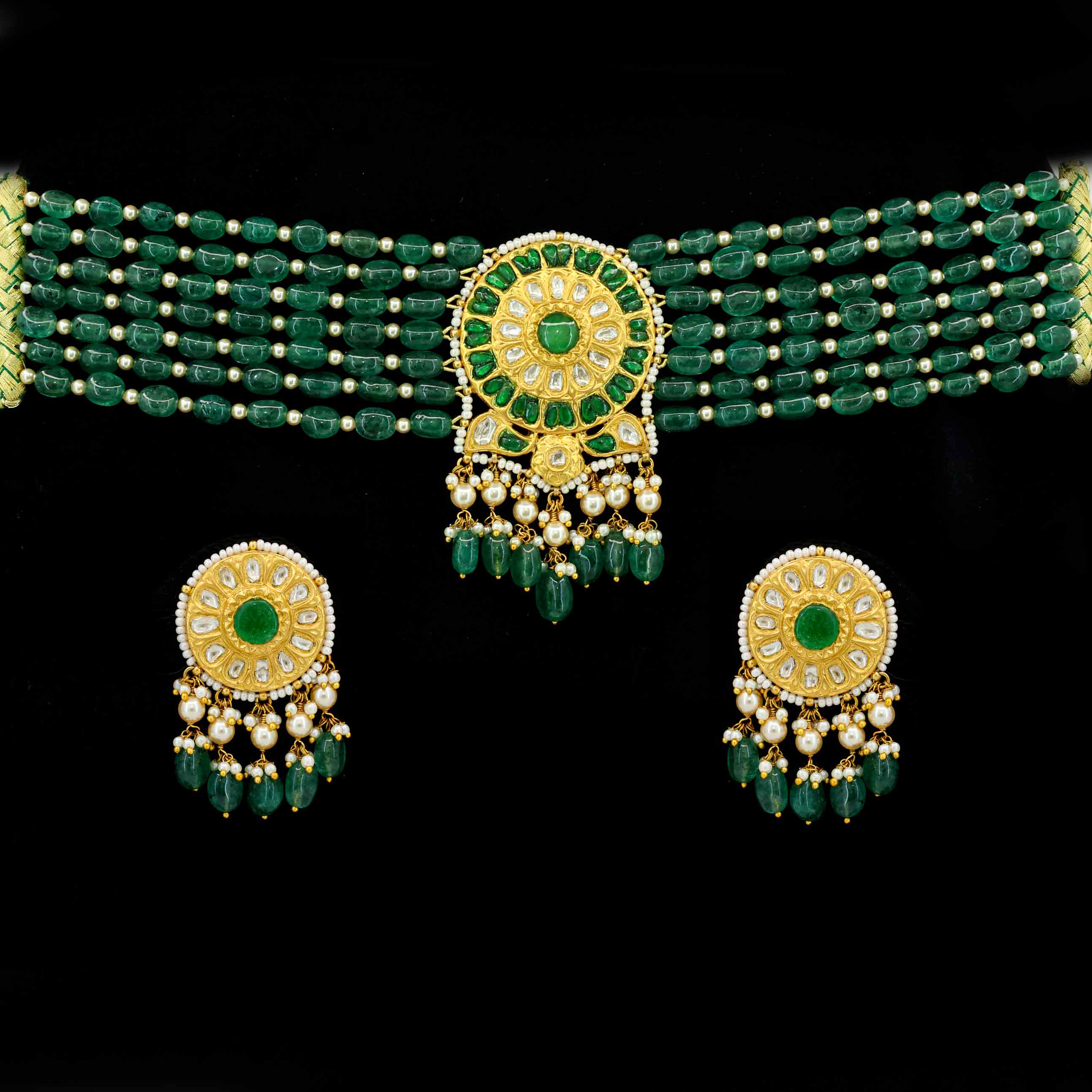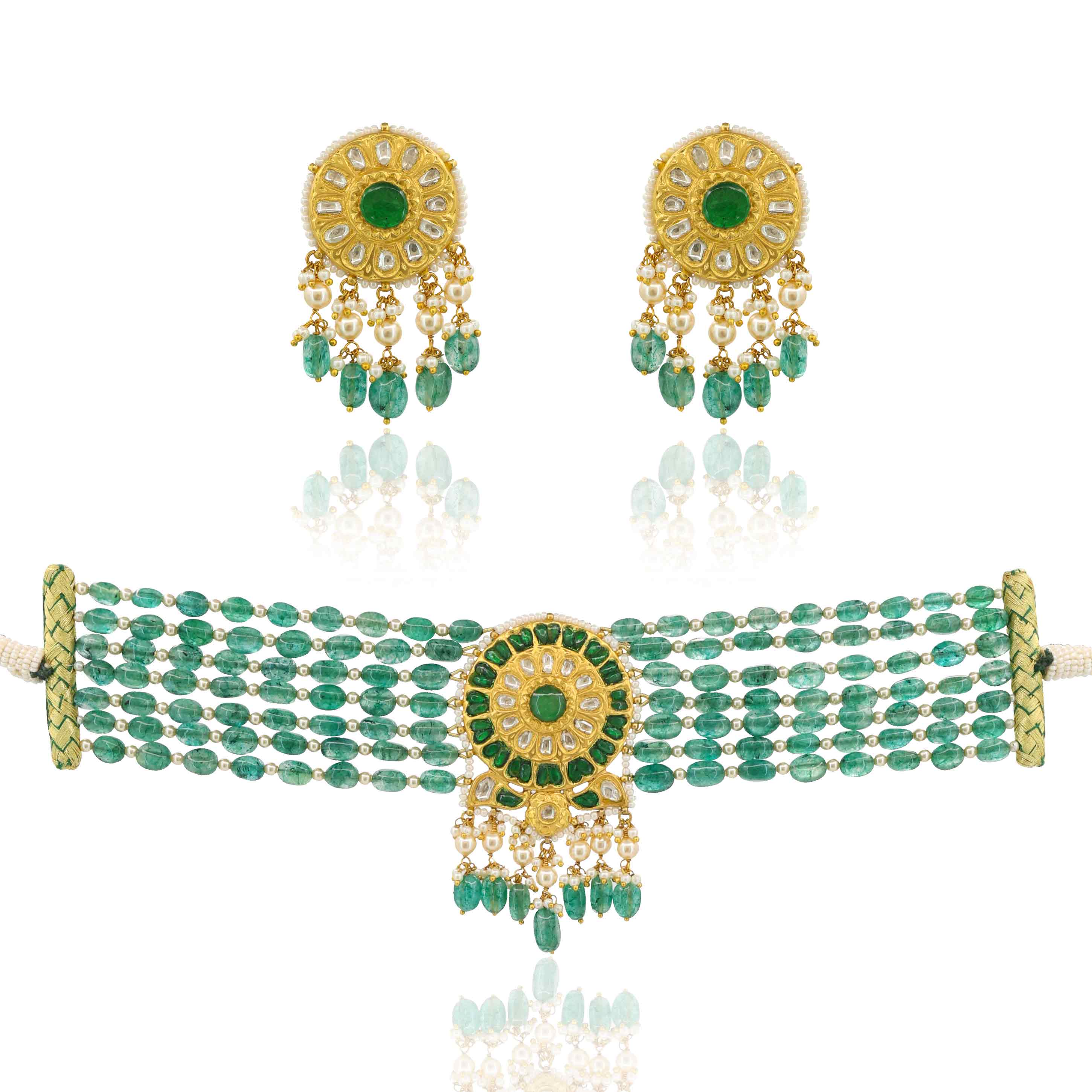This gold choker set features a stunning centerpiece with natural polki diamonds and a vibrant green emerald. The necklace is strung with multiple rows of elegant green emerald beads and delicate pearls, creating a rich and classic look. The matching earrings beautifully complement the set, making it perfect for special occasions