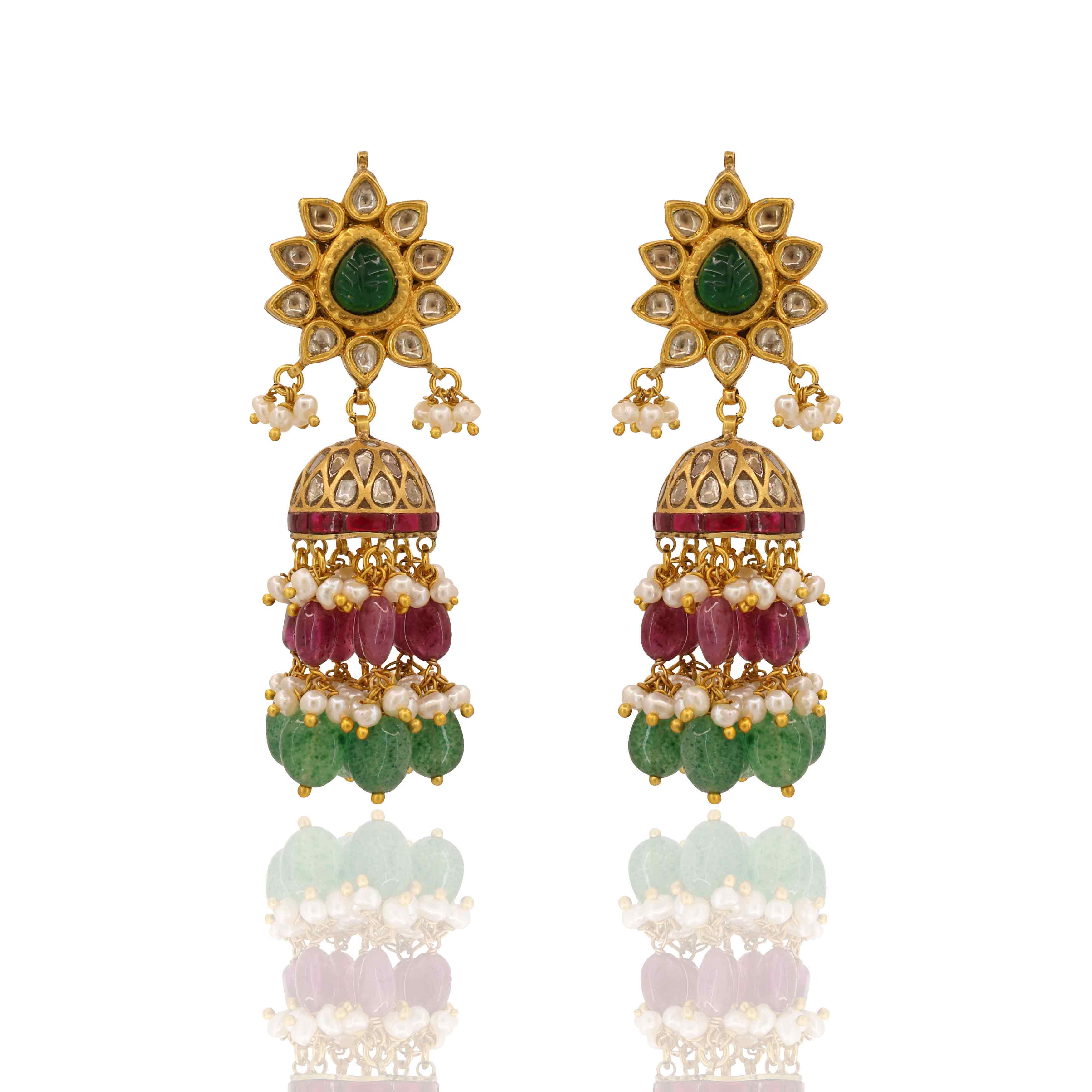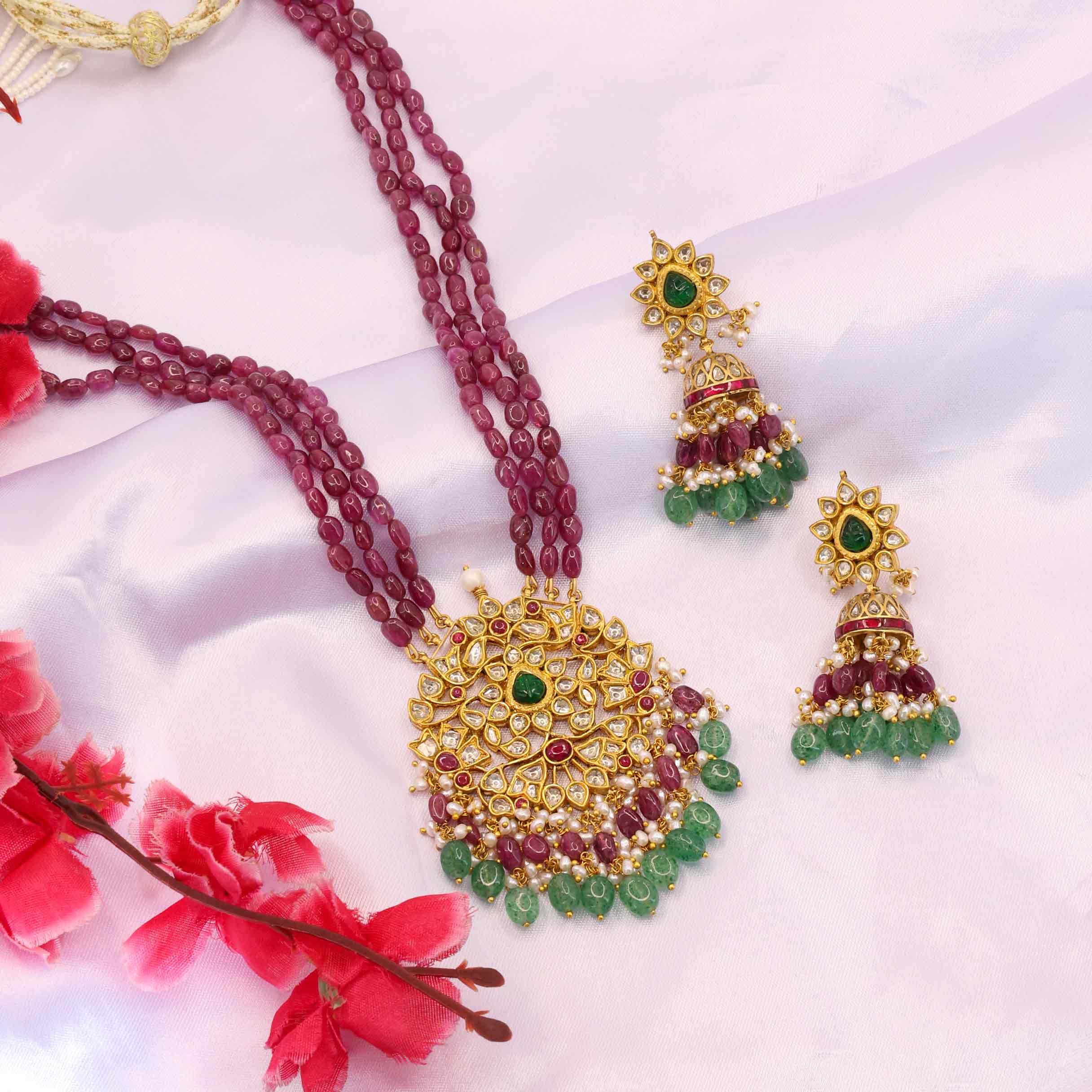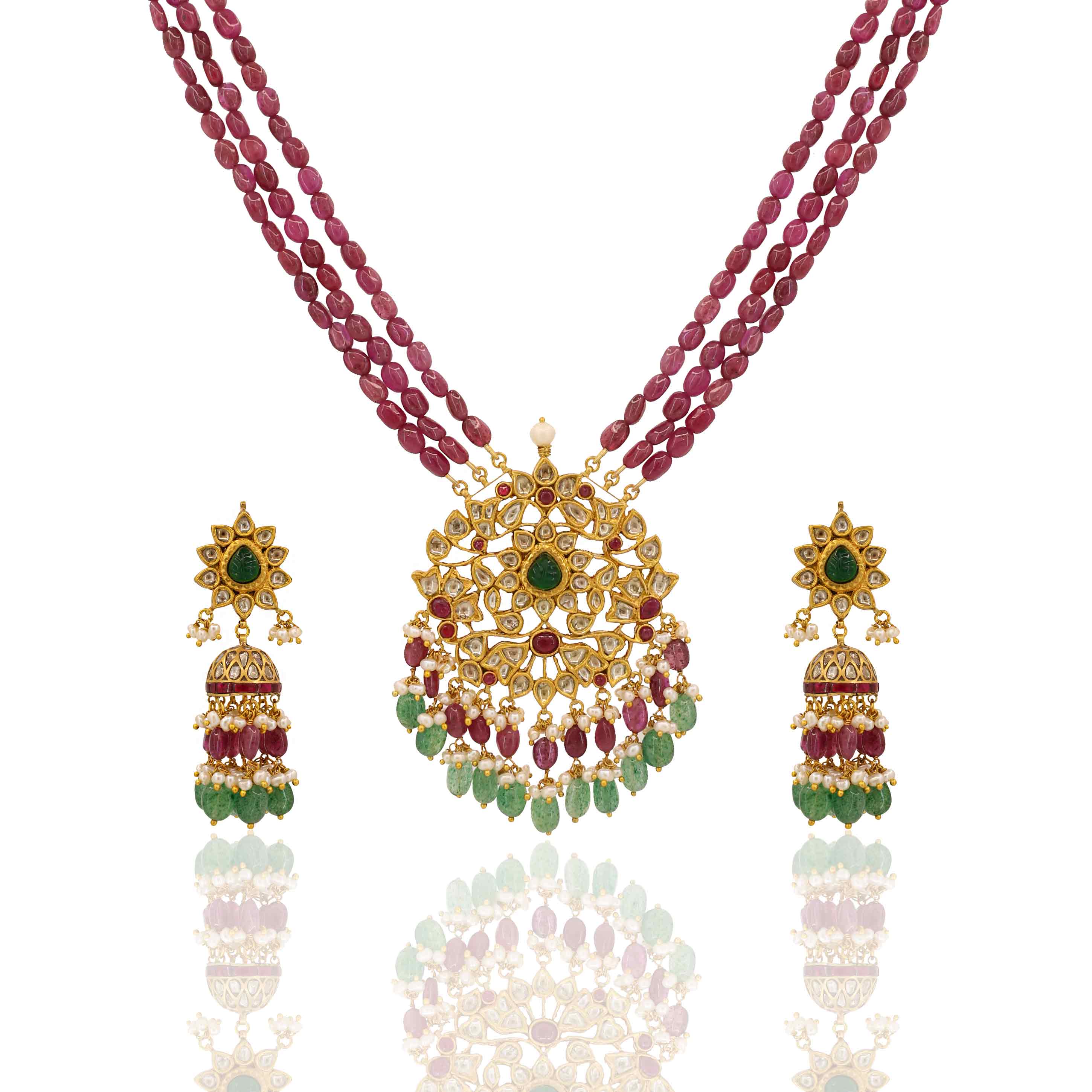 This strikingGold Pendant Setfeatures three strands of vibrantruby beads. The elaborate pendant is set withNatural Polki Diamonds, and accented with ruby and emerald stones. It is finished with beautiful dangling ruby, emerald, and pearljhumkidrops.