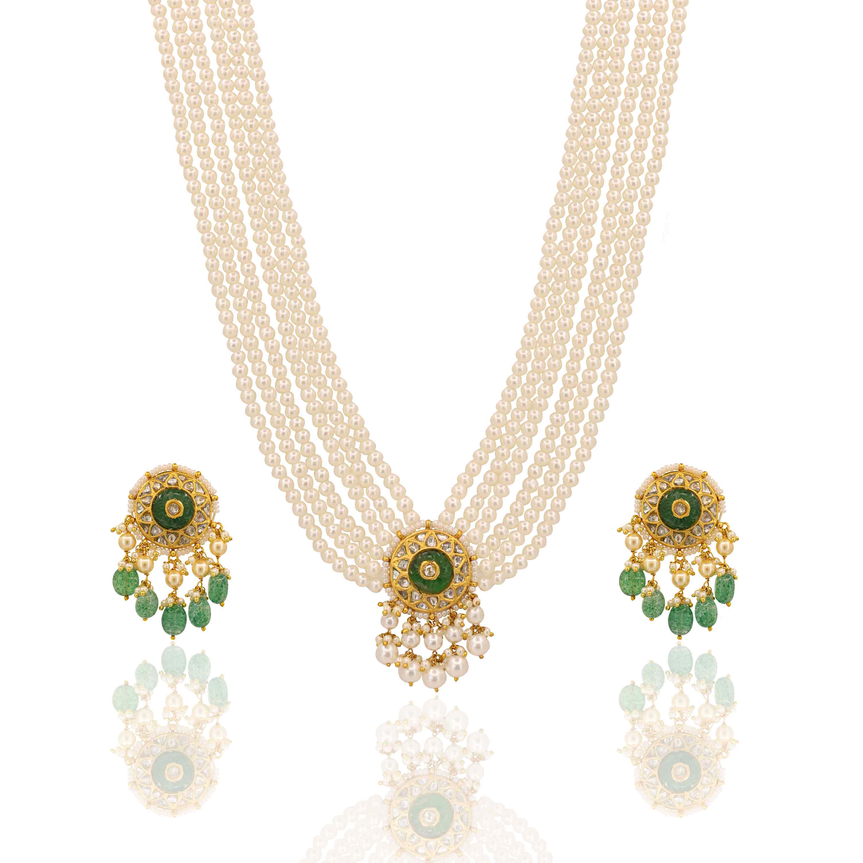 This elegant Gold Necklace Set features five lustrous strands of pearls leading to a stunning circular pendant. The centerpiece, along with the matching earrings, is studded with Natural Polki diamonds surrounding a vibrant green enamel (or emerald) inlay. Delicate pearl and emerald drops complete the traditional design.