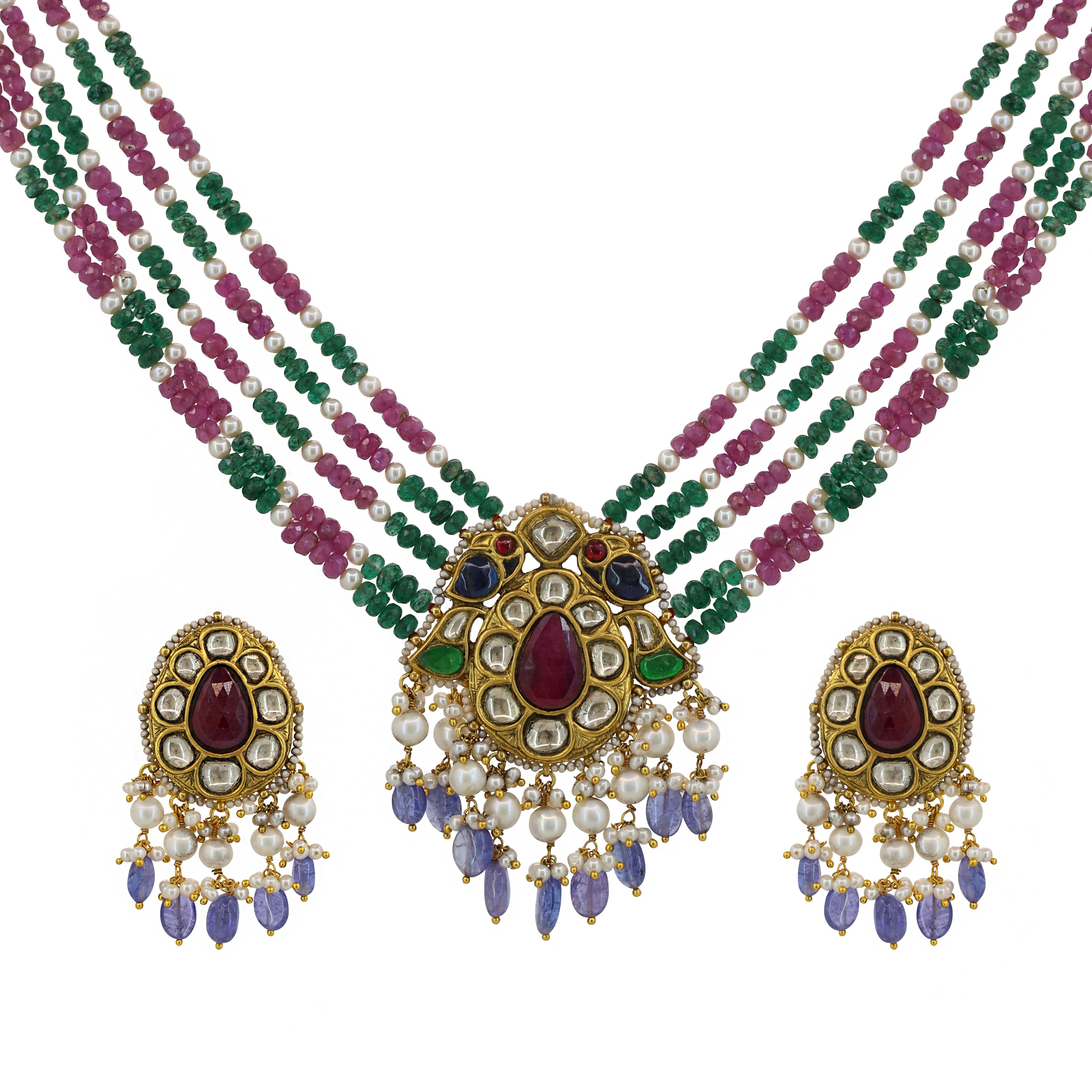 A multi-layered pendant necklace featuring natural syndicate Polki diamonds, pear-shaped rubies, and other stones in gold. This piece is stringed with emerald, ruby, pearl, and tanzanite beads, and comes with matching earrings, featuring exquisite bead dangles.