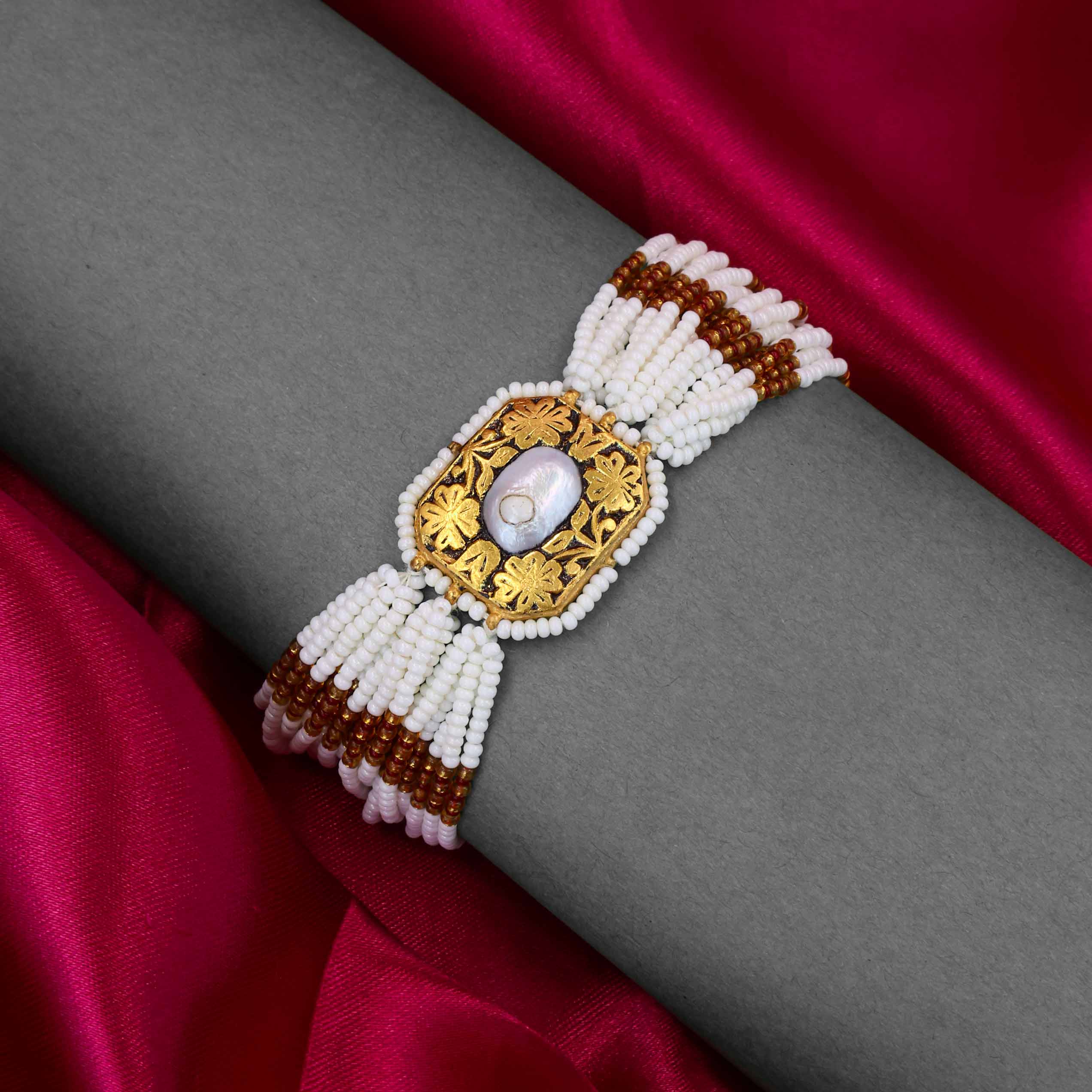 This elegant bracelet features a central gold plaque with intricate Chitai work and a prominent pearl centerpiece. The plaque is framed by strings of white pearls and contrasting brown chead beads, creating a striking and sophisticated design. The delicate and detailed craftsmanship of the goldwork stands out against the simple, classic beauty of the pearl beads.