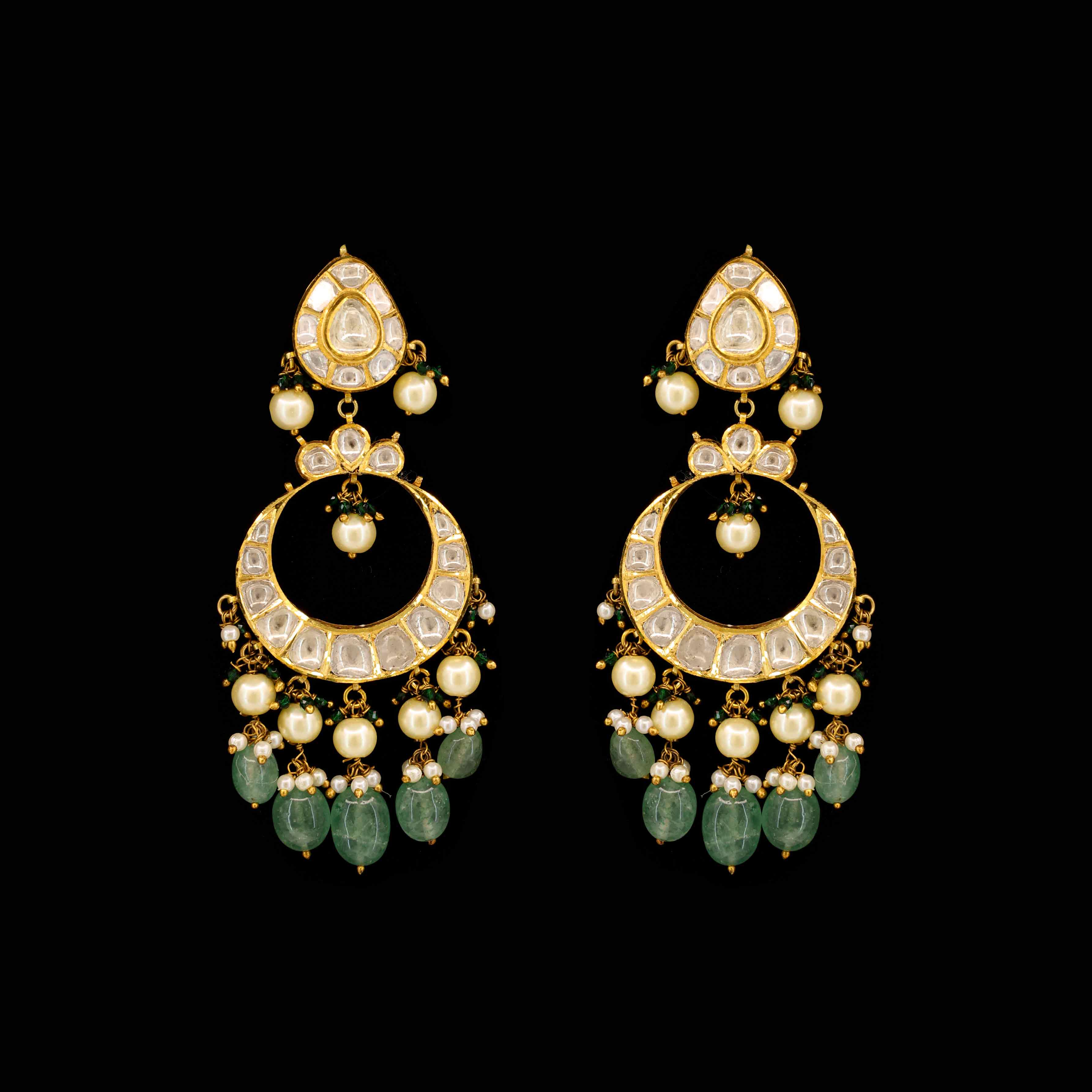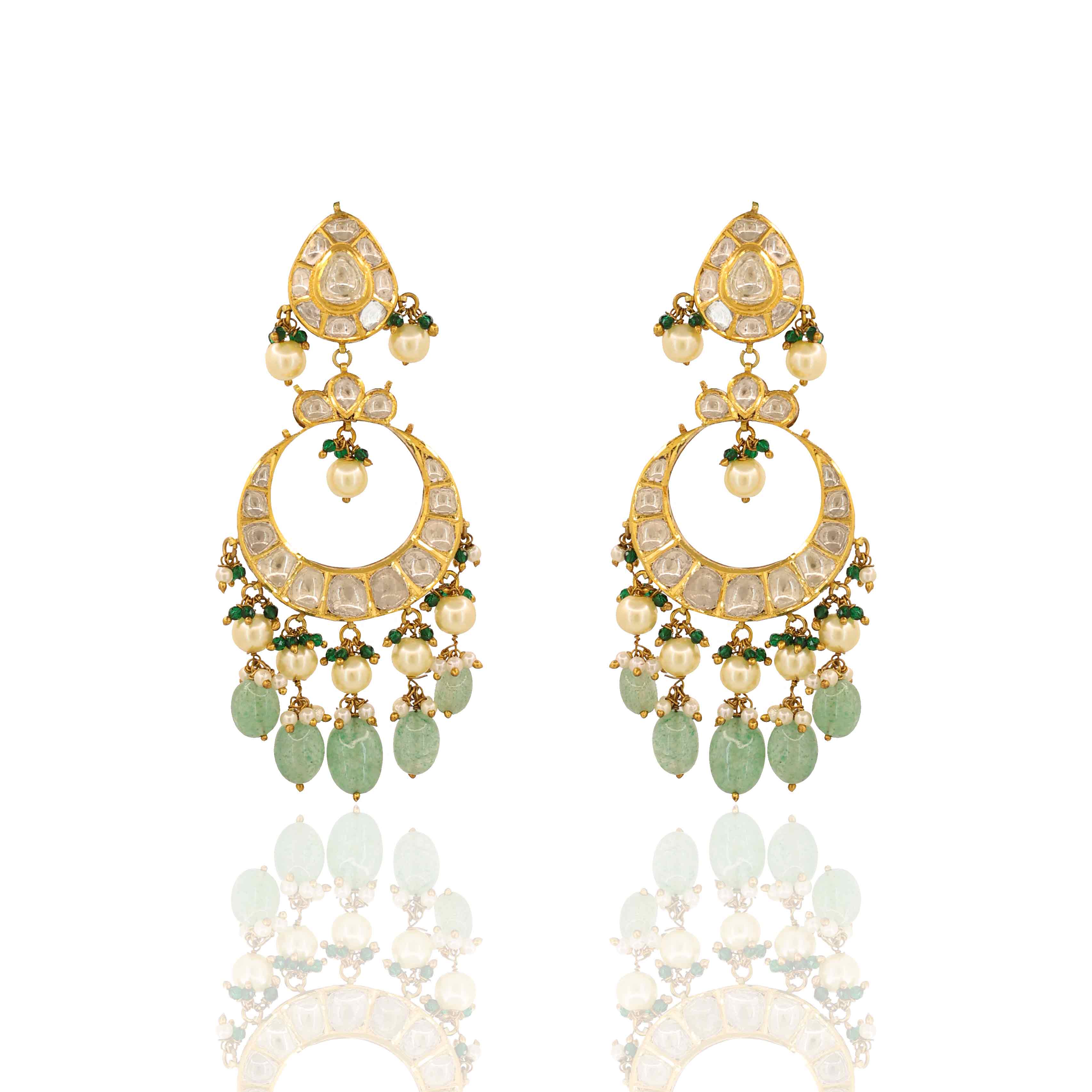 Gold Jadau Chandbaali earringsfeature a large crescent set with brilliantNatural Polki Diamonds. They are gracefully accented with danglingpearlsand polishedglass-filled emerald beads, offering a perfect blend of sparkle and traditional color.