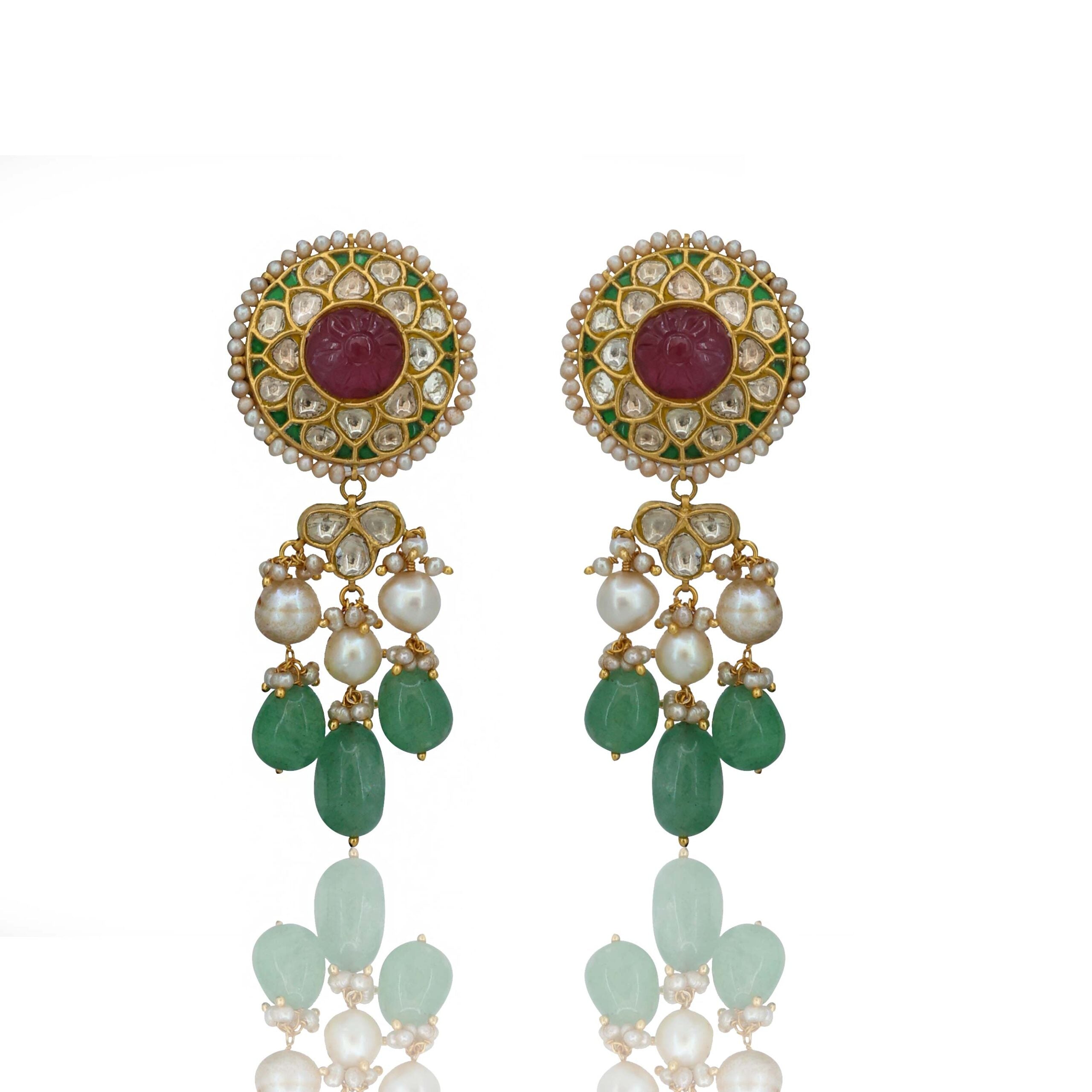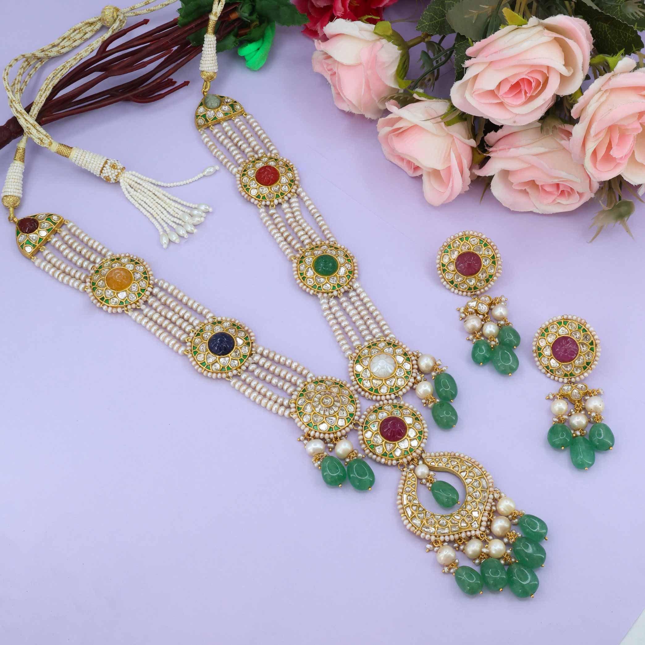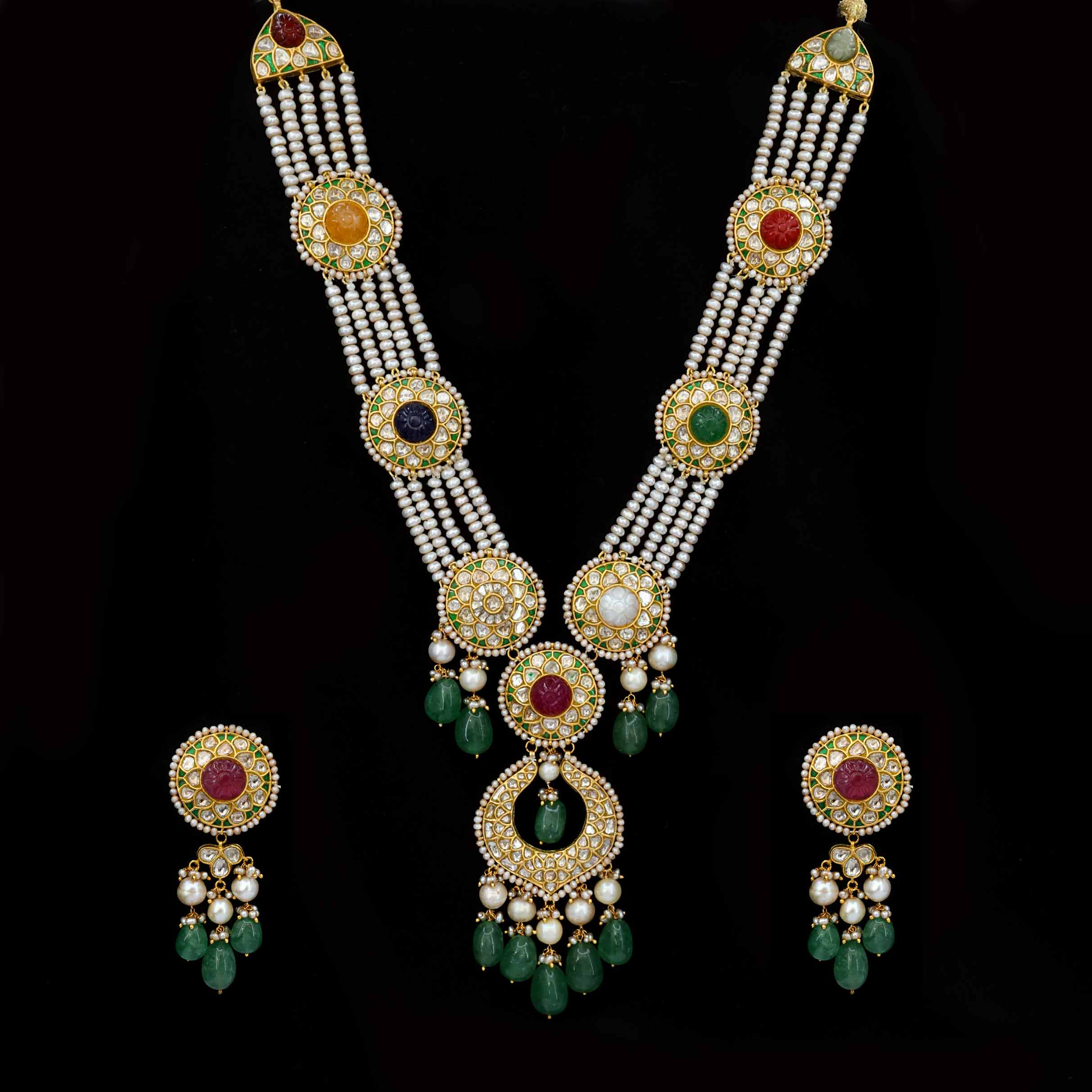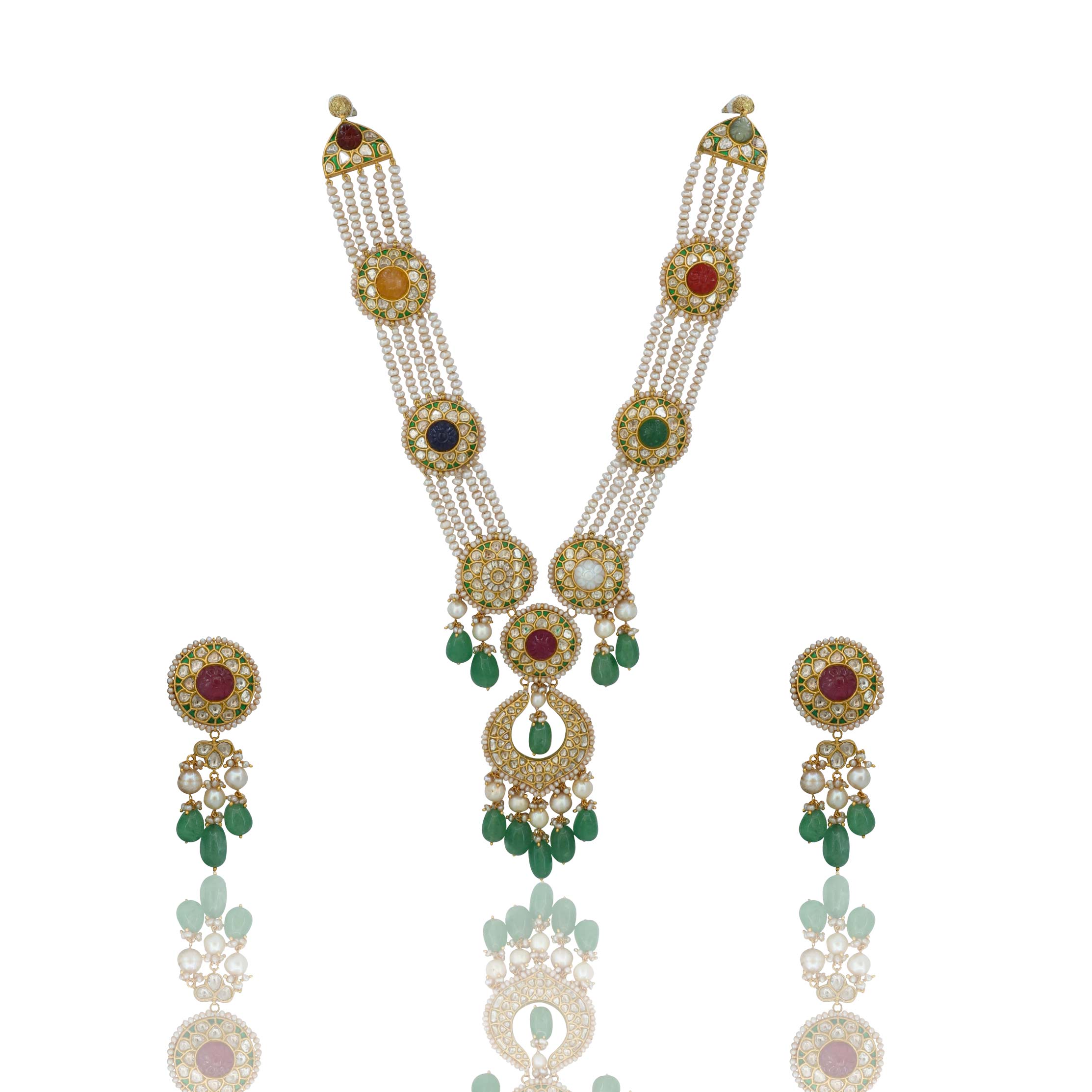 This elegant necklace set features exquisite Syndicate Polki diamonds, highlighting a central pendant and matching earrings. Adorned with Navratan gems and complemented by lush emerald drops, the design is both traditional and vibrant. It’s gracefully strung with multiple strands of natural pearls, creating a timeless and luxurious piece perfect for special occasions.