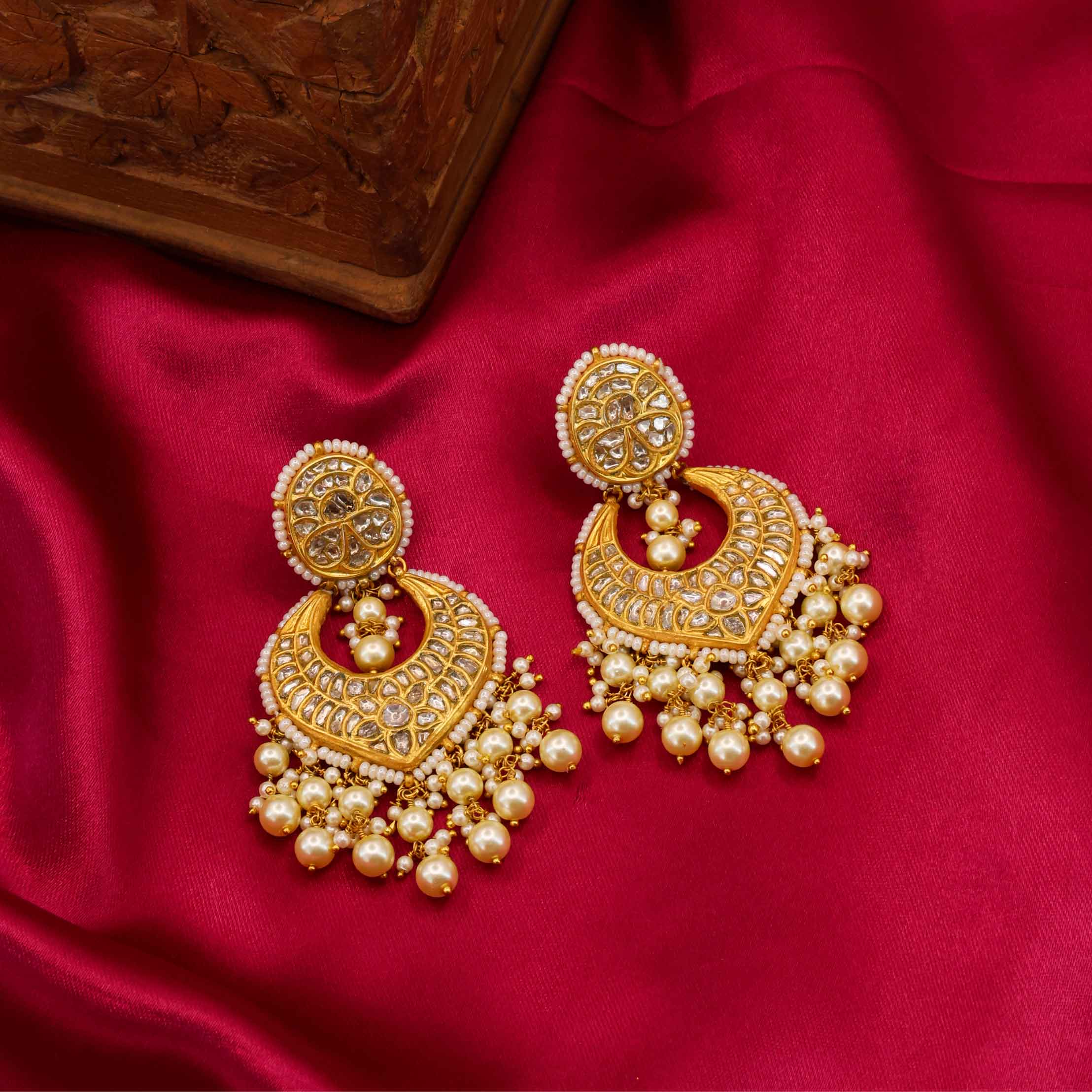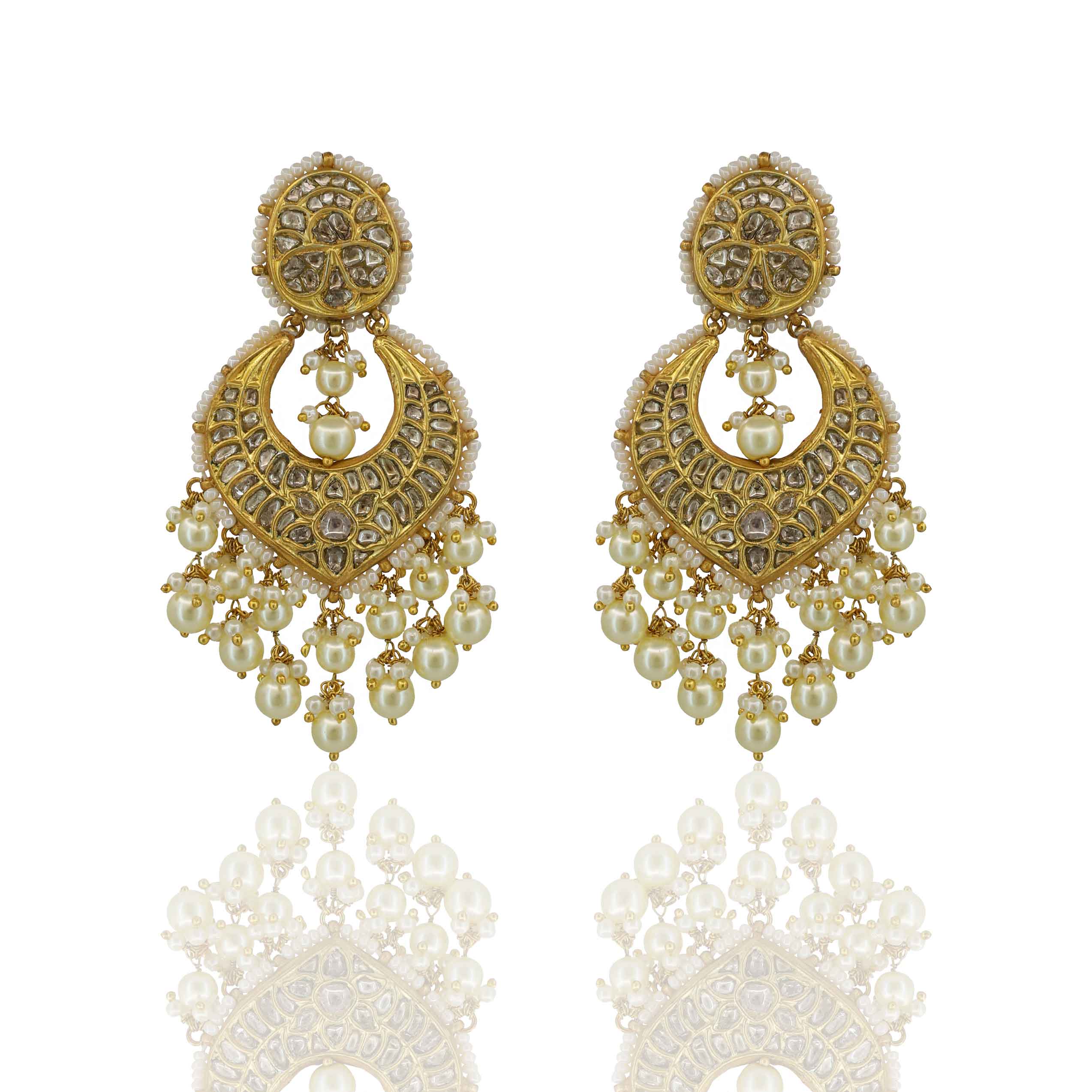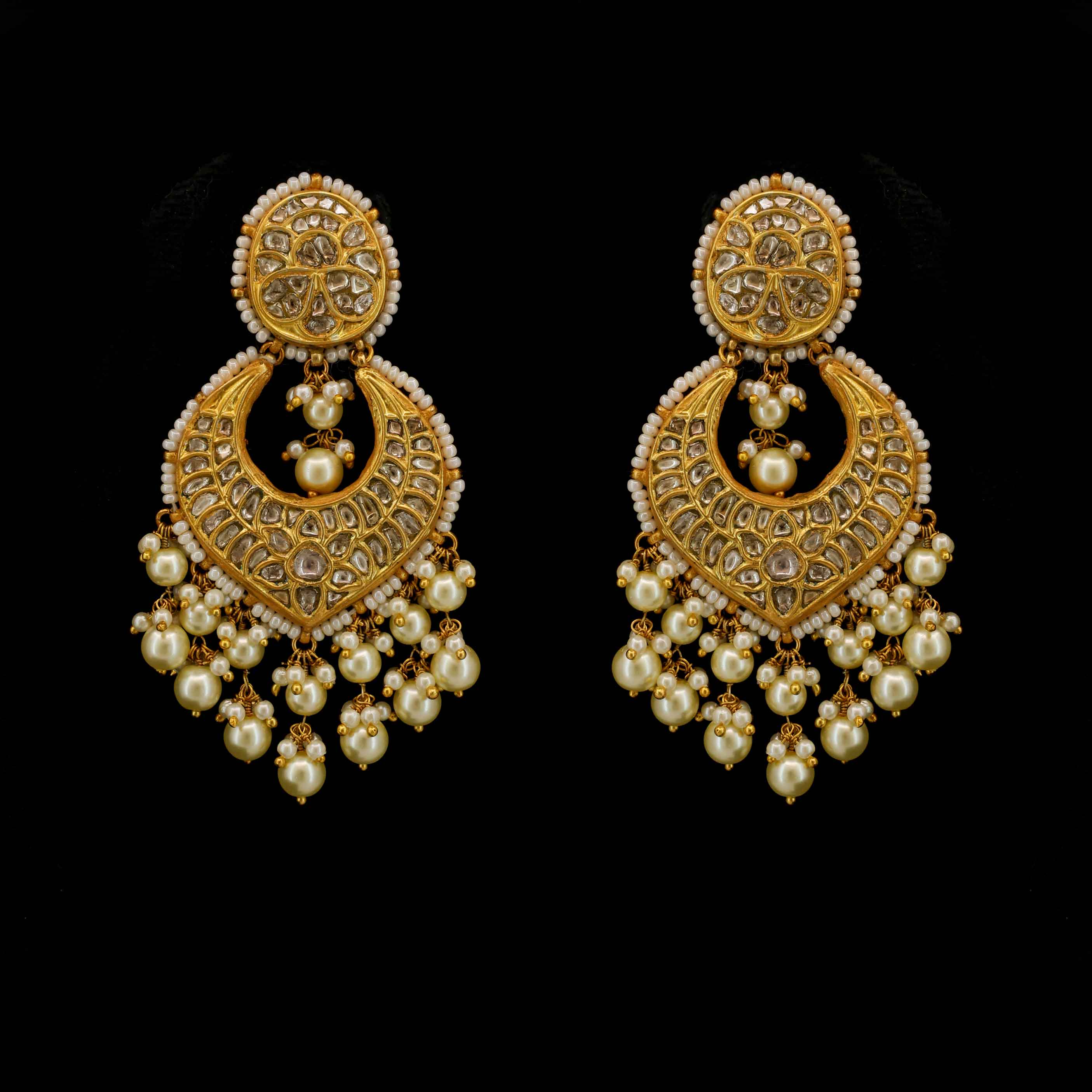 These stunning Gold Thappa Chandbaali Earrings are generously studded with Natural Syndicate Polki Diamonds. They feature an ornate, multi-layered design beautifully bordered and finished with delicate, cascading Pearl drops for a timeless, regal look.