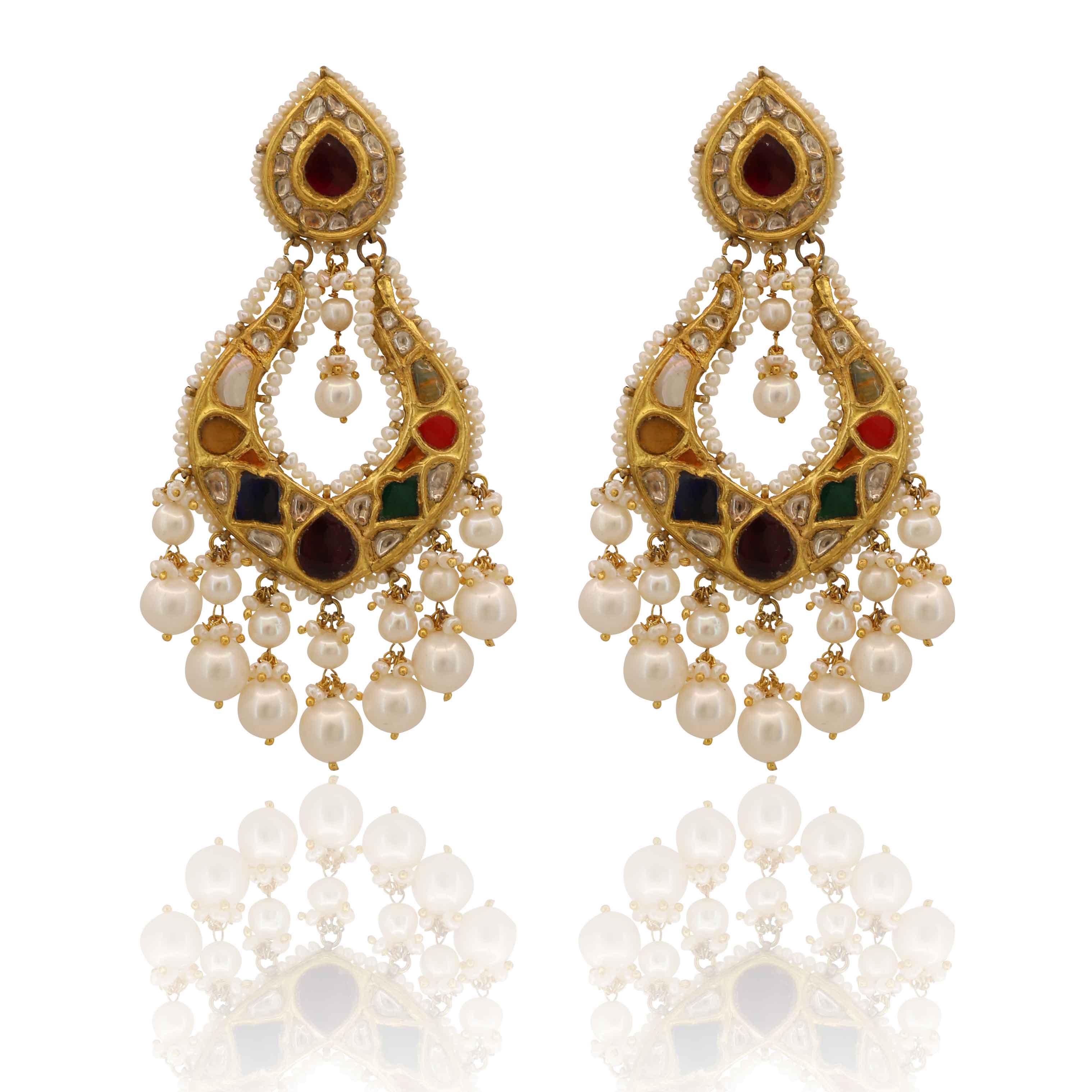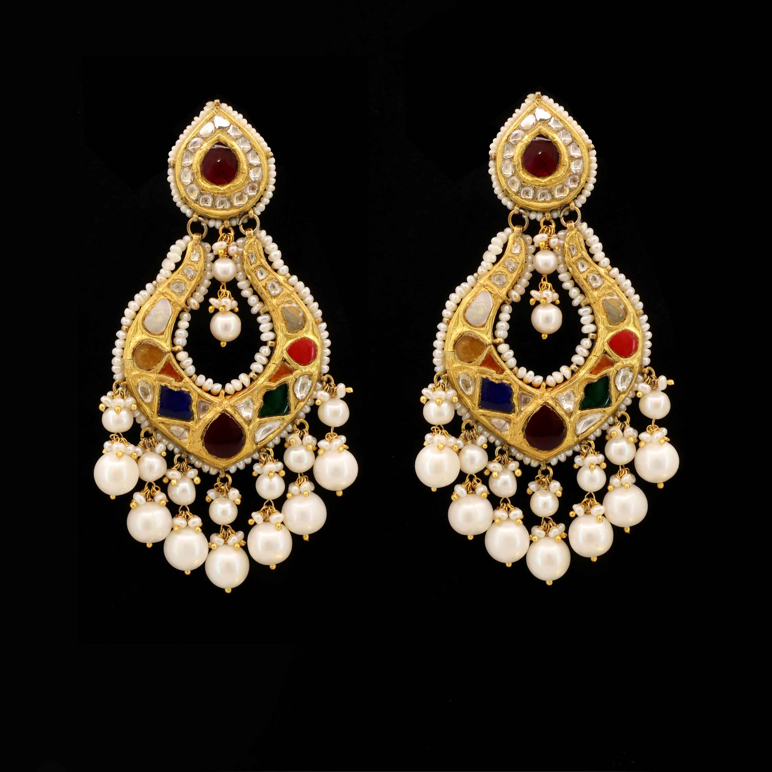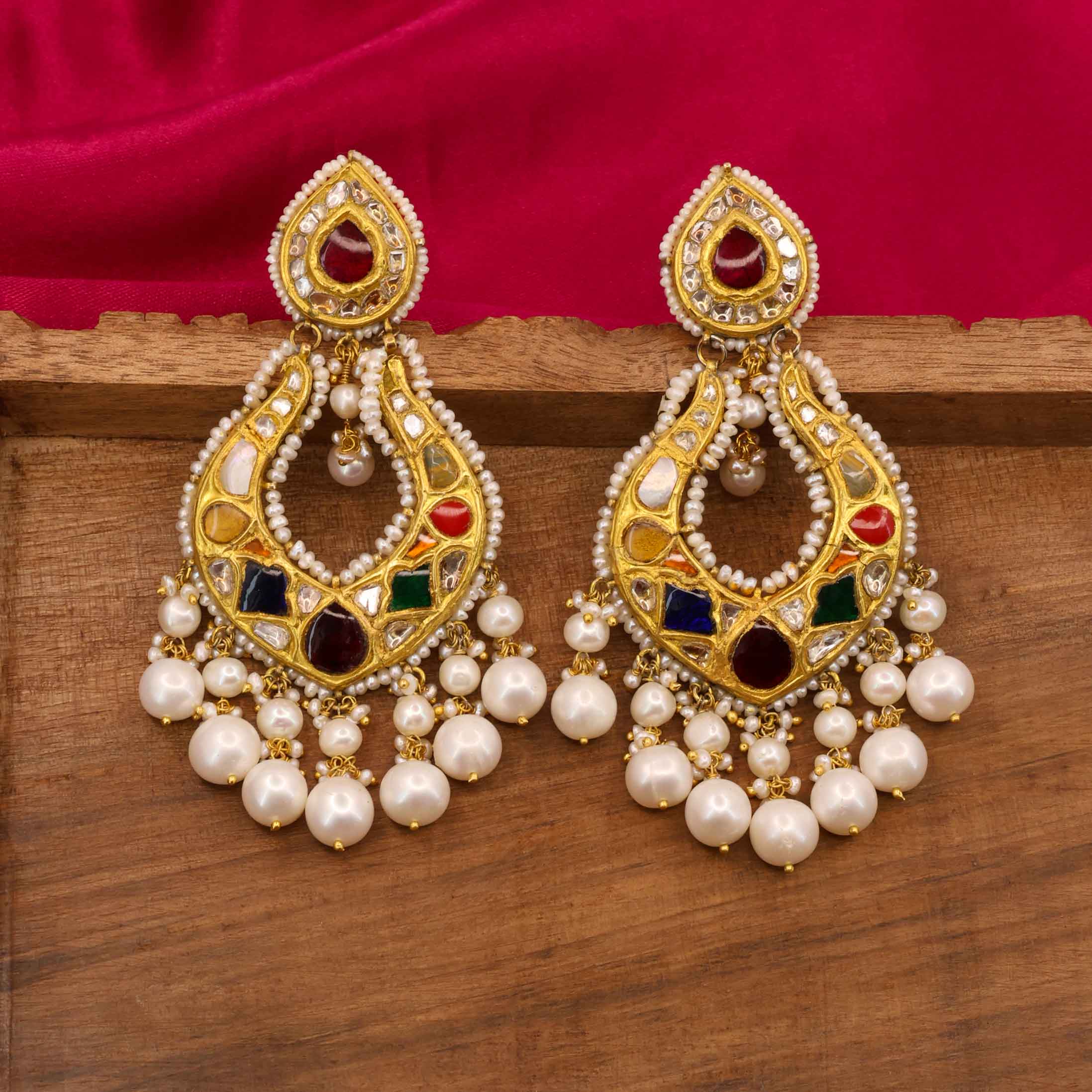 These gorgeous teardrop earrings beautifully capture the Navratna style, featuring multi-colored glass filling (or stones) framed by gold and subtle Polki diamonds. The traditional design is finished with a grand cluster of lustrous pearl drops, making this an opulent statement piece for any festive or bridal occasion.