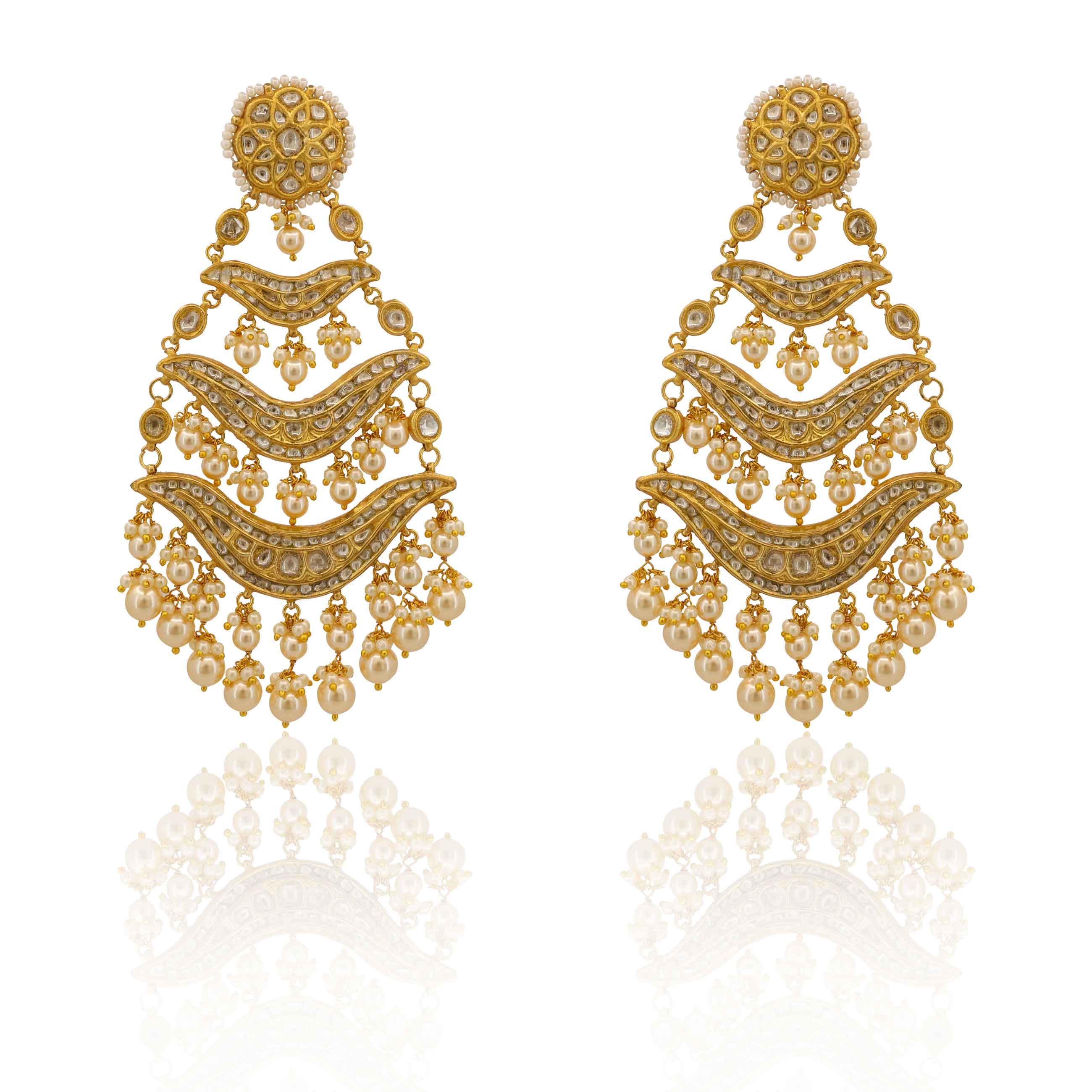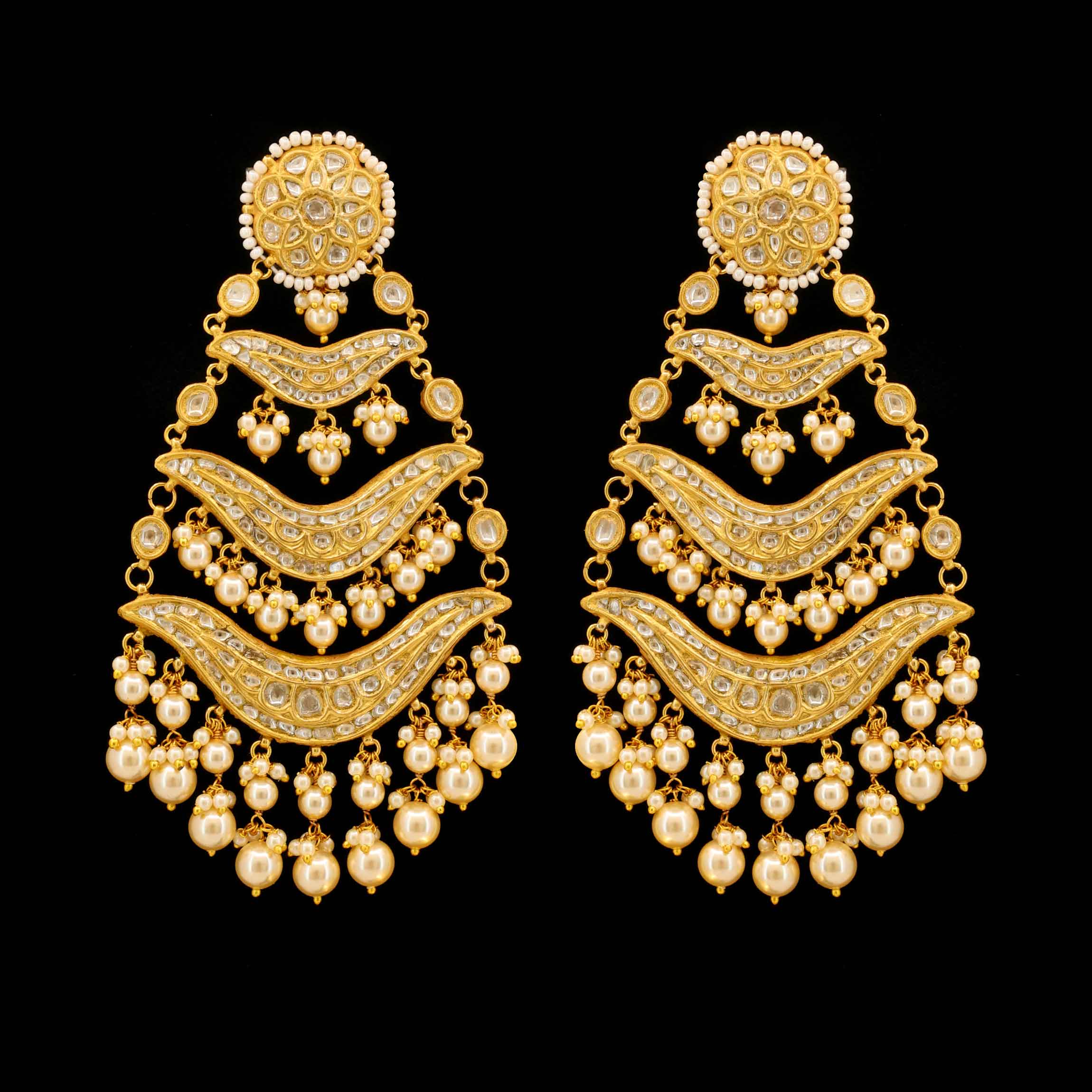 Royal Tiered Polki Diamond Chandbaali with Pearl Clusters. These spectacular long earrings feature four cascading layers set with brilliant natural Polki diamonds. Handcrafted in gold, the design is completed with abundant strings and clusters of creamy pearls, creating a luxurious and heirloom-worthy statement piece.