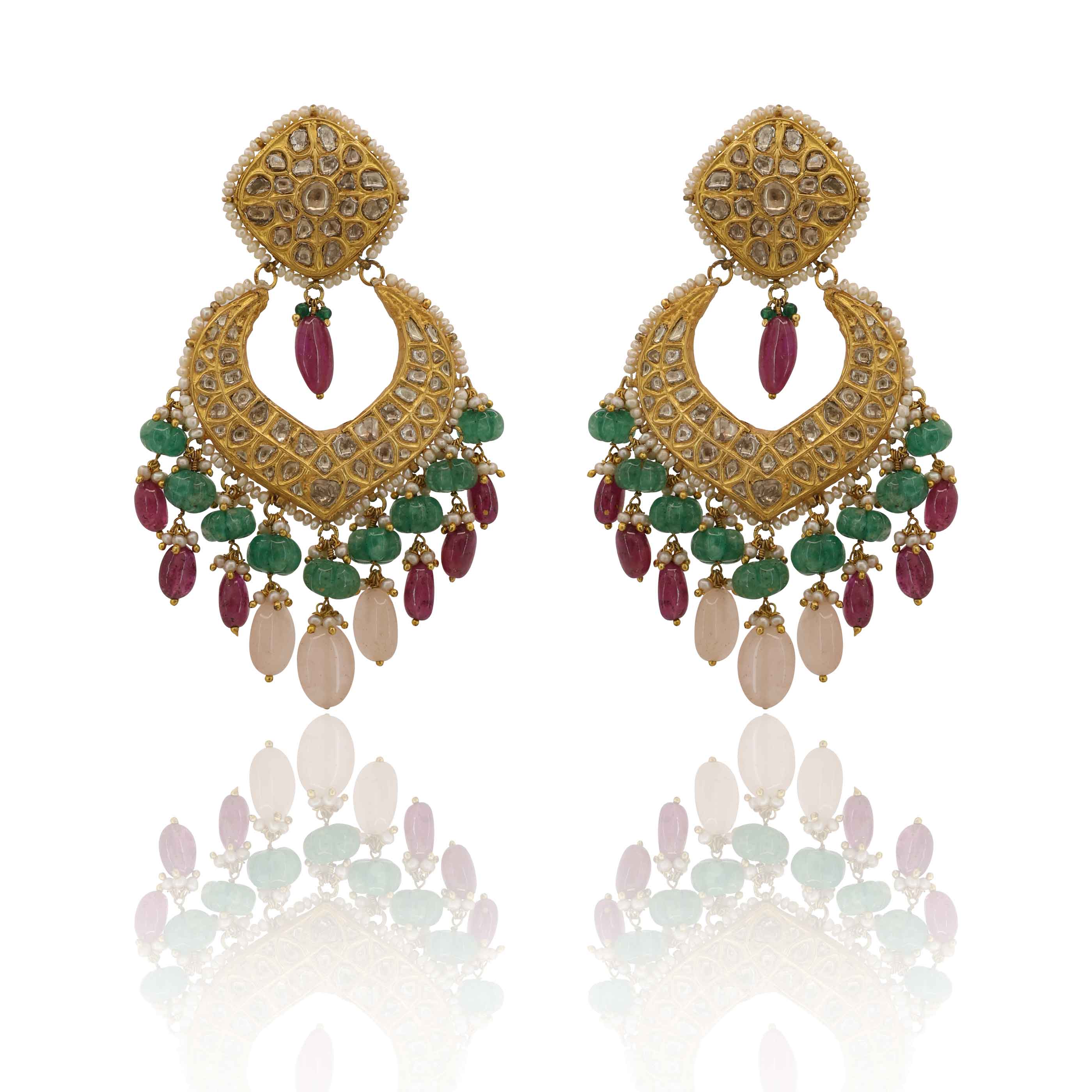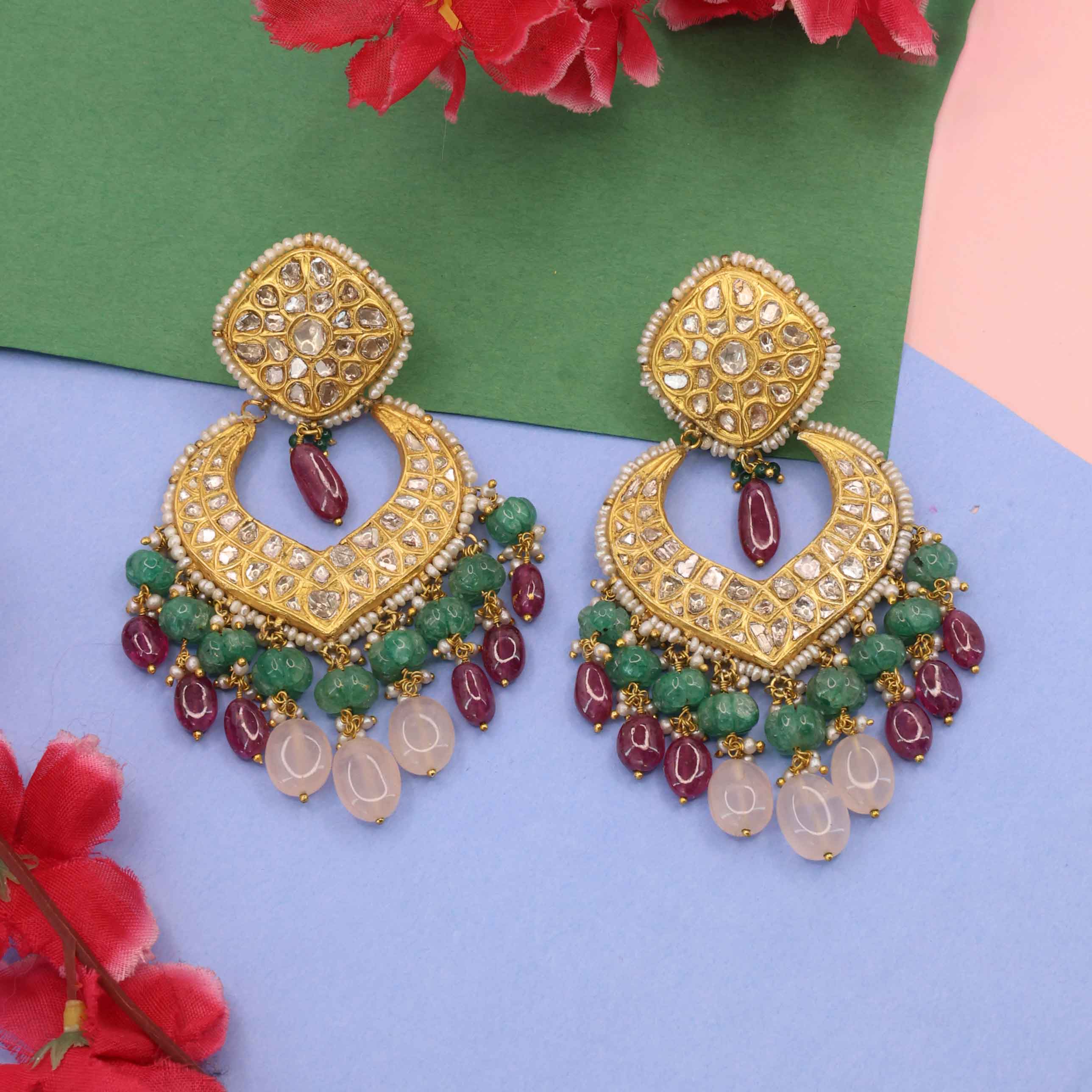Stunning Polki diamond Chandbalis crafted in gold. A mesmerizing mix of ruby, emerald, and rose quartz glass-filled gemstone strings creates a vibrant, multi-hued drop, embodying Mughal elegance.