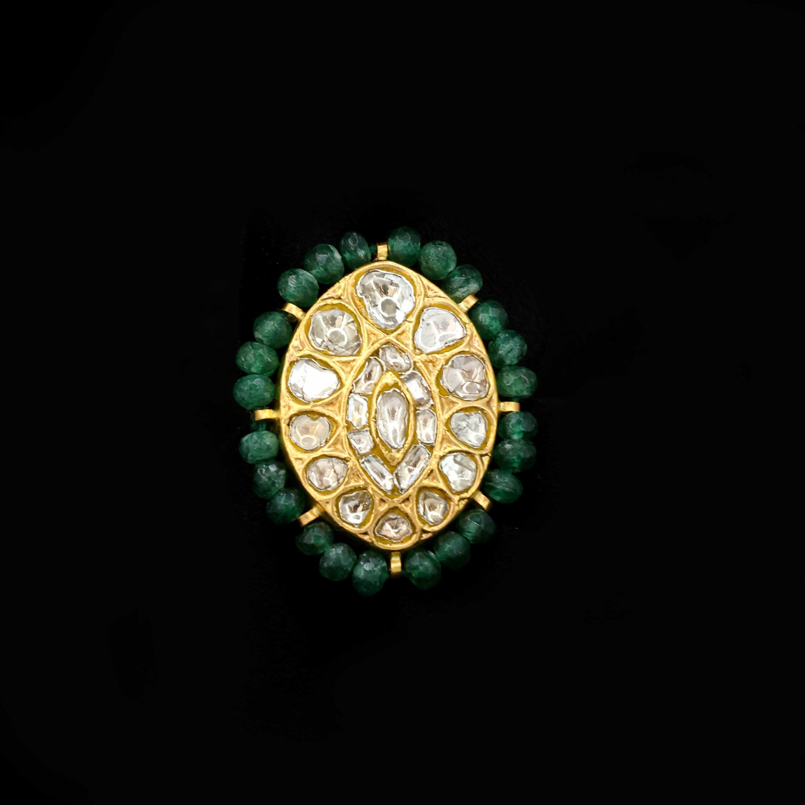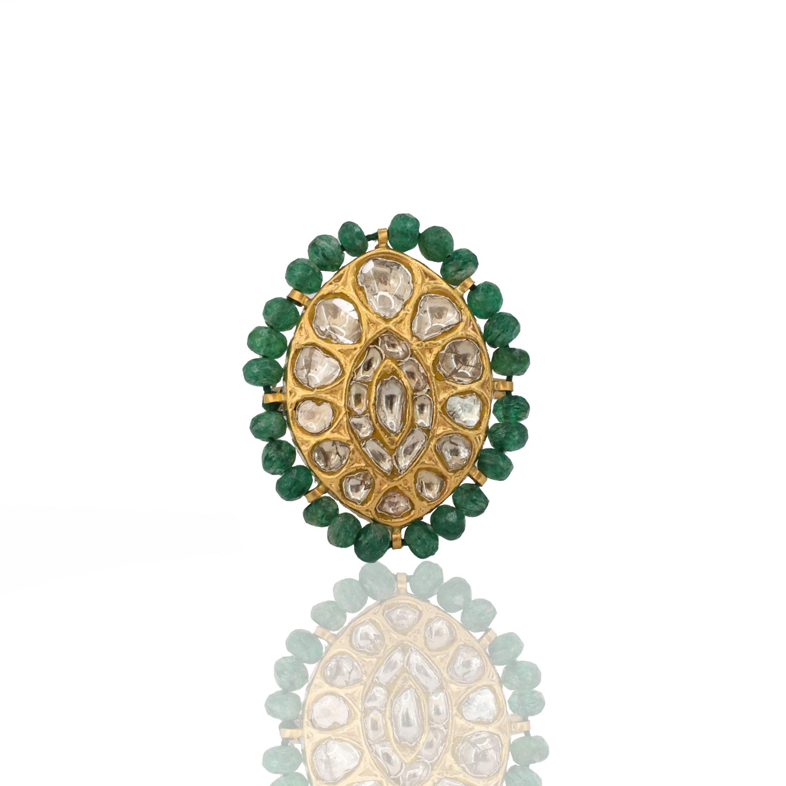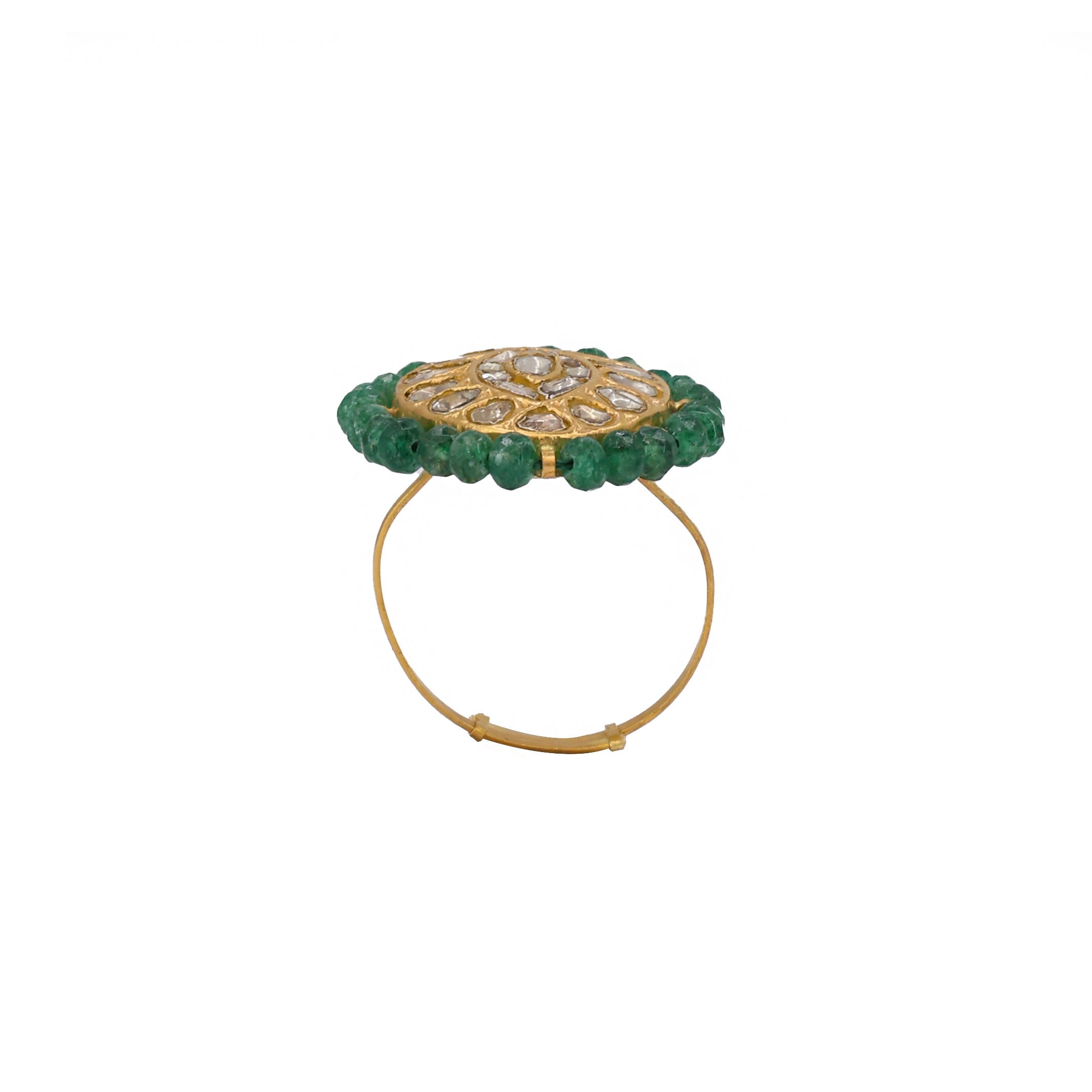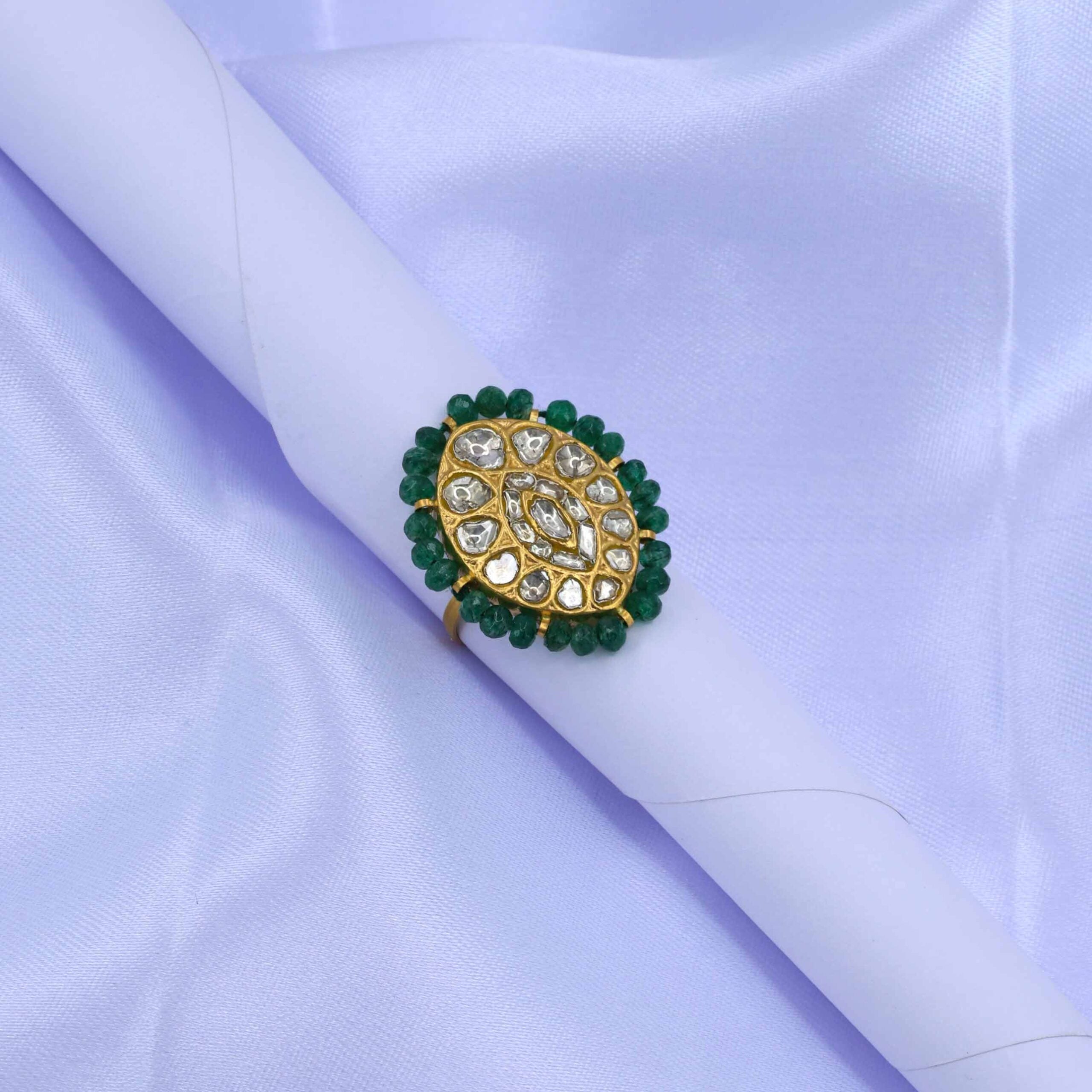 This exquisite gold ring showcases a captivating cluster of uncut polki diamonds, meticulously set to highlight their natural brilliance. It’s elegantly framed by a vibrant string of faceted green emeralds, adding a rich splash of color and traditional charm. A perfect blend of heritage and allure.