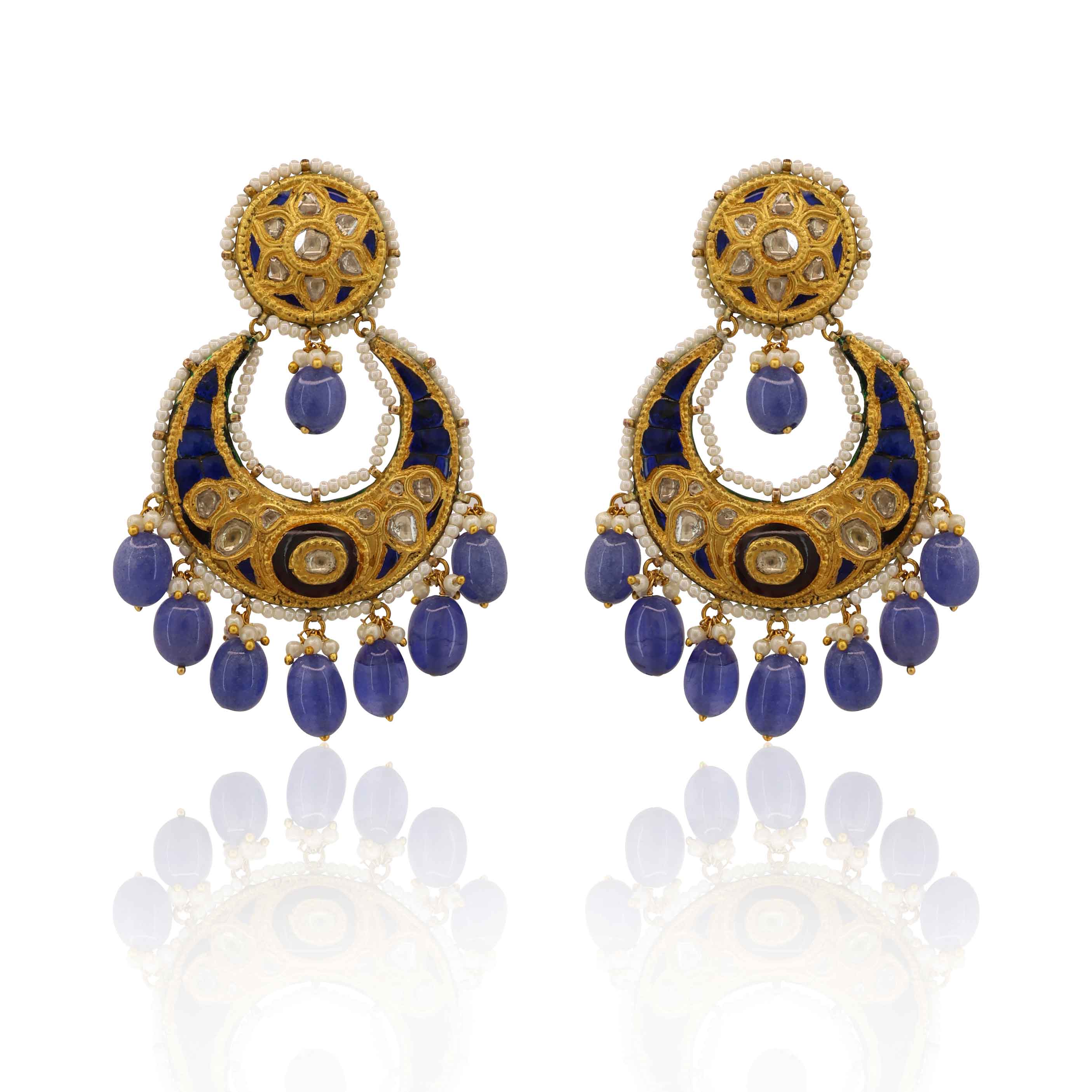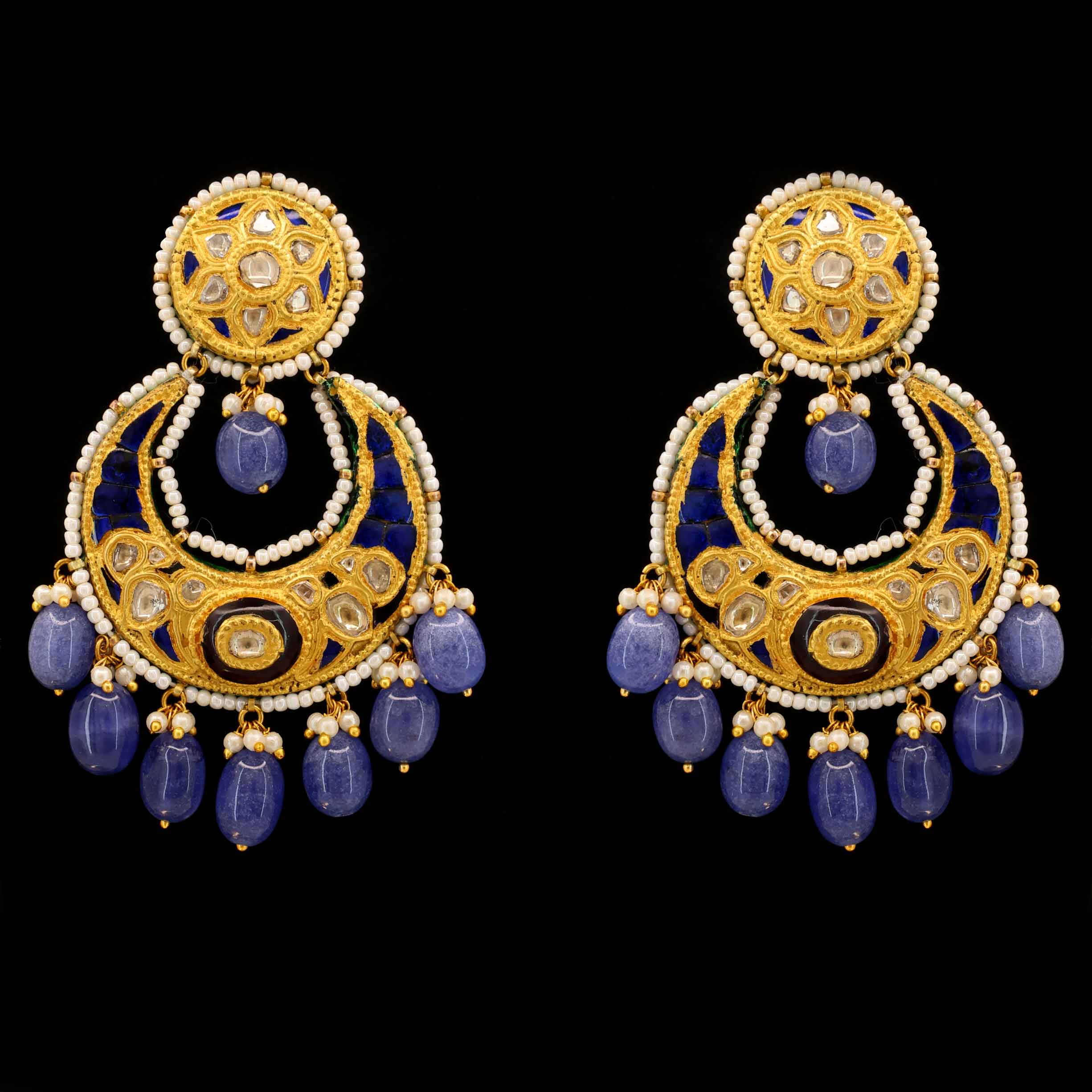 These regal Chandbali earrings are framed by deep blue Stone, setting off the natural Polki diamonds. The crescent shape is further adorned with elegant Tanzanite stone drops and subtle pearl accents. This luxurious statement piece beautifully captures the grandeur of traditional Indian jewelry.