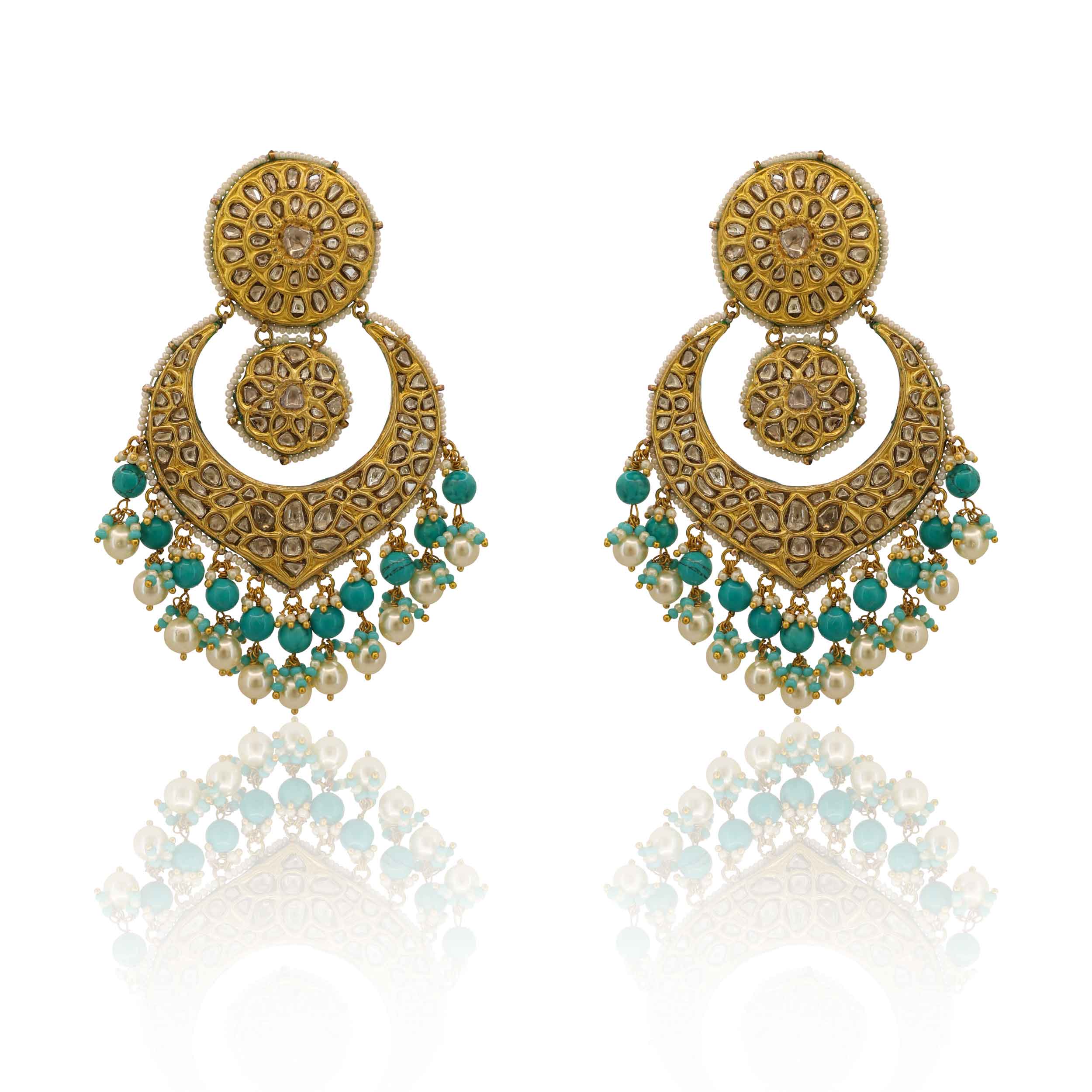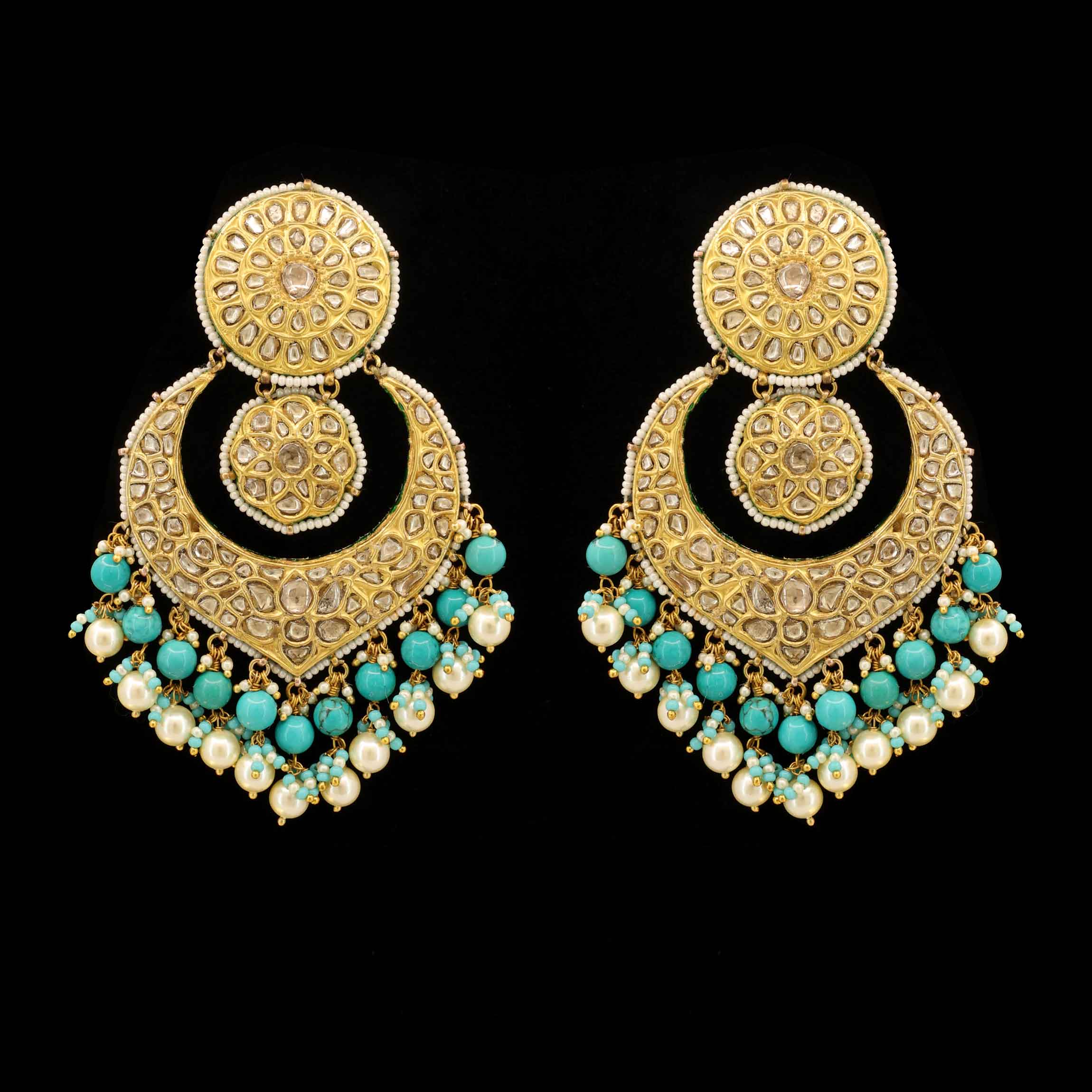 These gorgeous Chandbali earrings feature natural Polki diamonds set in an intricate gold finish. The classic crescent is beautifully complemented by a vibrant cluster of turquoise beads and lustrous pearl drops. This eye-catching statement piece perfectly blends traditional Kundan style artistry with a fresh pop of color.