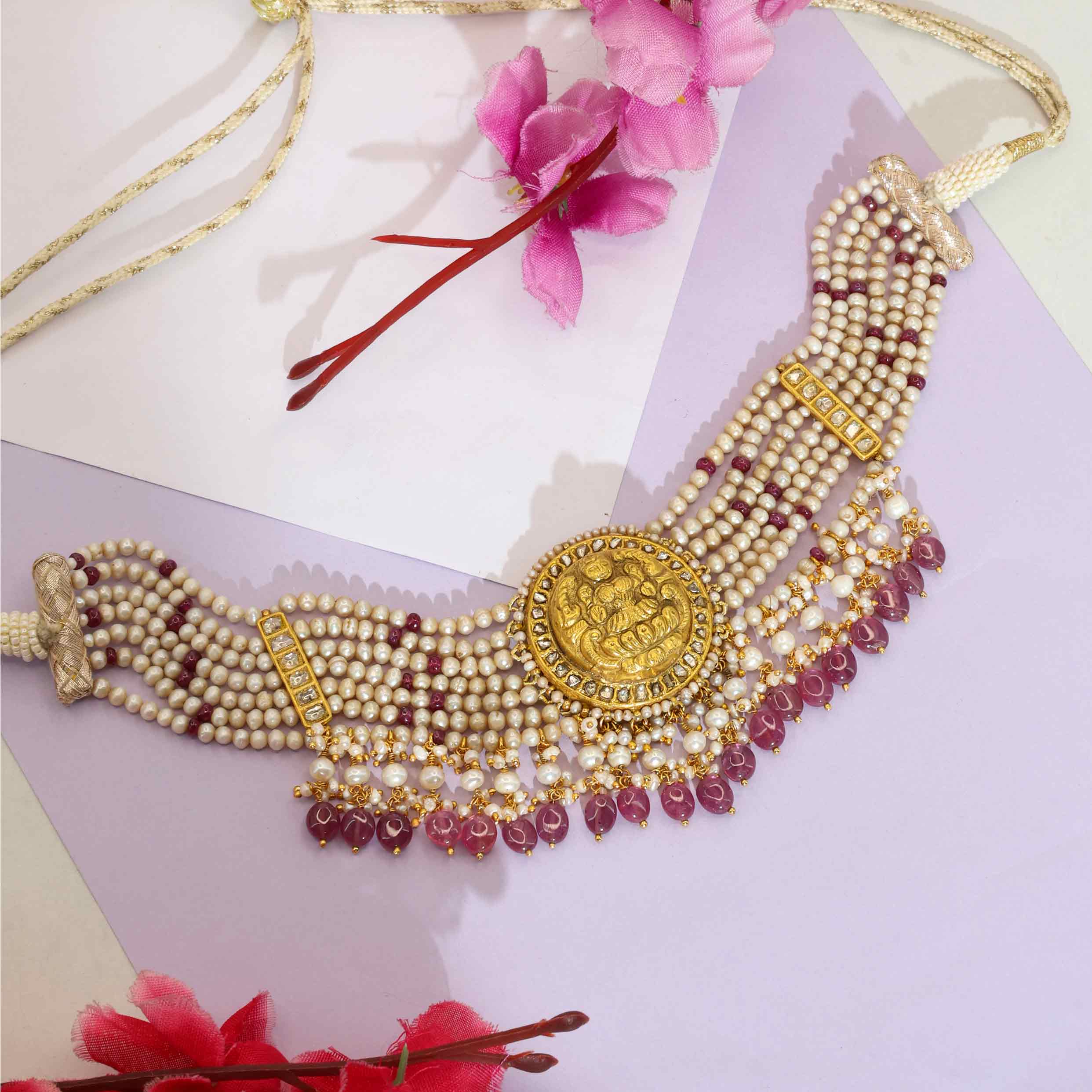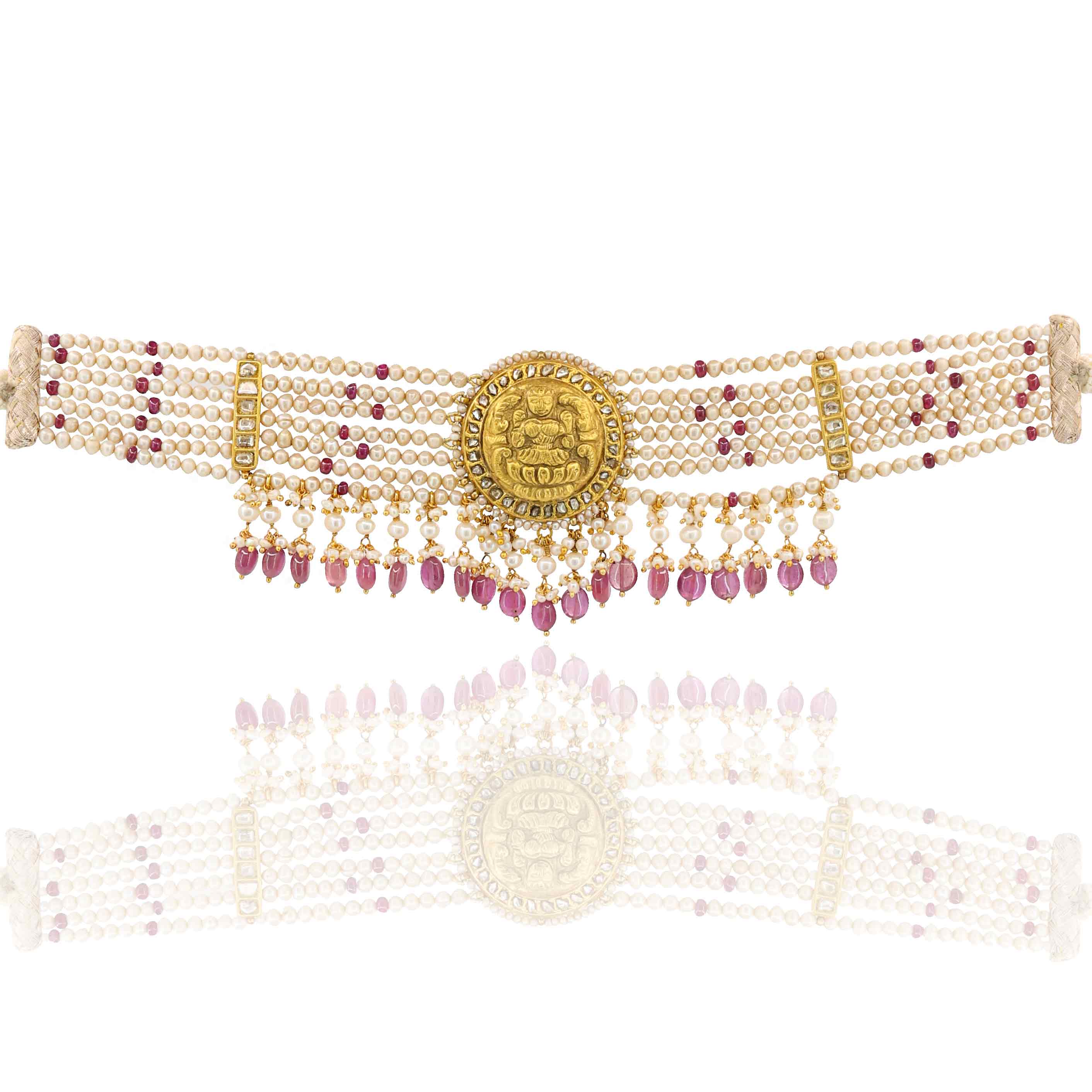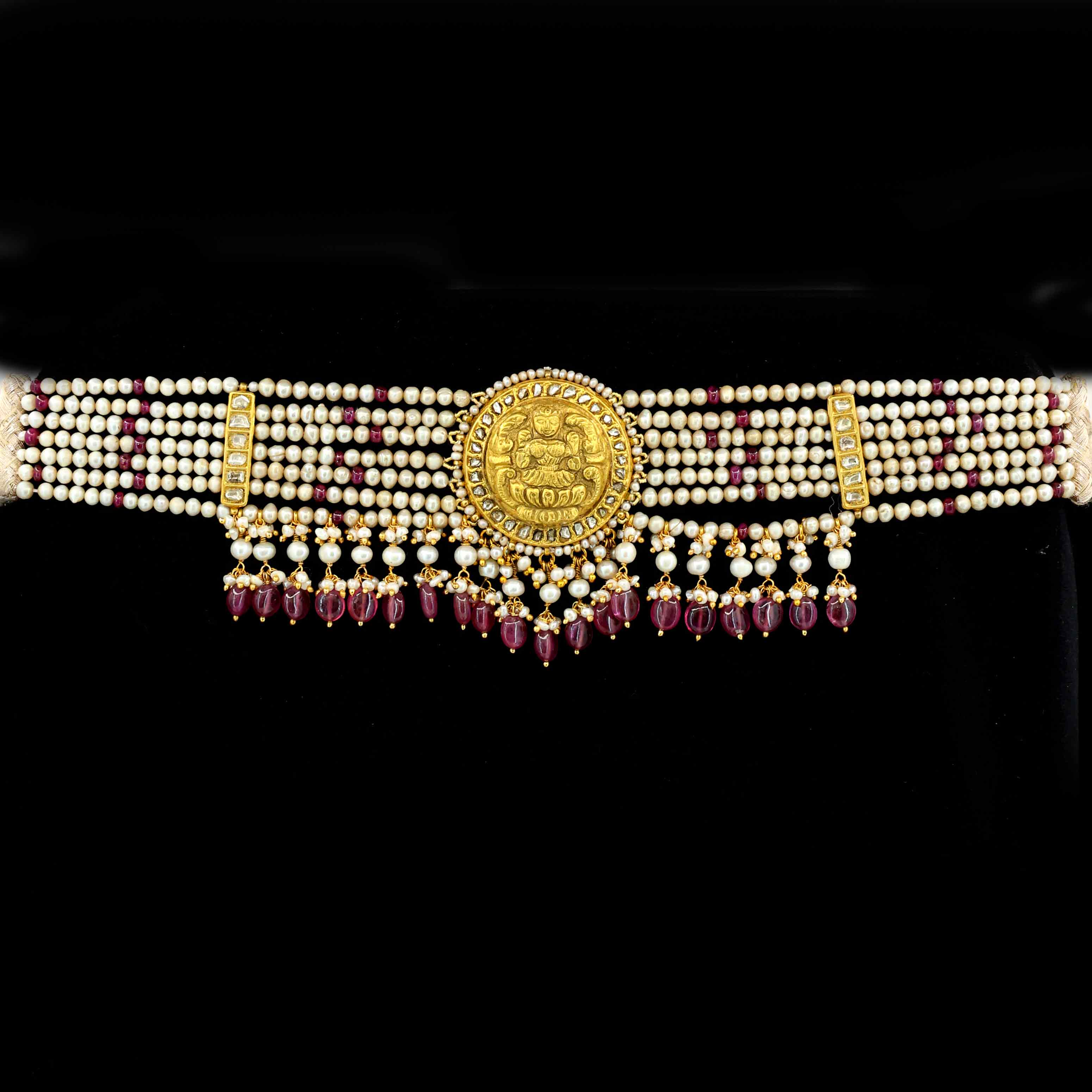 This stunning choker necklace features a gold centerpiece with a raised depiction of Goddess Lakshmi. The piece is set with natural polki diamonds and features multiple strands of lustrous pearls accented by glass-filled rubies.