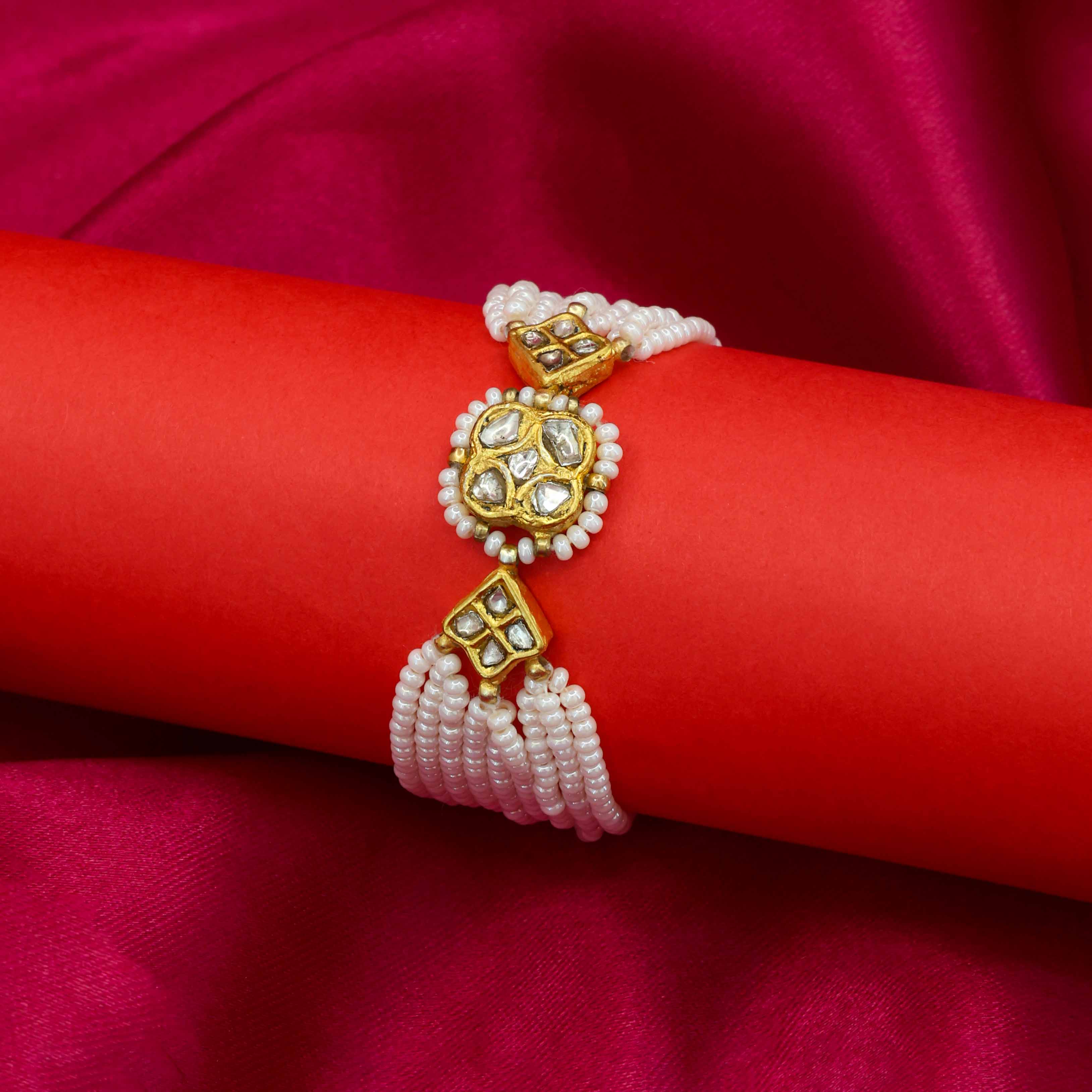 This bracelet features a series of three connected gold plaques, each showcasing **natural syndicate Polki diamonds**. The central plaque has a floral or sunburst design, while the two side plaques are a diamond shape. Each section is outlined with small, delicate pearls, and the entire piece is strung together on multiple strands of creamy white pearls, giving it a classic and luxurious feel.