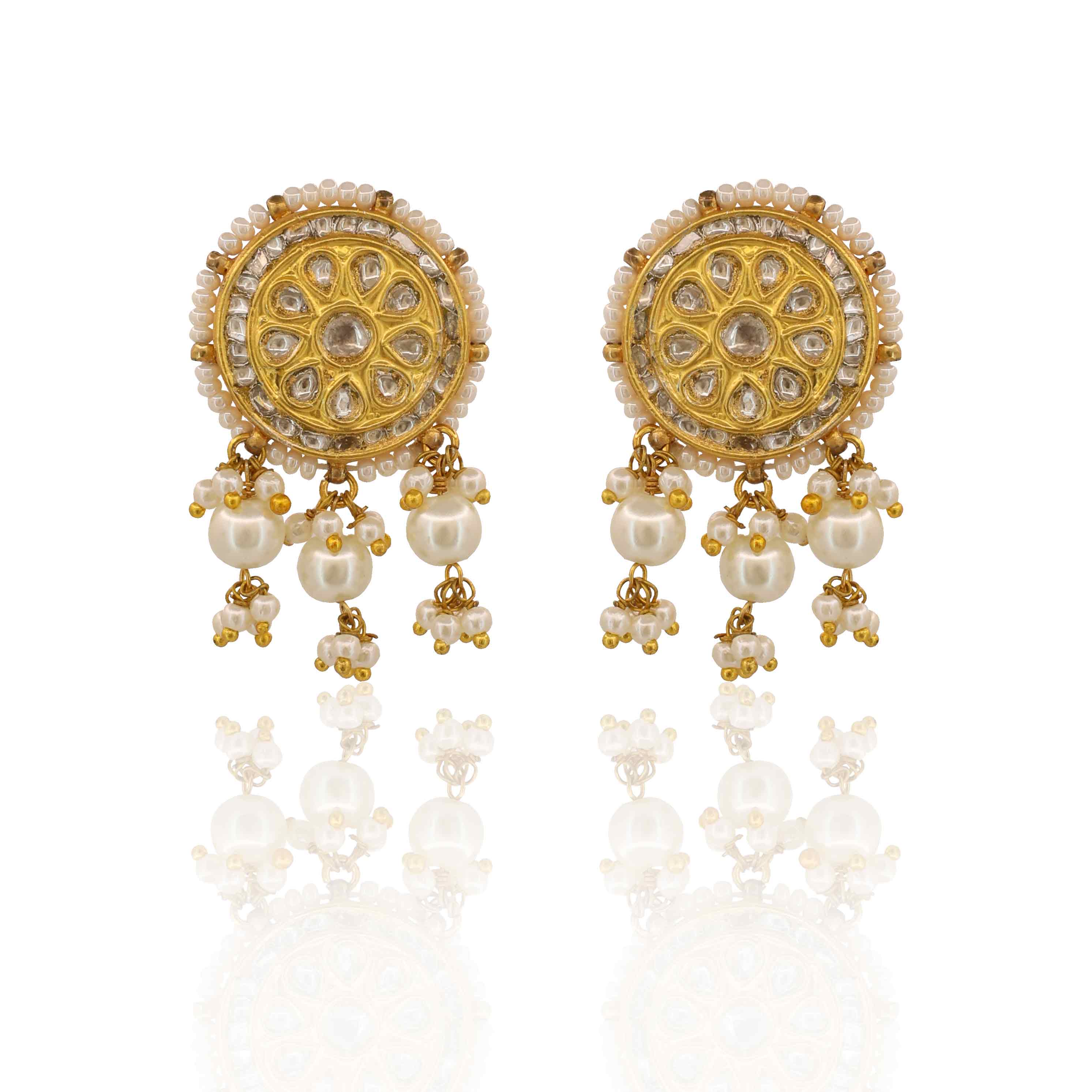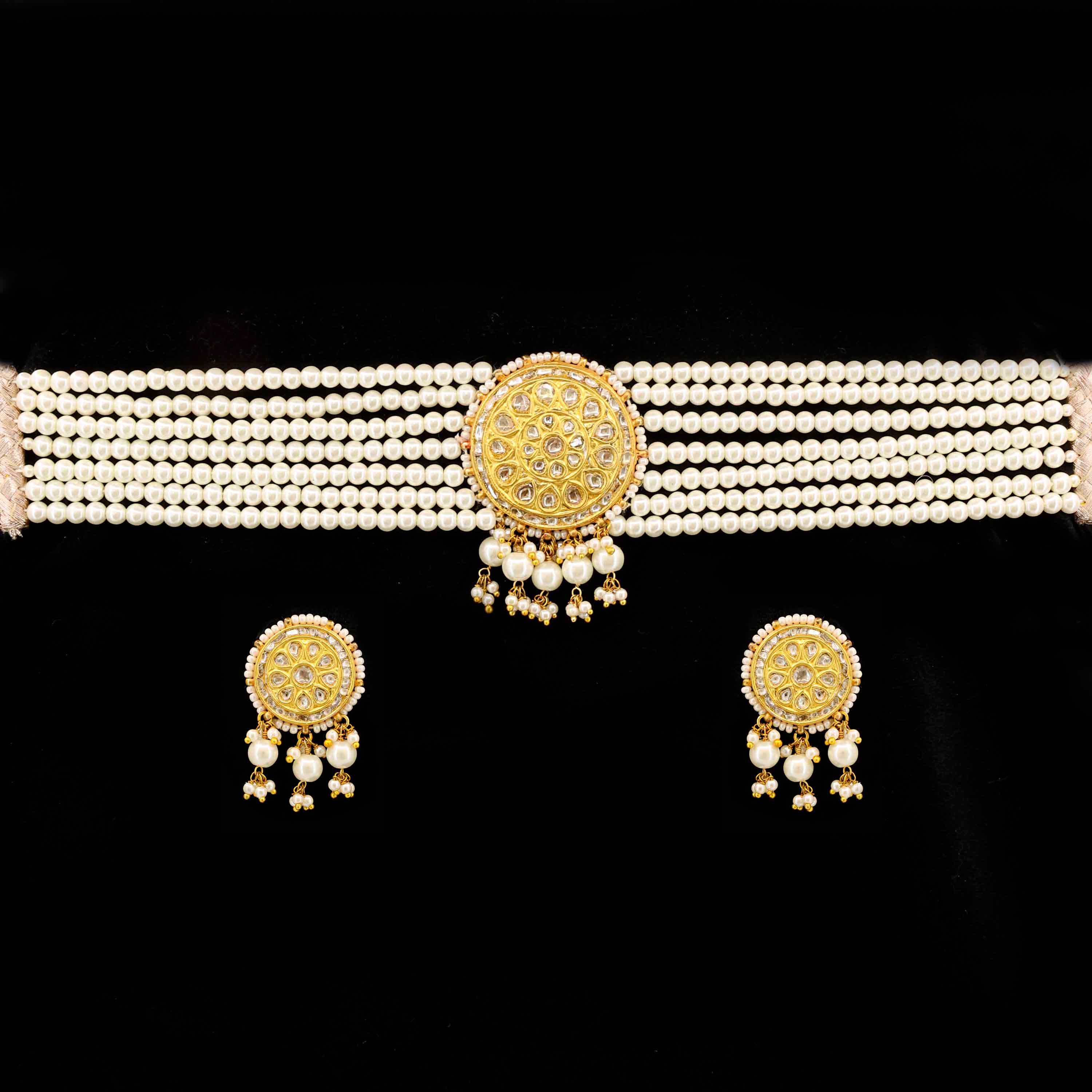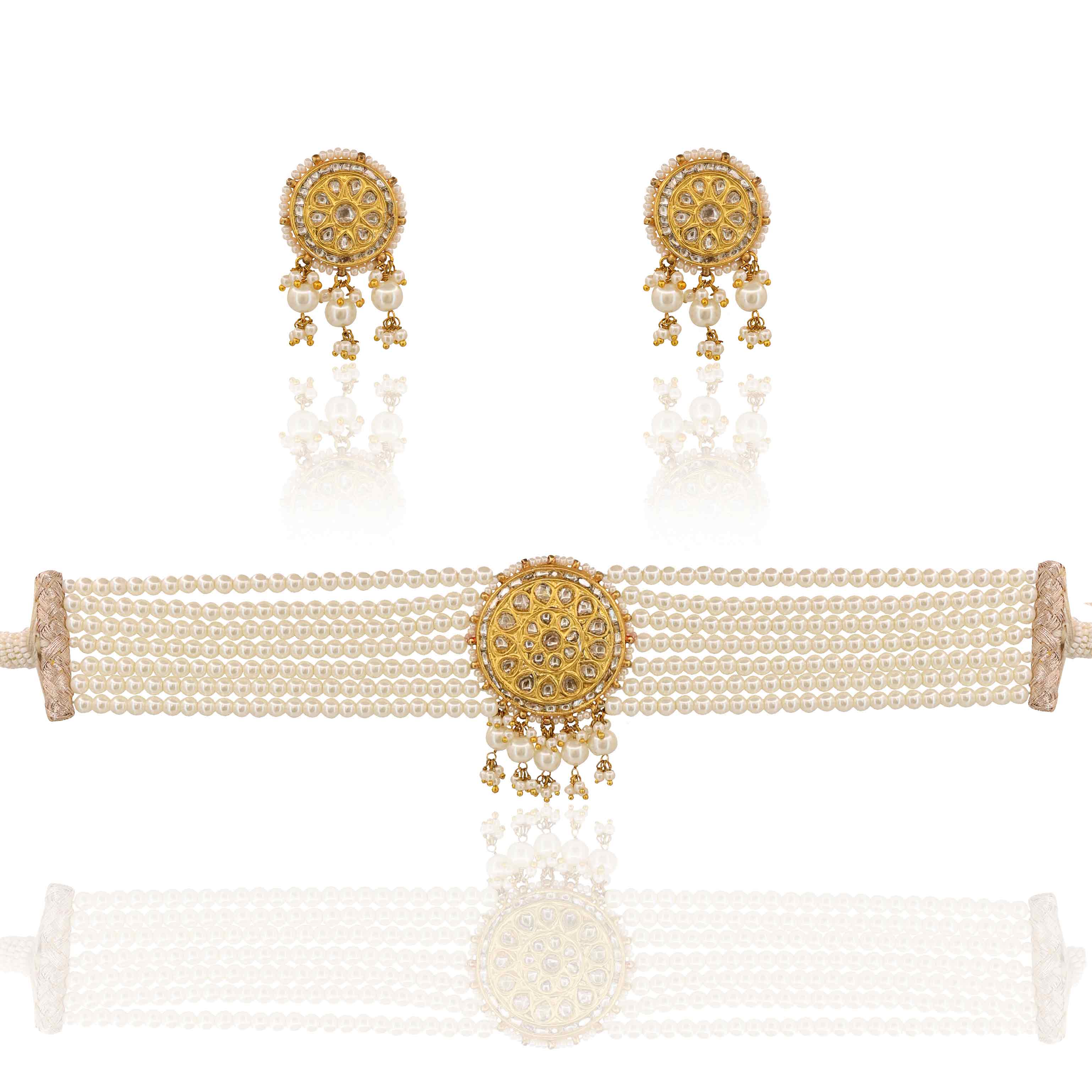This classicgold choker setfeatures multiple strands of delicatepearlsforming the band. The centerpiece is a circular medallion studded with brilliantNatural Polki Diamonds. Matching earrings complete this elegant, timeless ensemble, finished with subtle pearl drops.