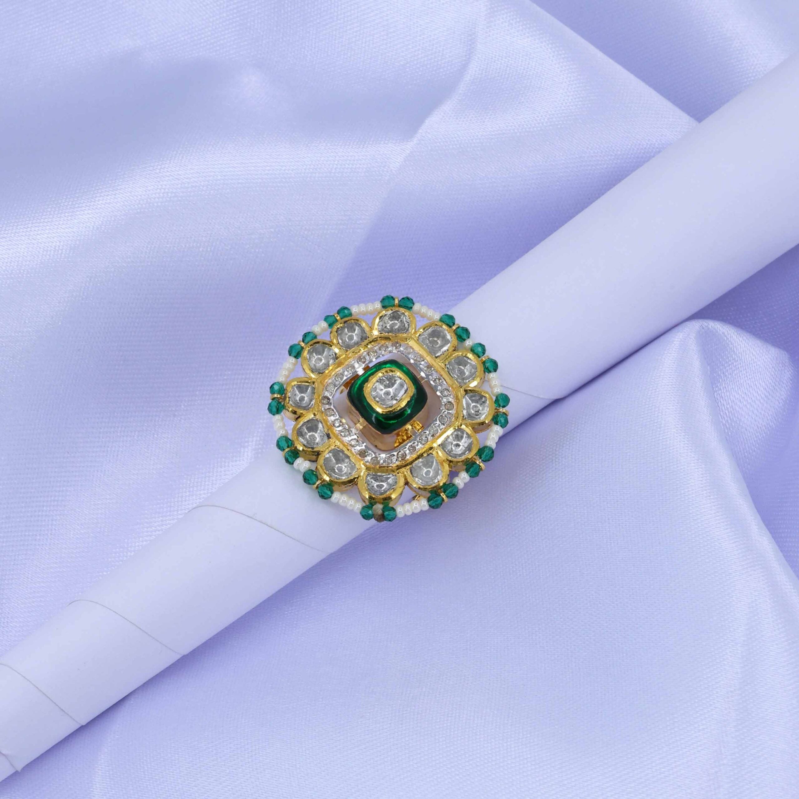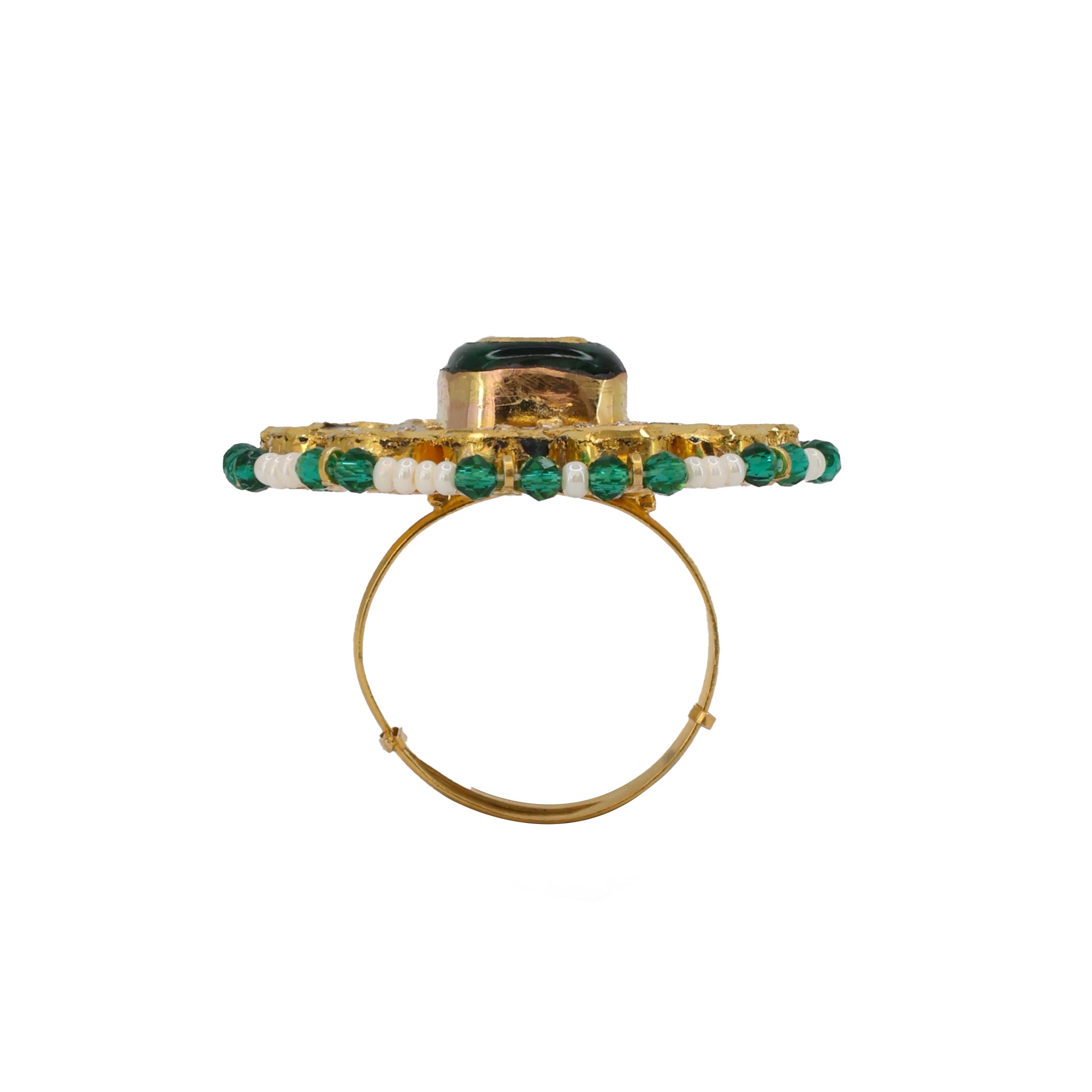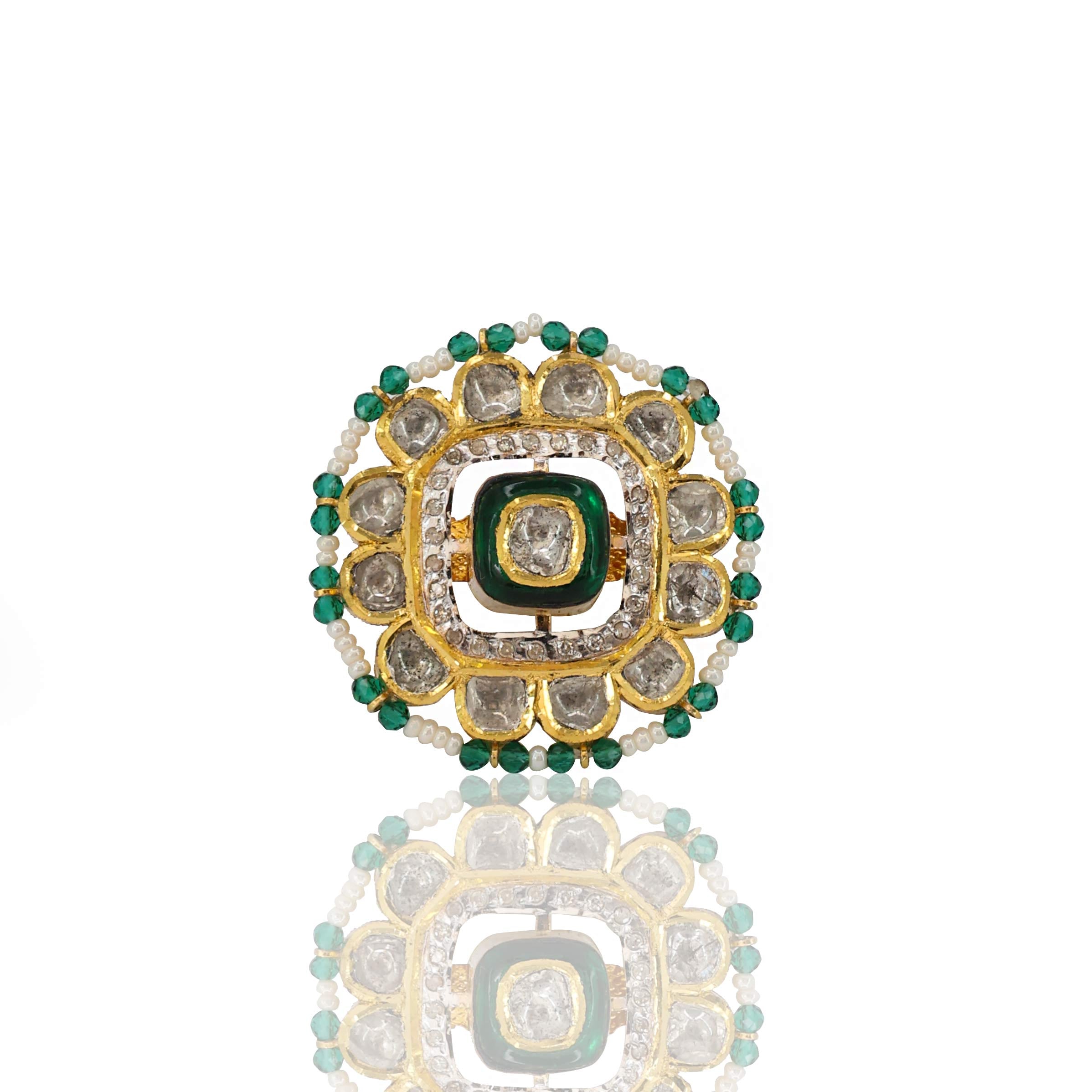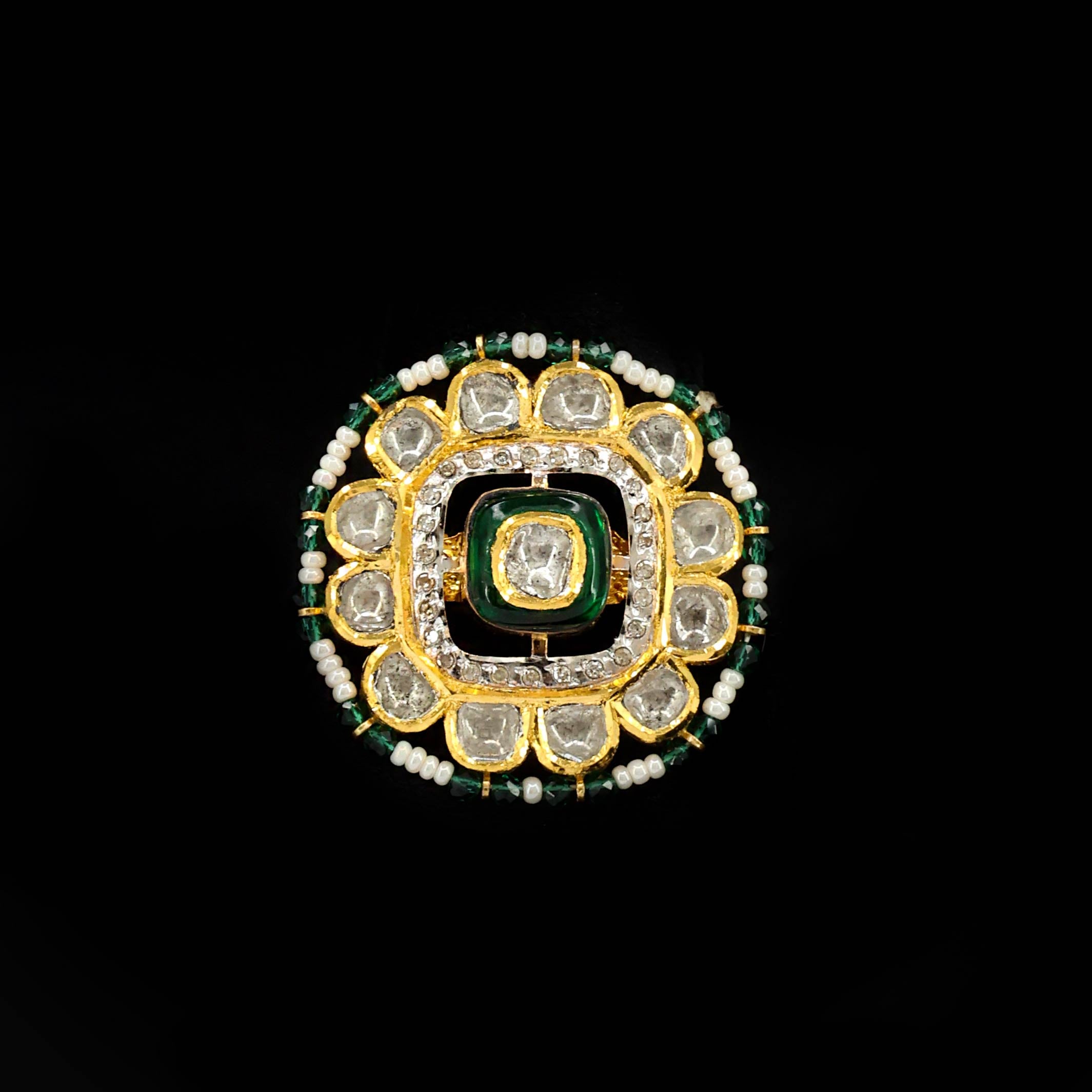 This stunning gold ring, hailing from Jaipur’s rich tradition, features a captivating central emerald-hued glass-filled polki, encircled by dazzling uncut diamonds. Its outer border is delicately strung with lustrous pearls and vibrant green beads, creating a regal and intricate design.