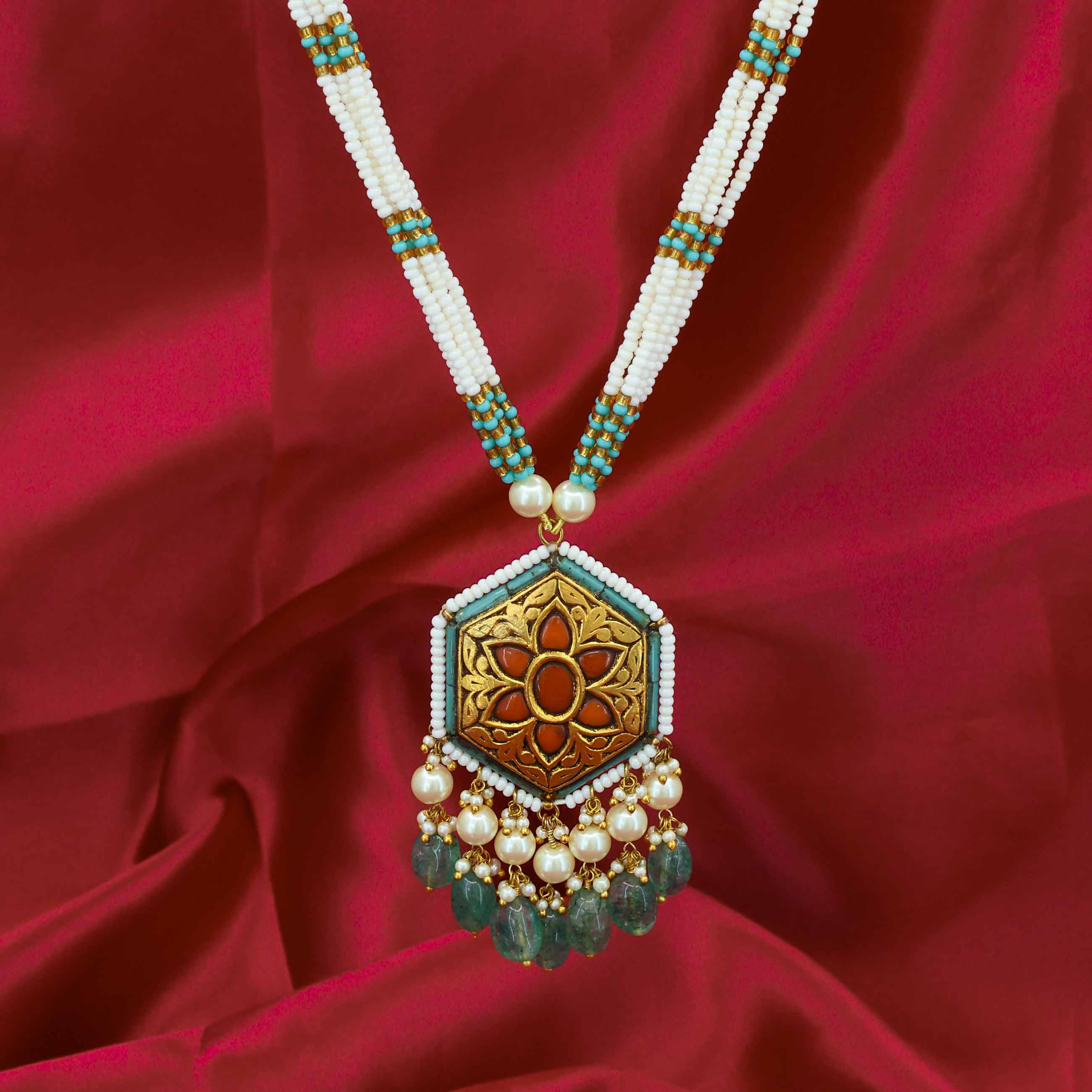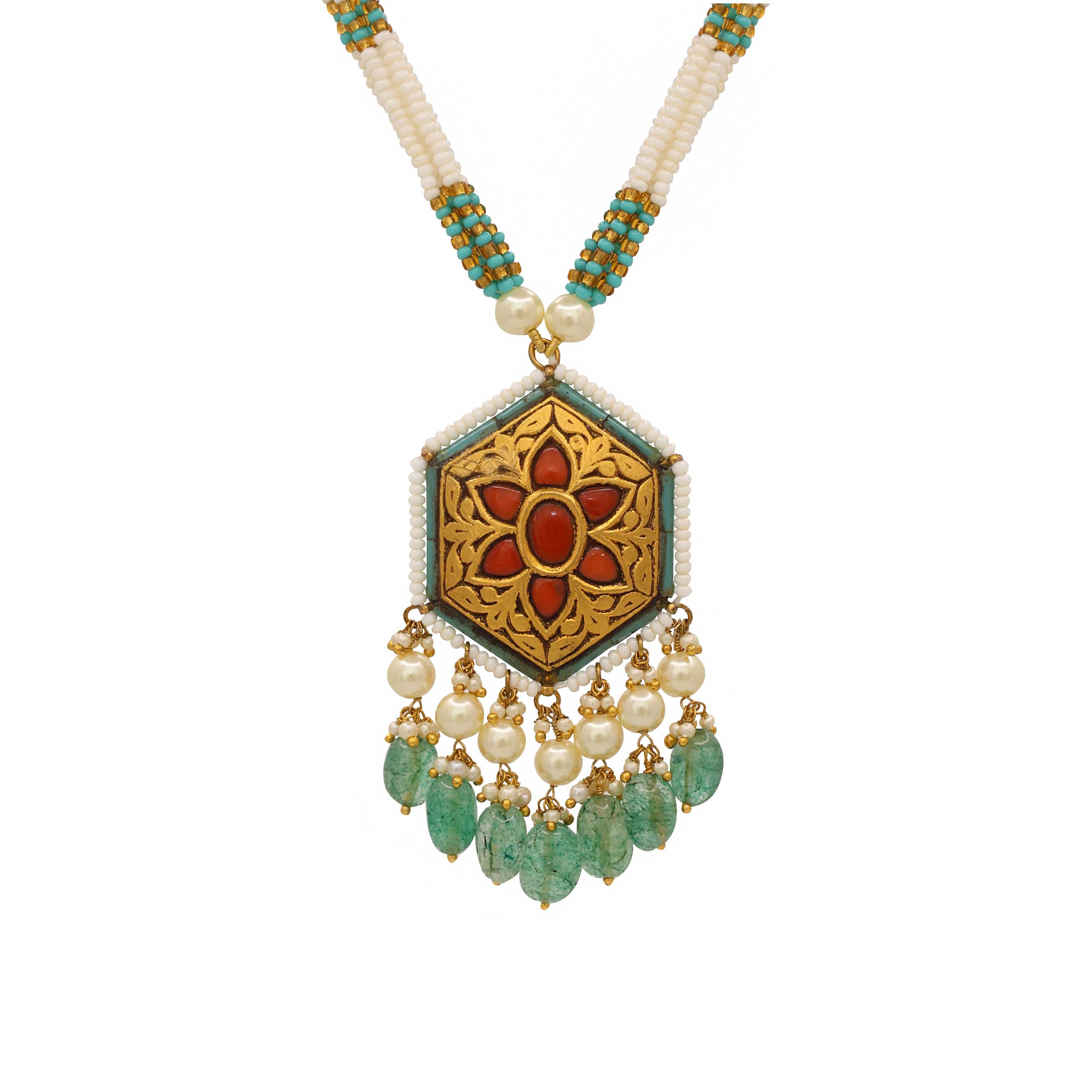 This striking hexagonal gold pendant is a beautiful blend of tradition and color. It's intricately detailed with a central coral flower, framed by a delicate turquoise and gold border. The pendant hangs from a string of pearls and turquoise beads, with drops of pearl and emerald stones creating a graceful, luxurious finish.