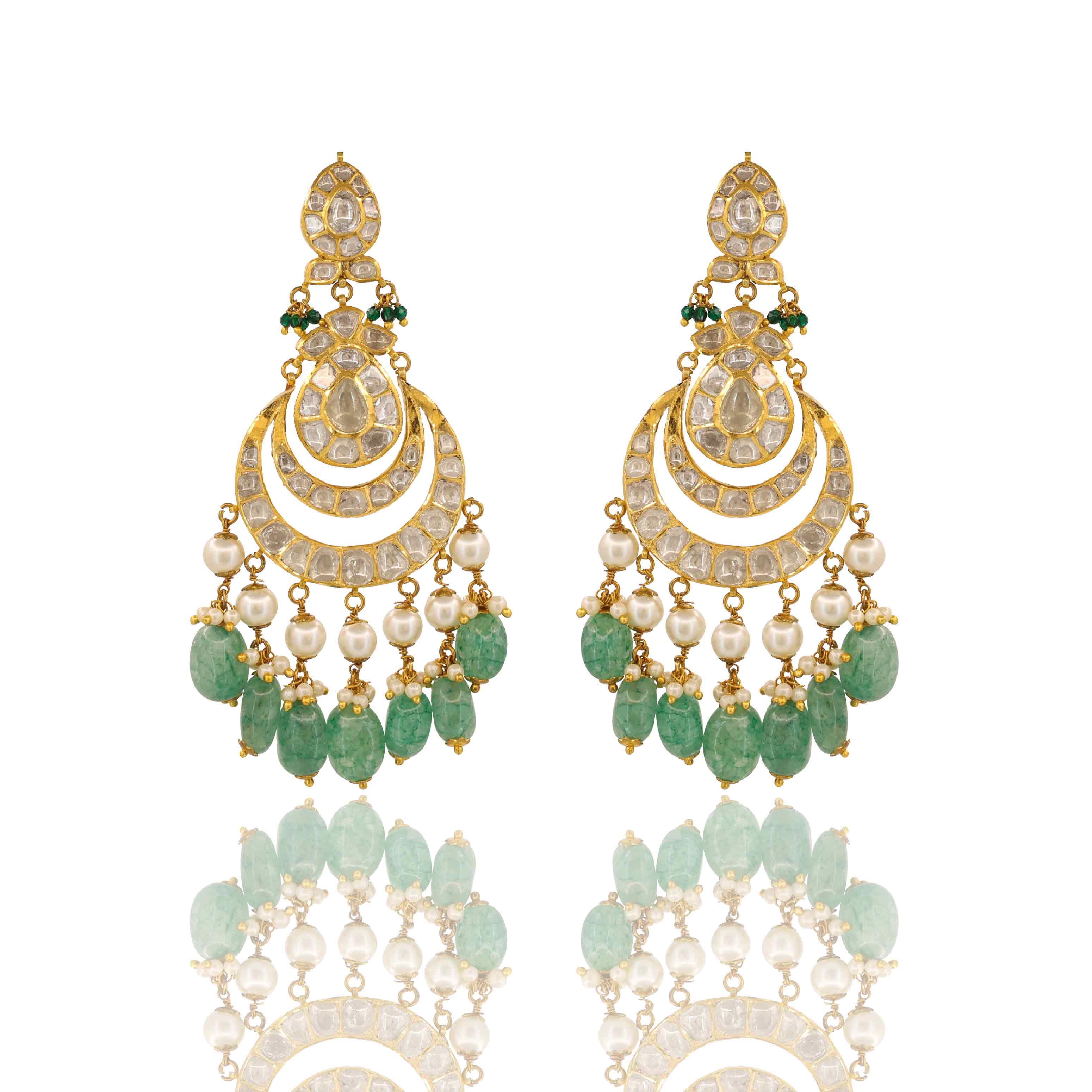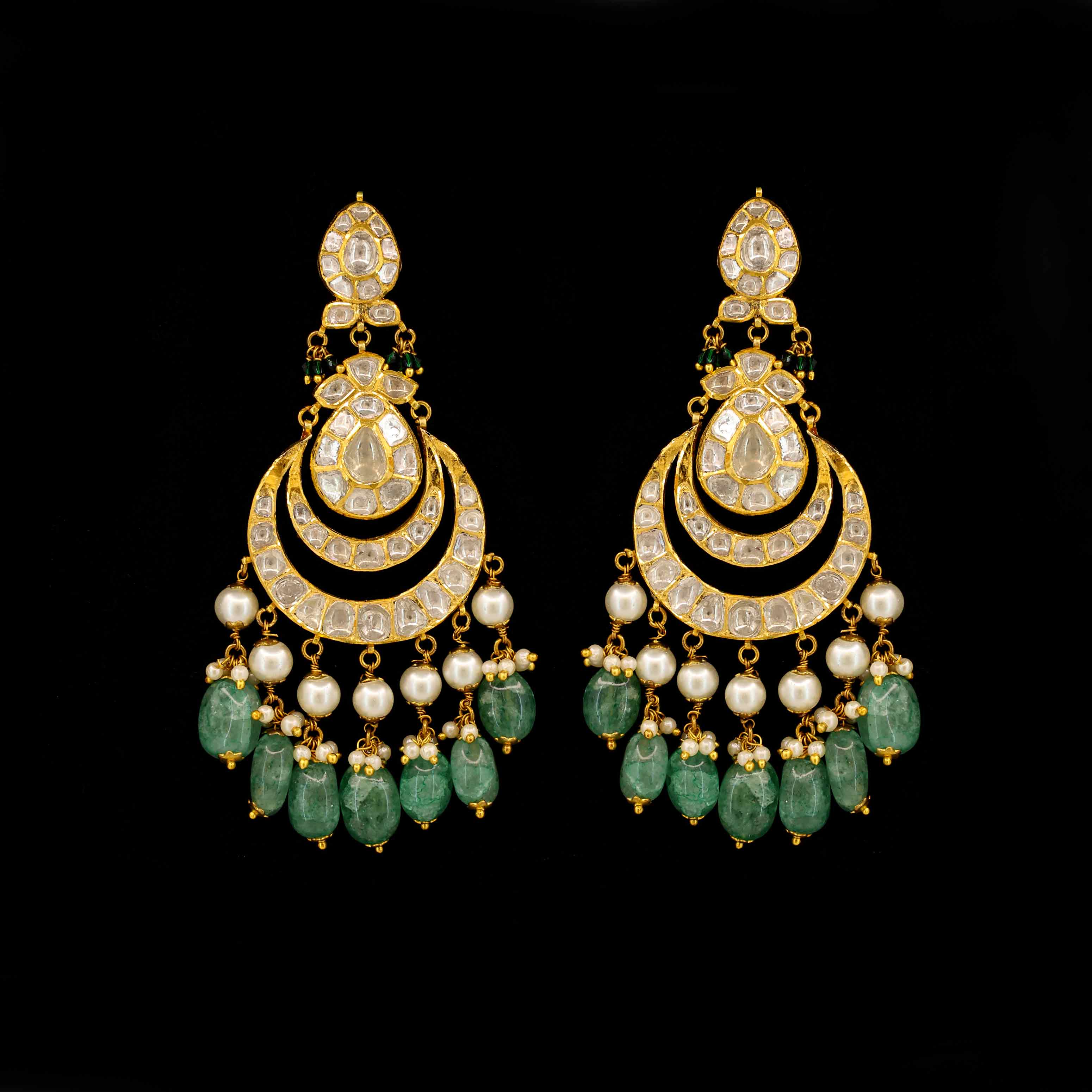 These exquisiteGold Jadau Chandbali Earringsfeature an intricate crescent moon design lavishly studded withNatural Syndicate Polki Diamonds. They are elegantly finished with dangling clusters of plump, carvednatural emerald beadsand delicatepearldrops, creating a stunning, traditional statement piece.