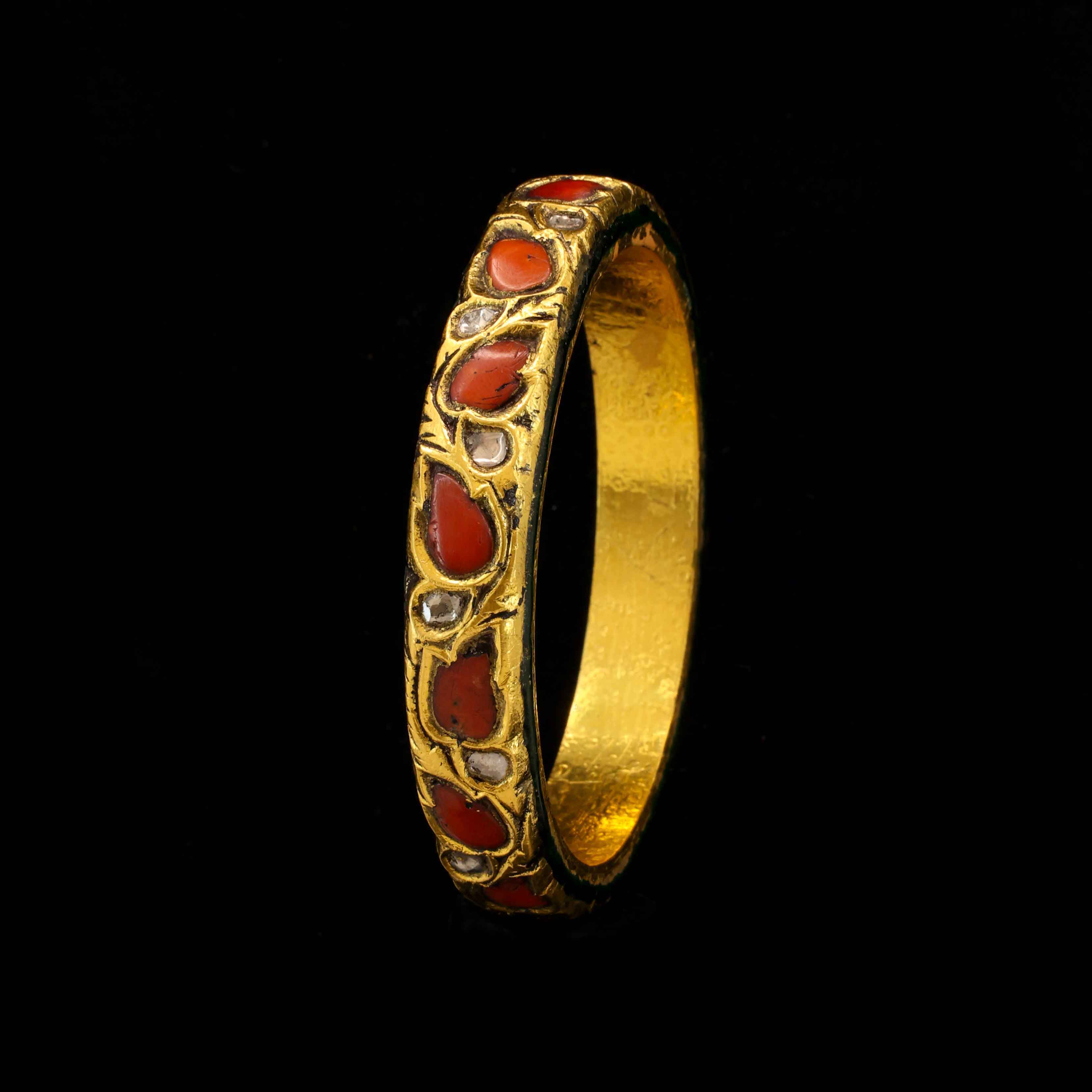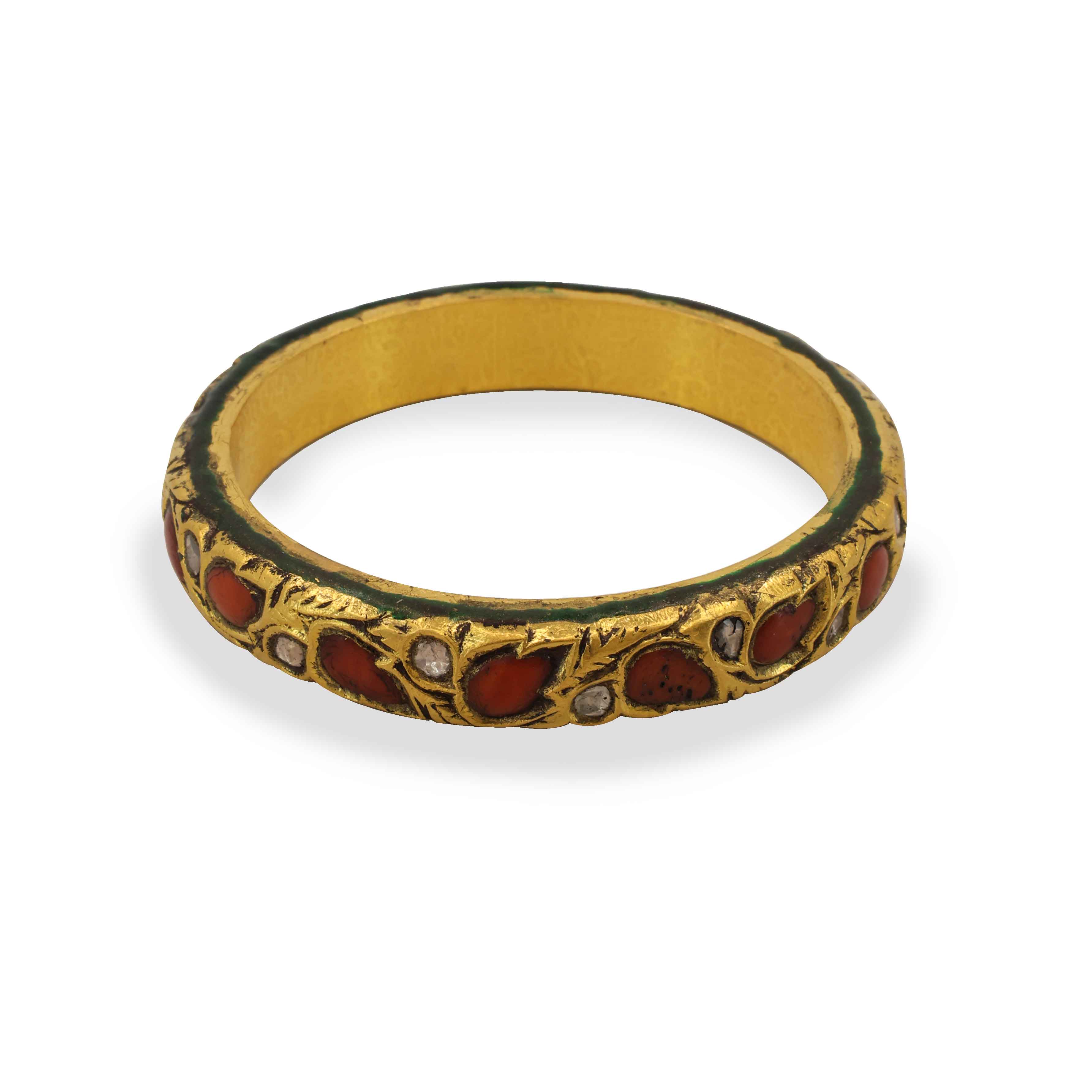 This strikinggold banglefeatures a band of intricate floral carvings alternating with brilliantnatural Polki diamondsand deep red, tear-drop shapedcoralinlays. The design is a beautiful example of traditional craftsmanship.