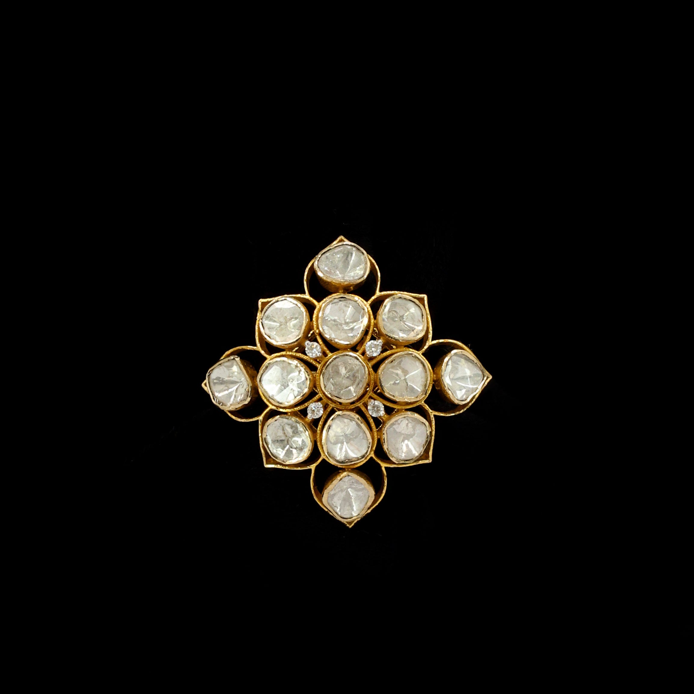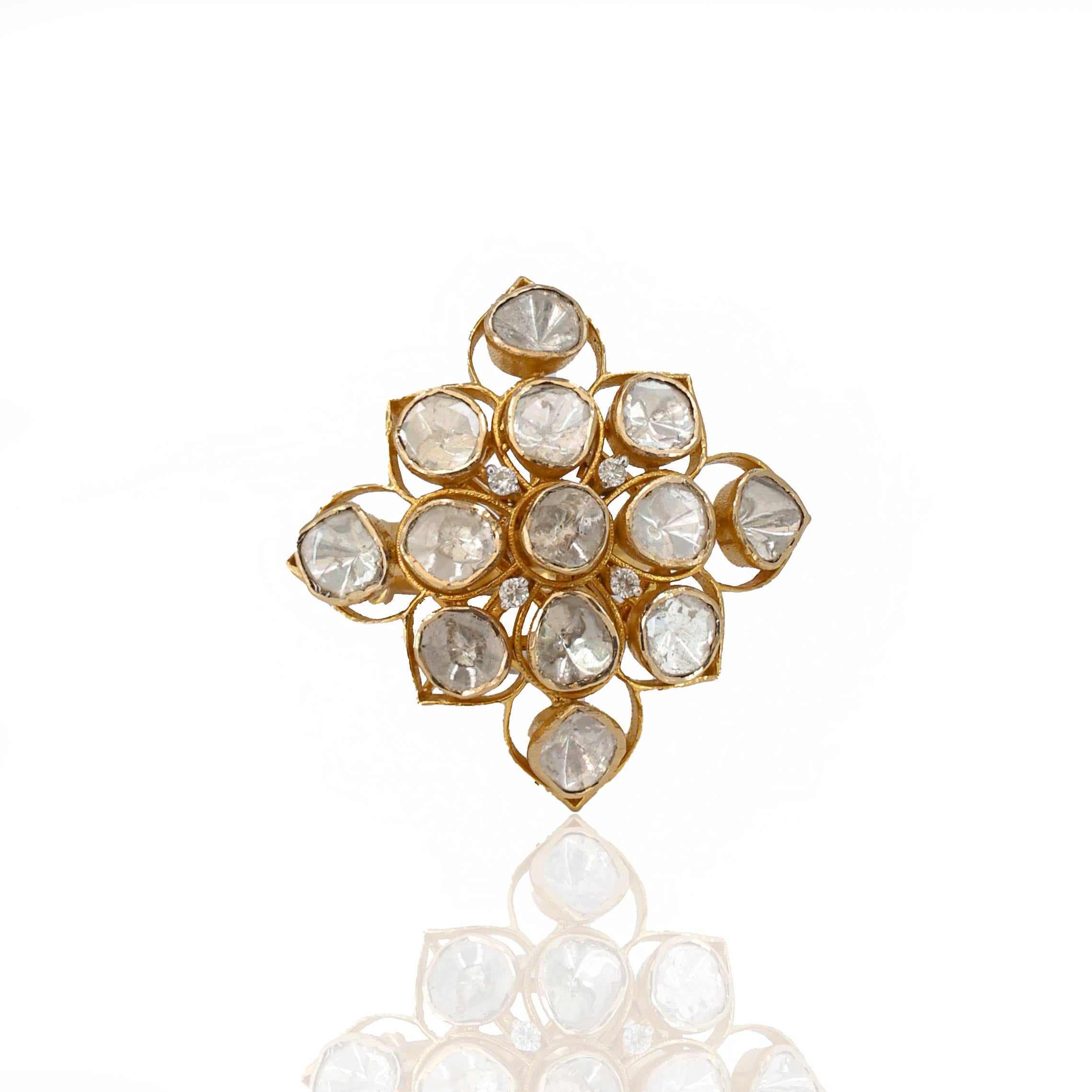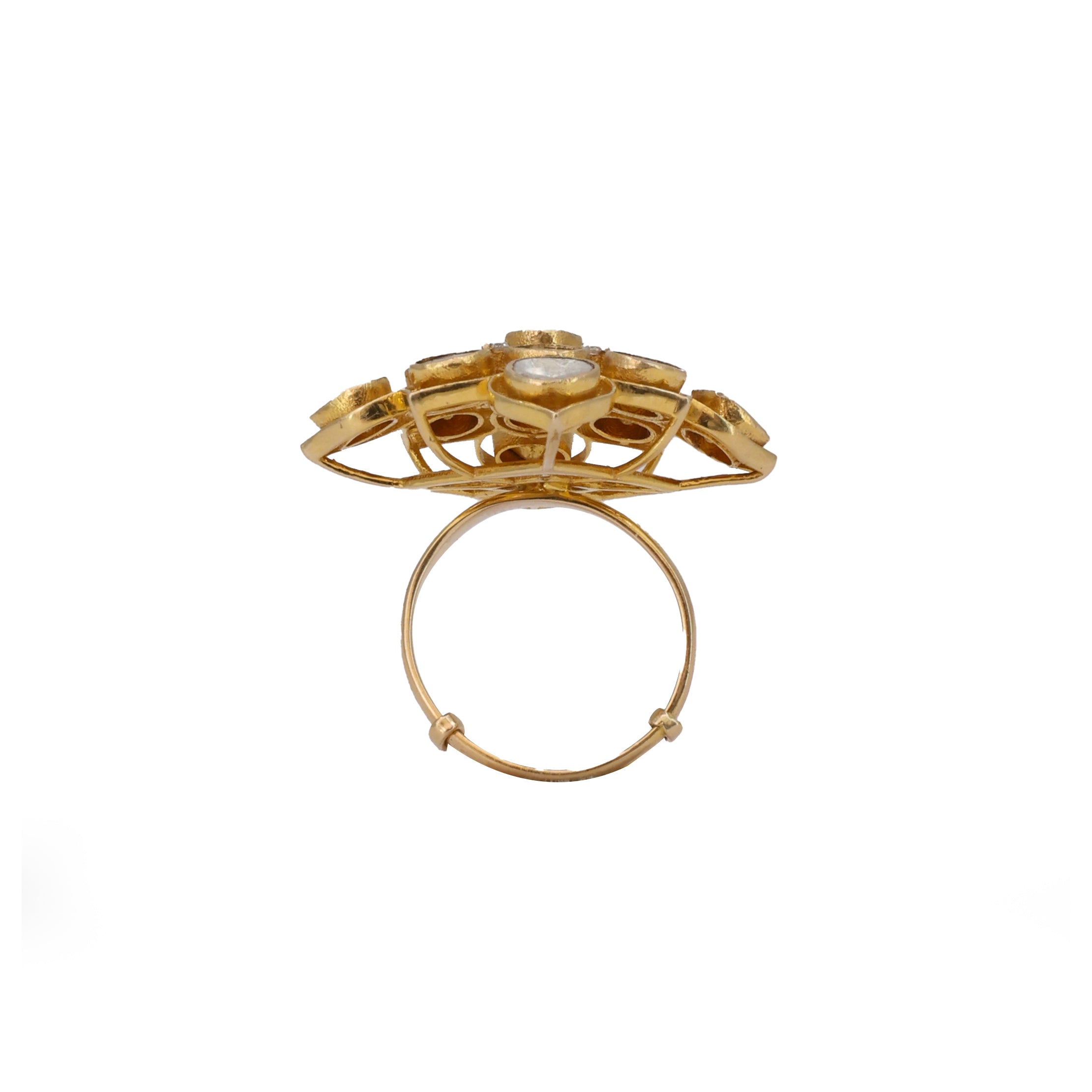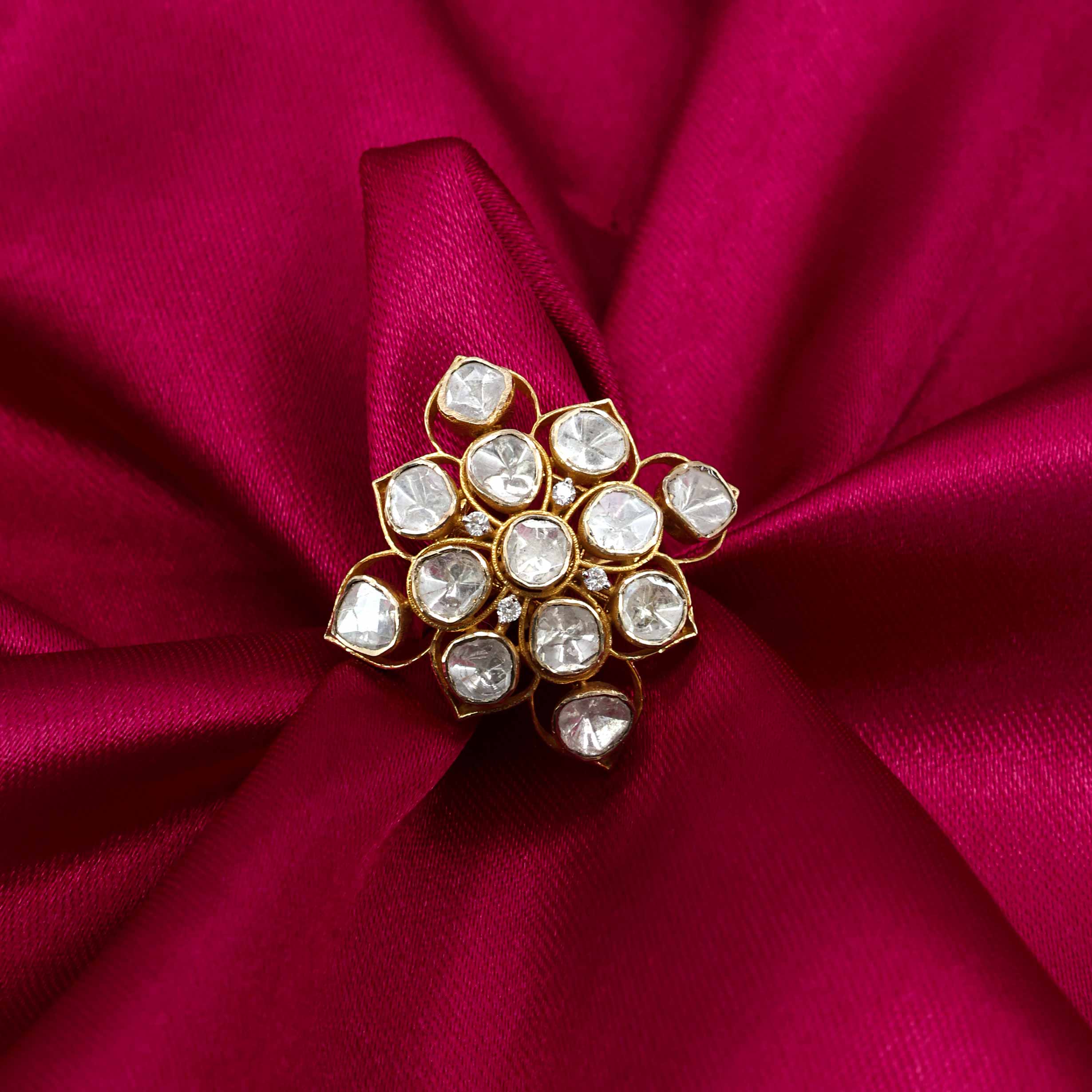 This elegant gold ring from Jaipur features a stunning cluster of natural polki diamonds, arranged in an open setting to maximize their raw sparkle. The intricate floral-inspired design showcases the unique beauty of each uncut diamond, creating a timeless and radiant piece of fine jewelry.
