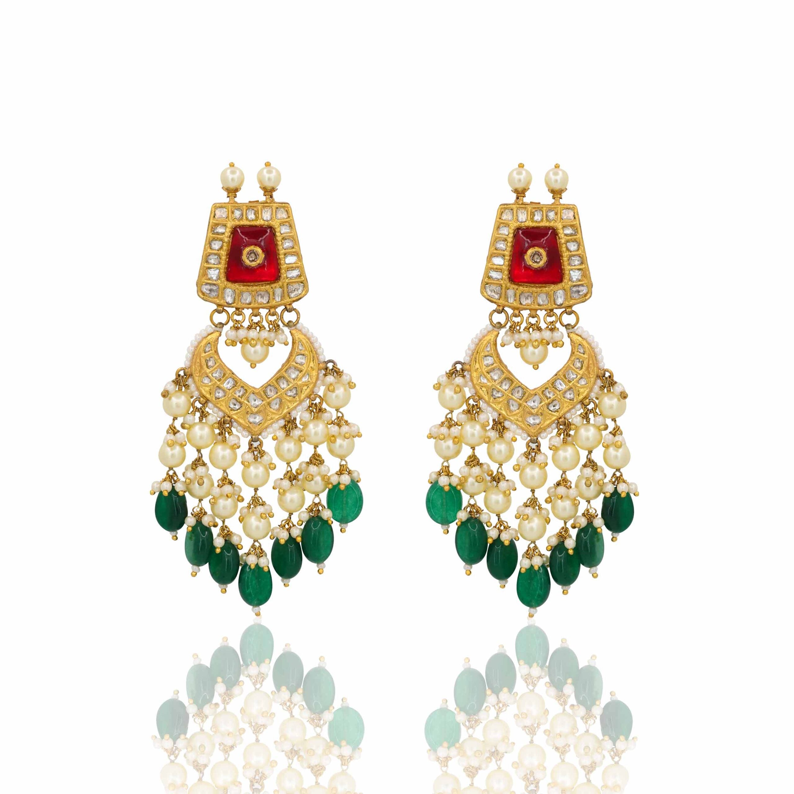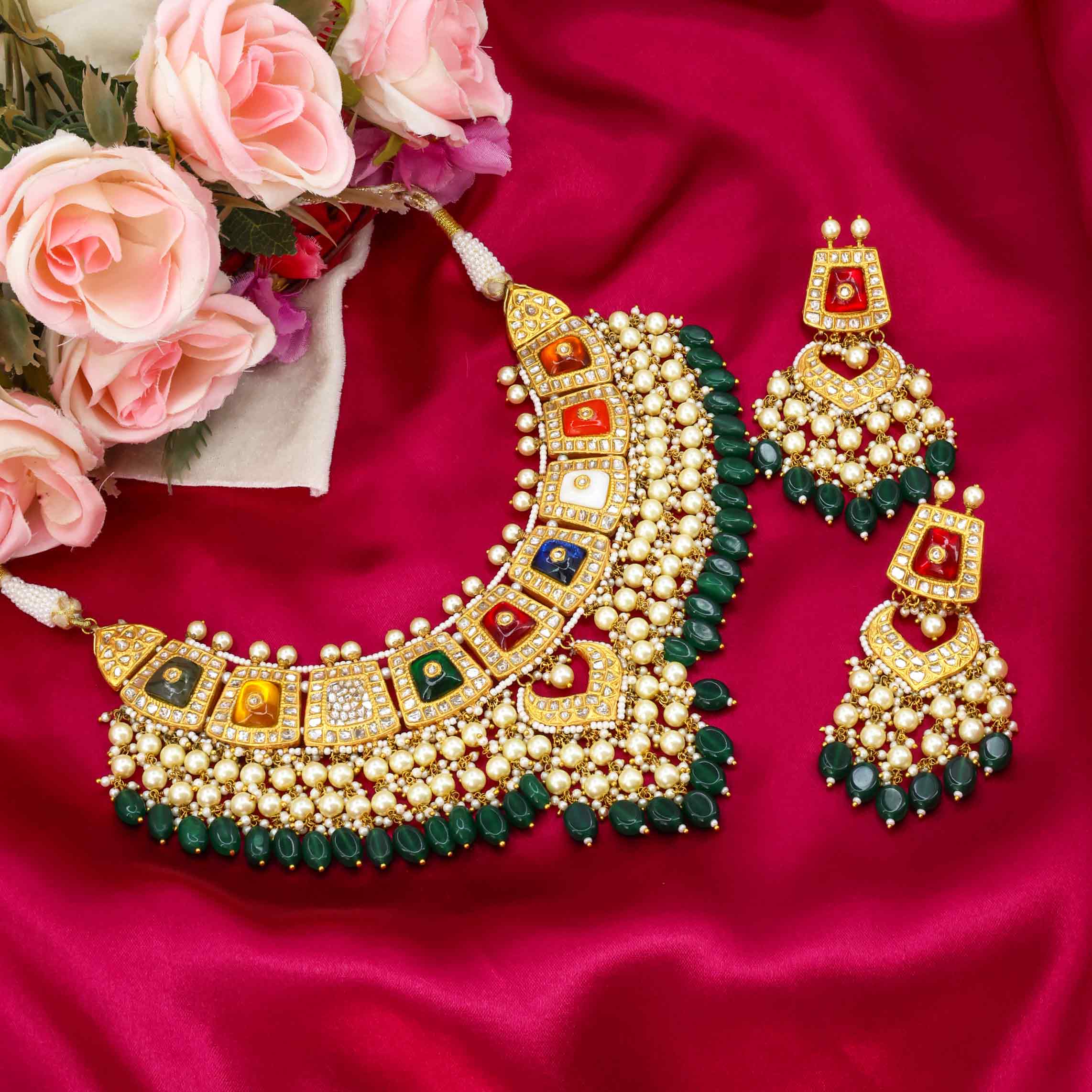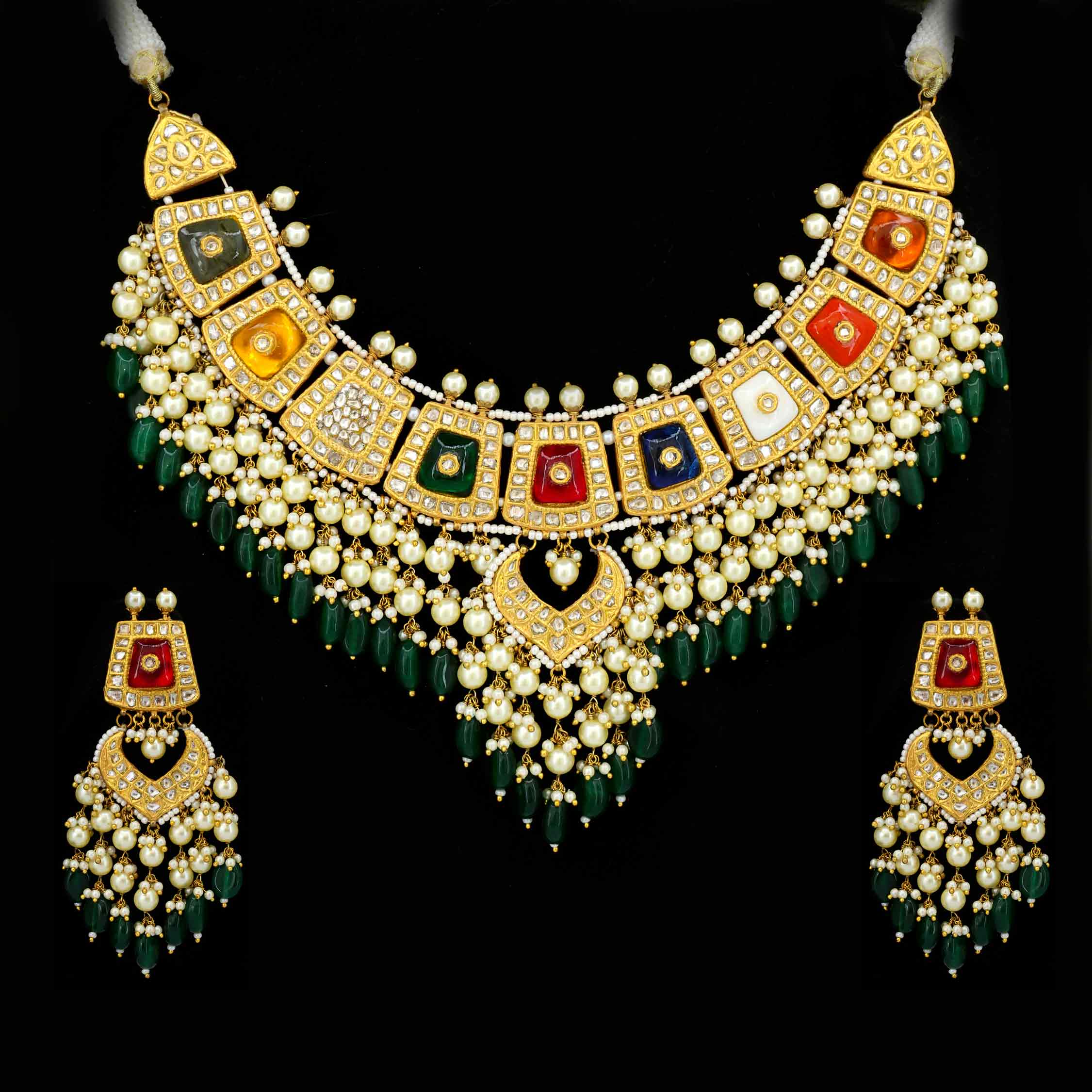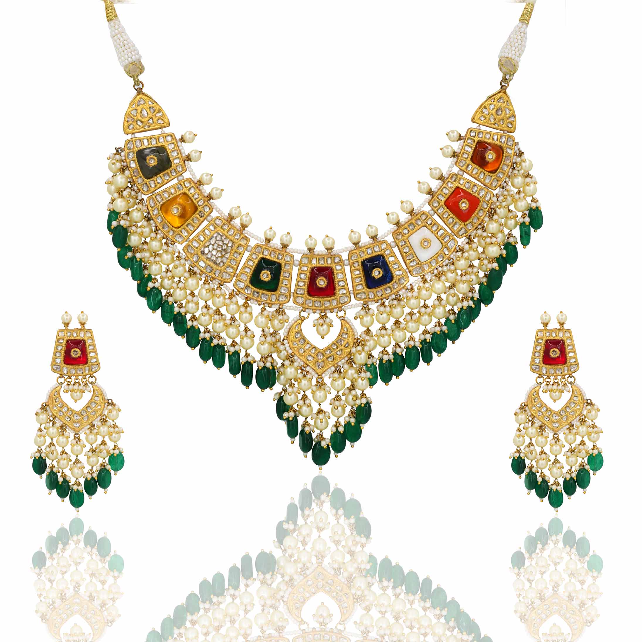 This stunning gold Navratan necklace set from Jaipur features a vibrant array of semi-precious stones, natural polki diamonds, and delicate pearl stringing. The statement piece is further enhanced with dangling semi-precious green beads, accompanied by matching earrings, exuding traditional elegance.