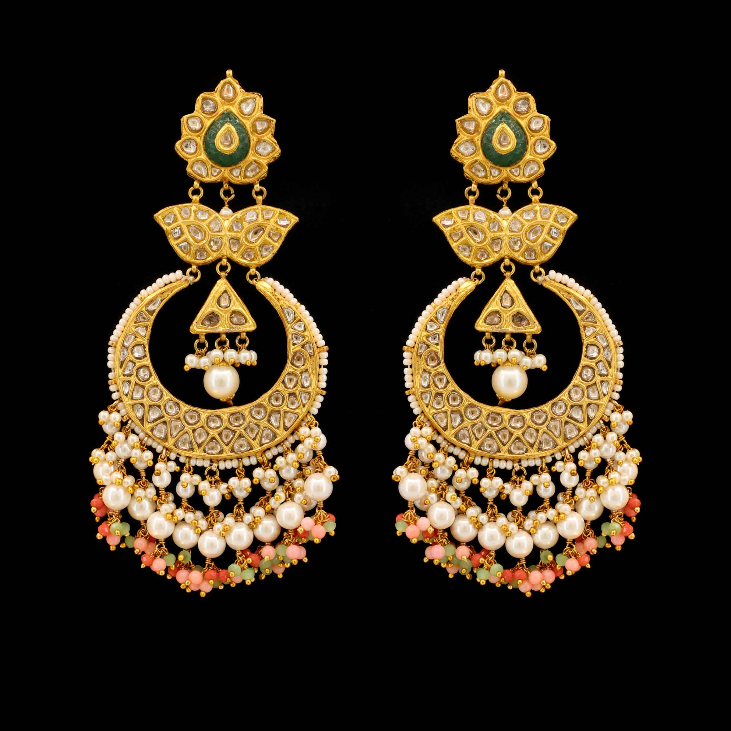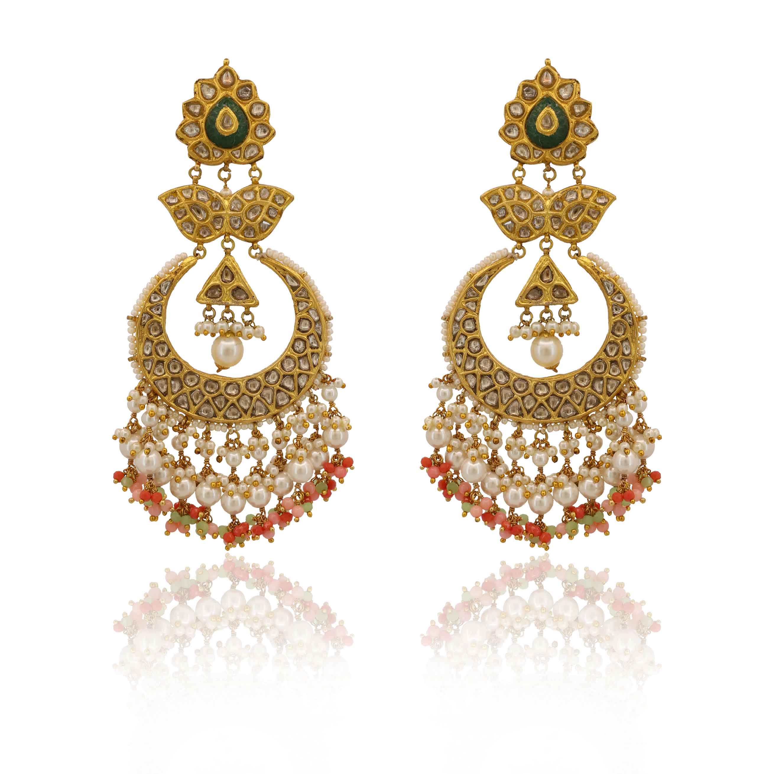 The Coral Bloom Polki Diamond Chandbali. These gold-Chandbali earrings feature genuine natural Polki diamonds. They are beautifully finished with strings of pearls and coral beads, creating a striking, colorful, and traditional bridal or festive look.