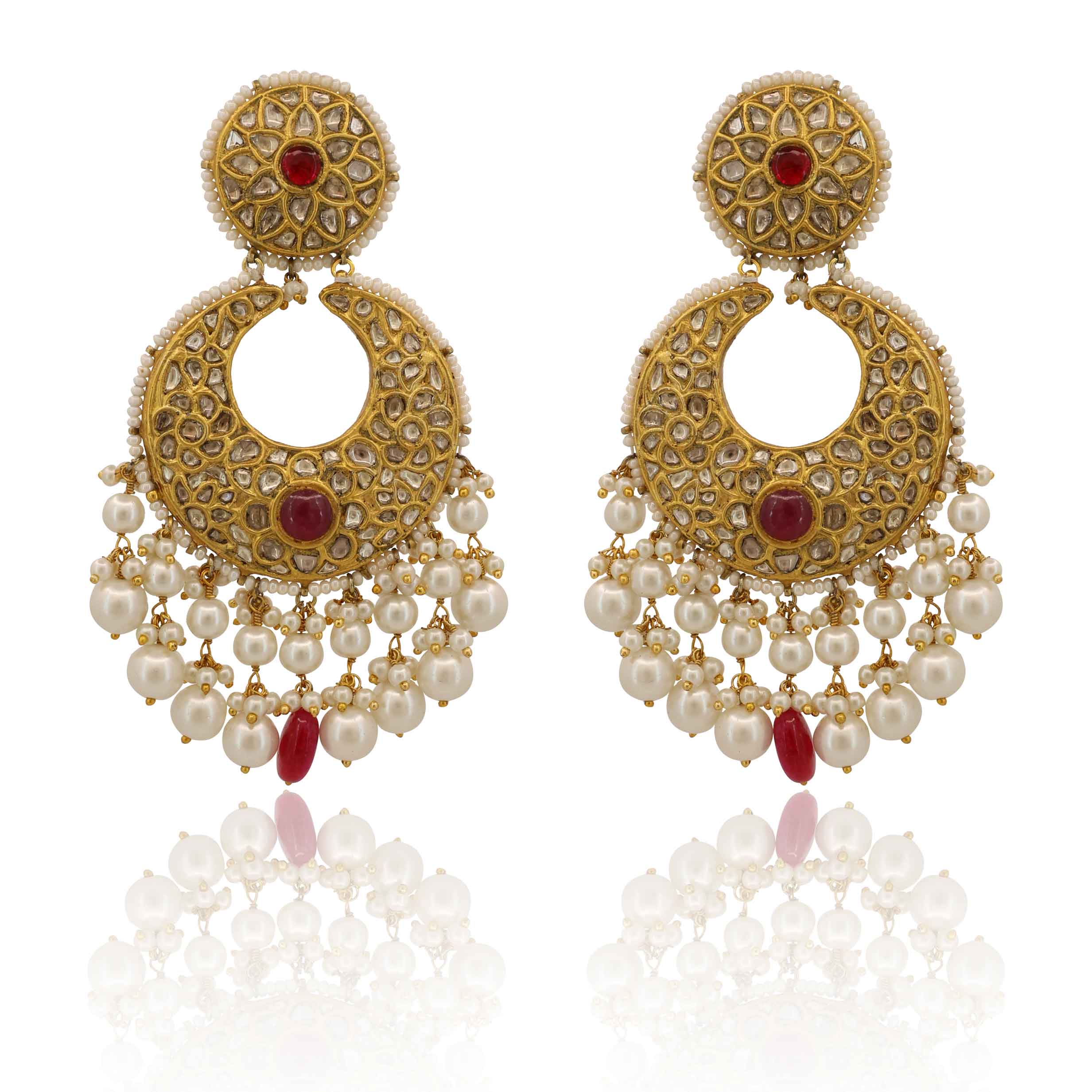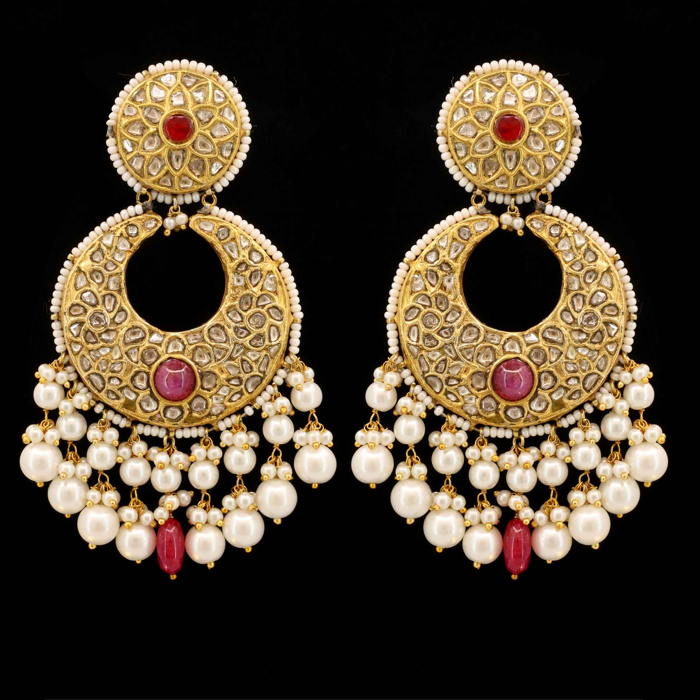 These luxurious, layered Chandbalis feature a bold Polki diamond crescent with a striking central ruby (glass filling) and an additional ruby drop. The ornate design is completed by a grand cluster of lustrous pearl drops, perfect for bridal wear.