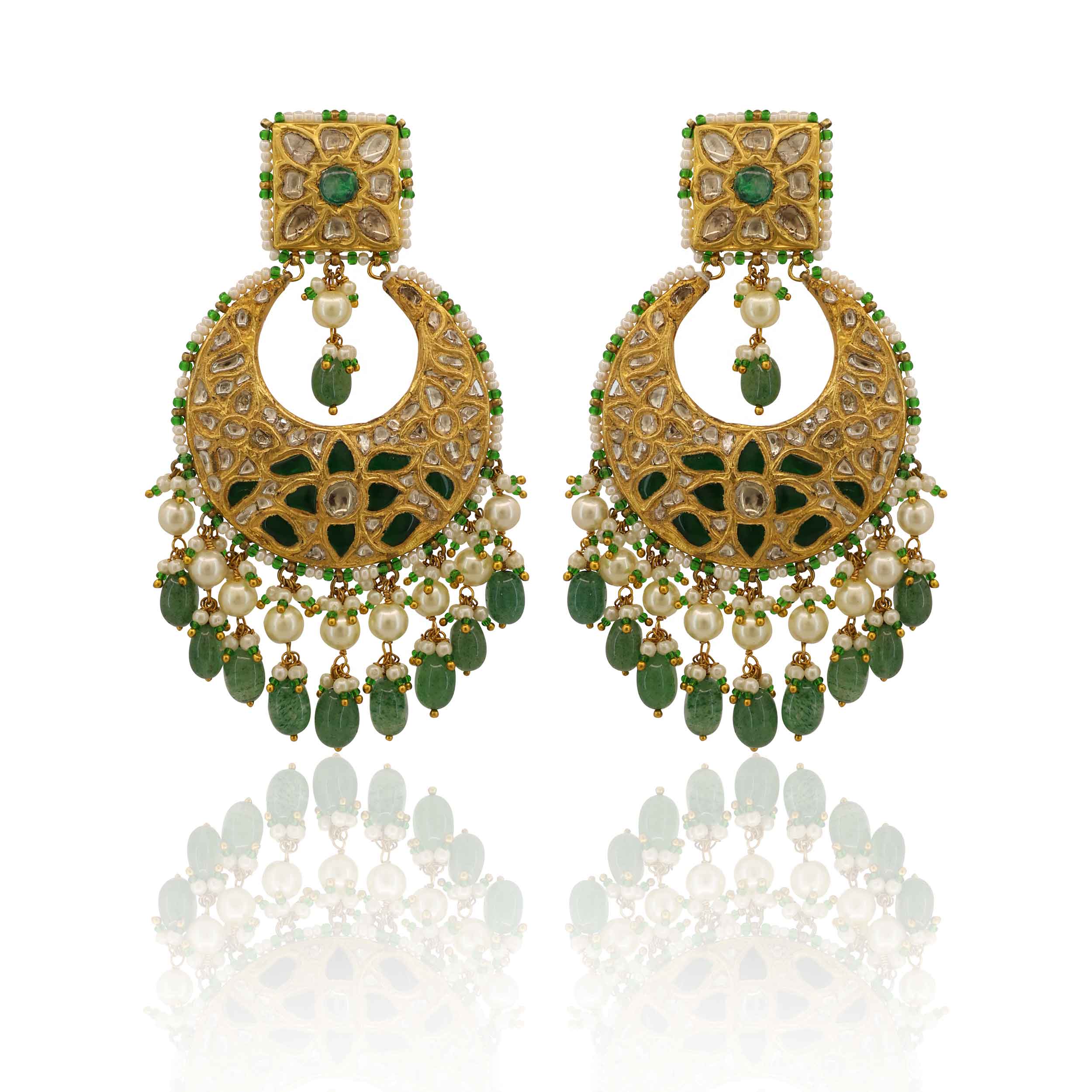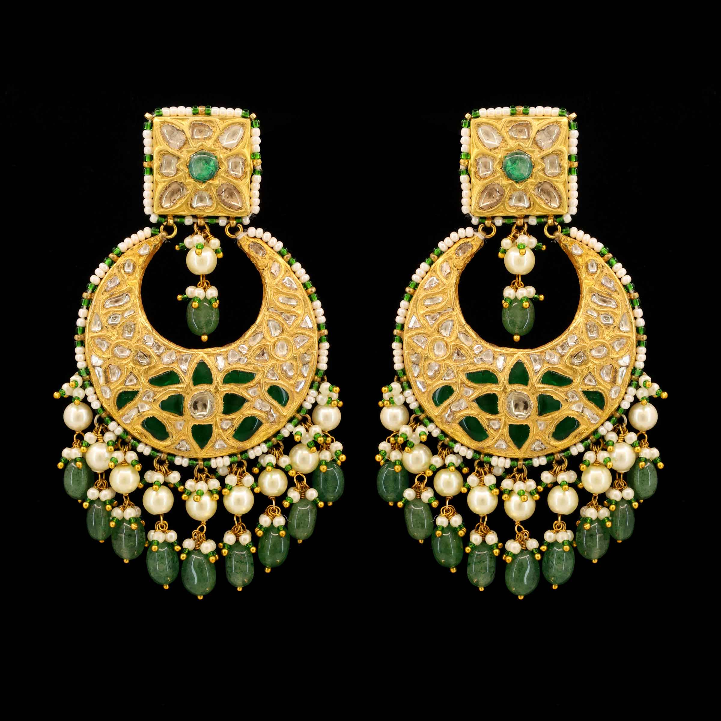 These exquisite Chandbali earrings feature a beautiful blend of natural Polki diamonds and glass-filled gemstones set in gold-toned metal. They are intricately stringed with pearls and glass-filled emerald drops, creating a traditional, opulent look.
