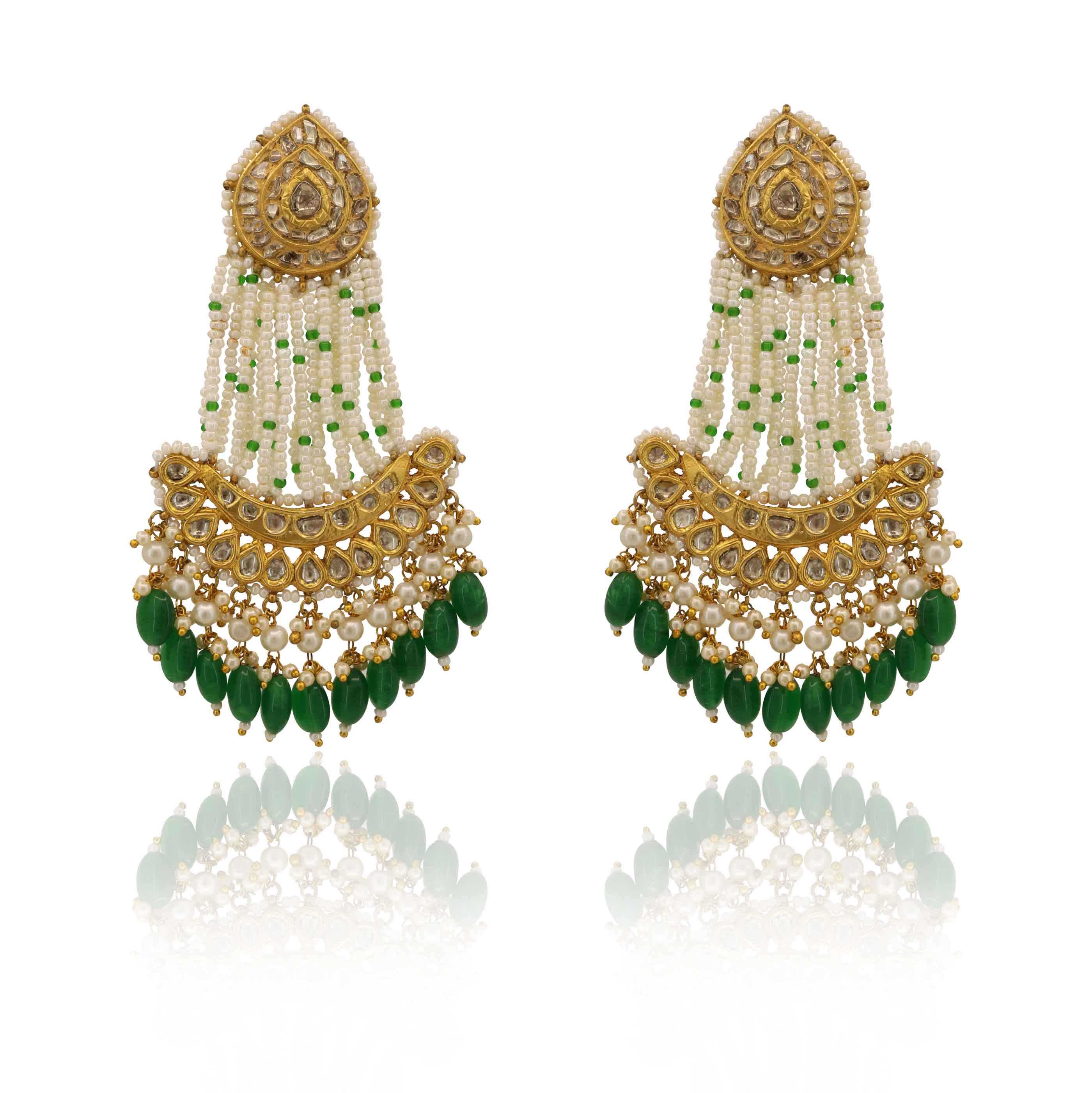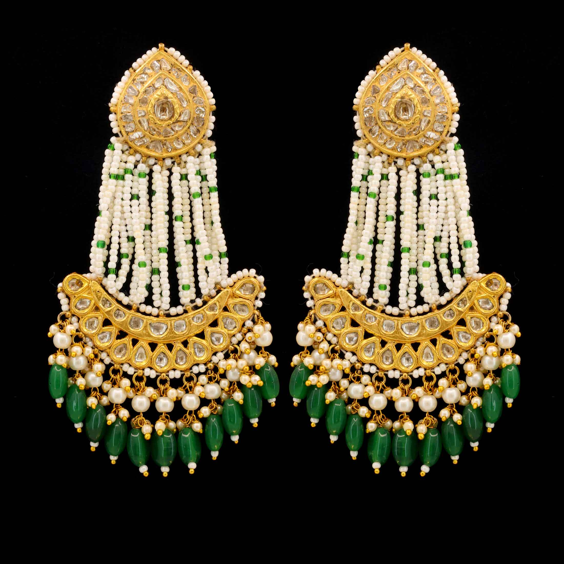 These regal Polki Chandbalis are anchored by large carved green glass-filled Emerald stones. The intricate gold crescent is finished with a striking cascade of natural Emerald drops and small pearl accents, radiating timeless elegance.