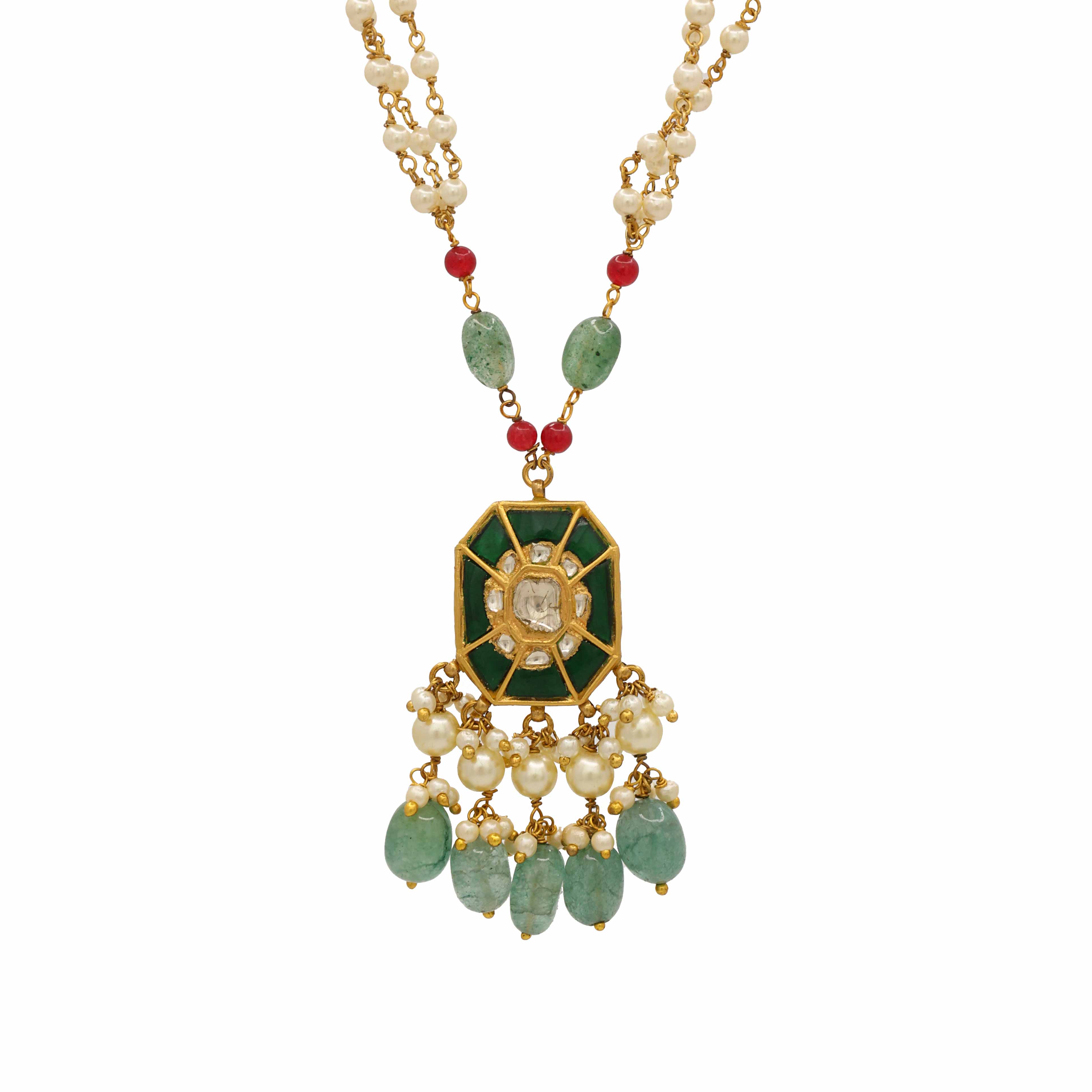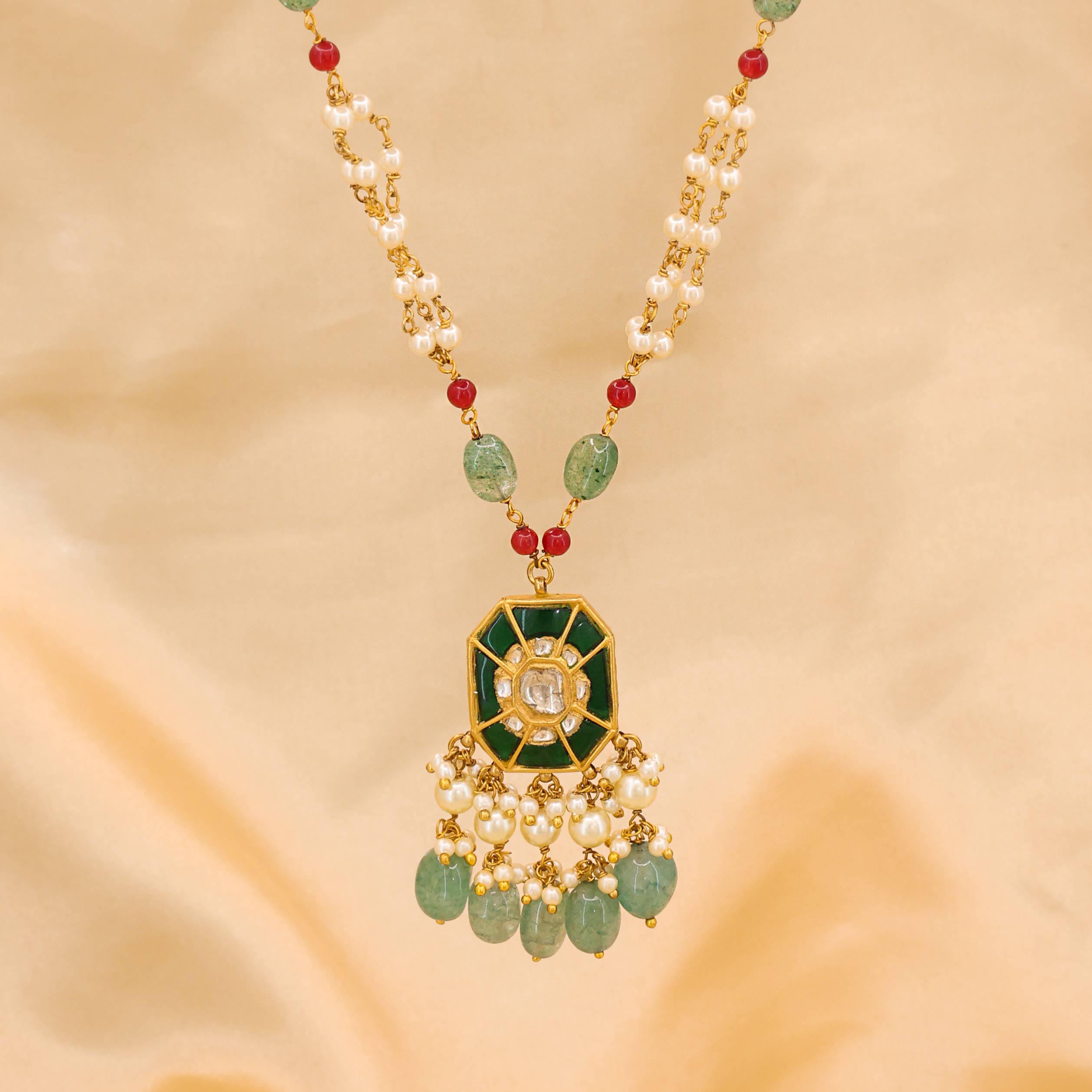 This elegant necklace features a beautiful gold pendant that is both geometric and luxurious. The octagonal pendant is set with a brilliant, uncut Natural Syndicate Polki diamond at its center, surrounded by a deep green talpe border.