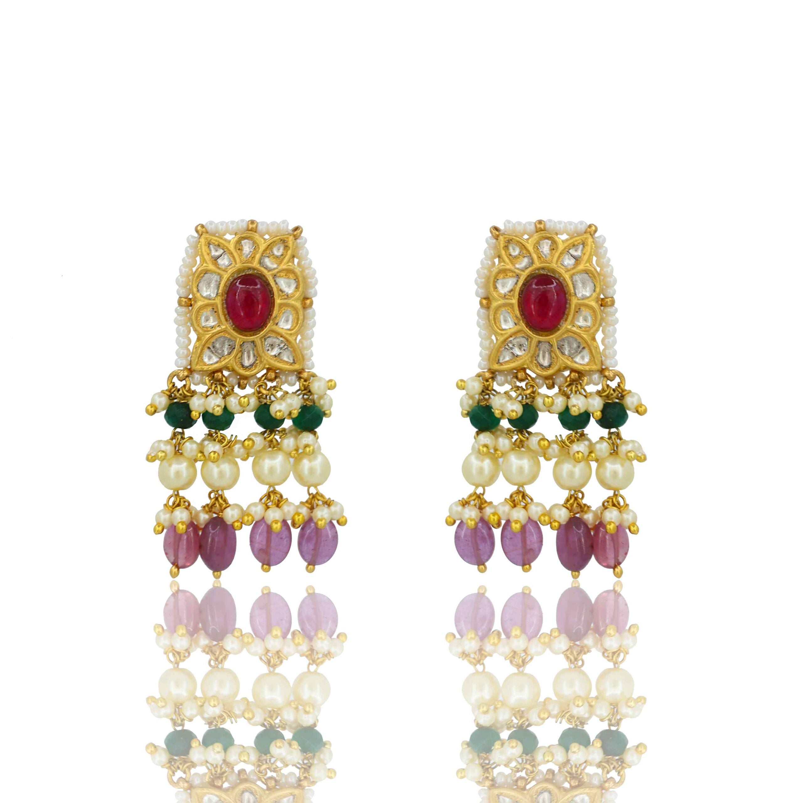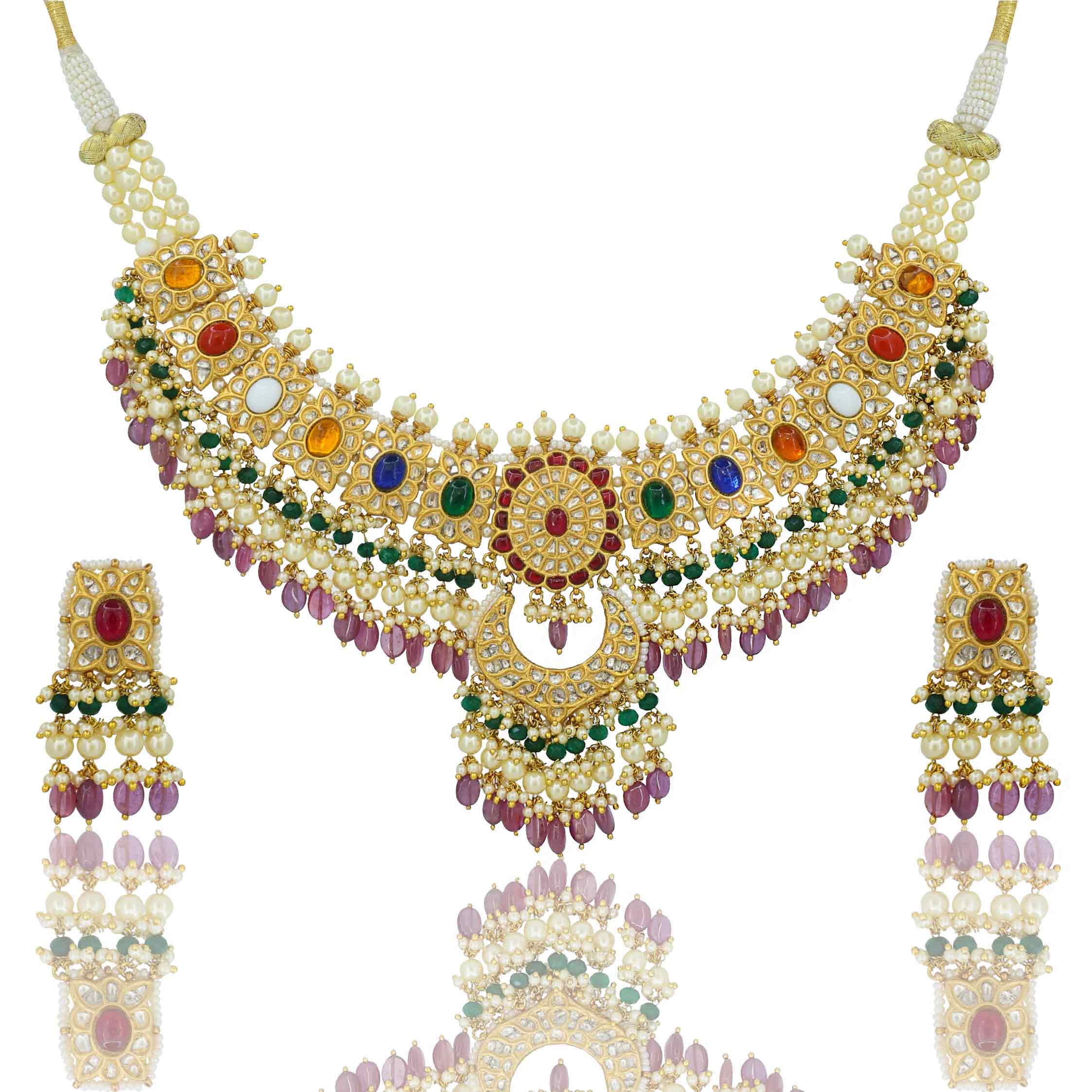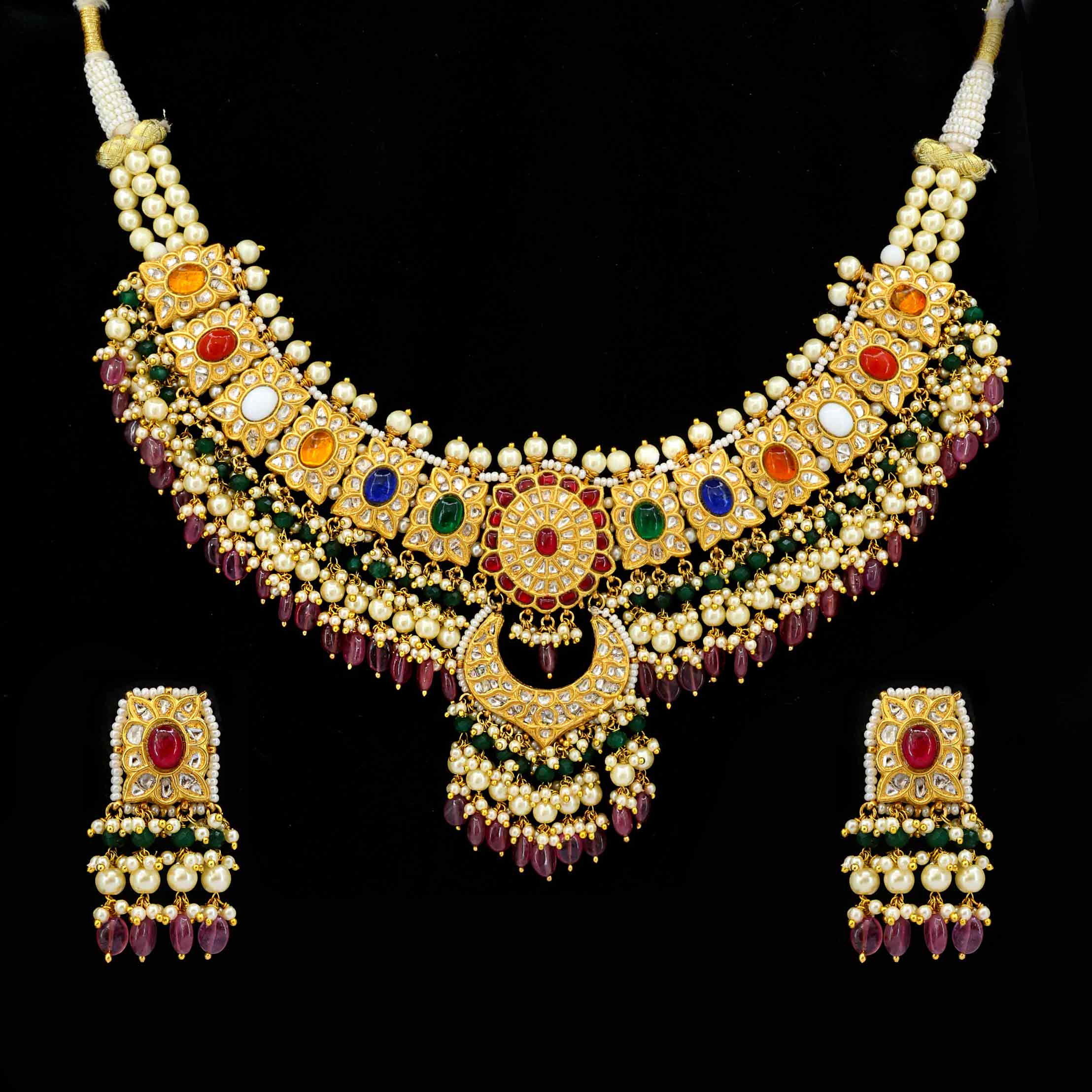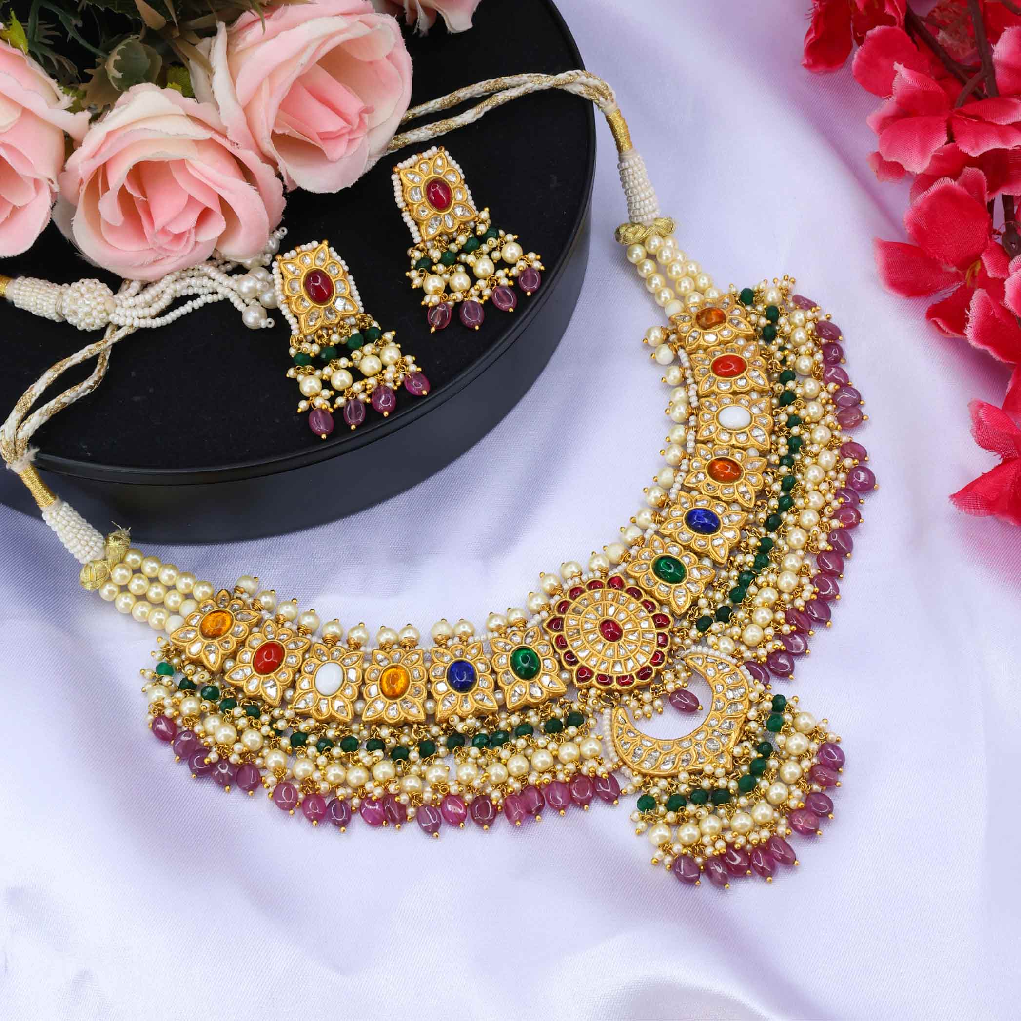 This opulent gold-toned Navratan necklace showcases a vibrant array of the nine traditional gemstones, elegantly interspersed with lustrous white pearls. A grand central pendant with a crescent motif serves as a stunning focal point. The ensemble is enhanced by dangling red and green beads, and completed by a pair of matching earrings, creating a look of regal splendor.