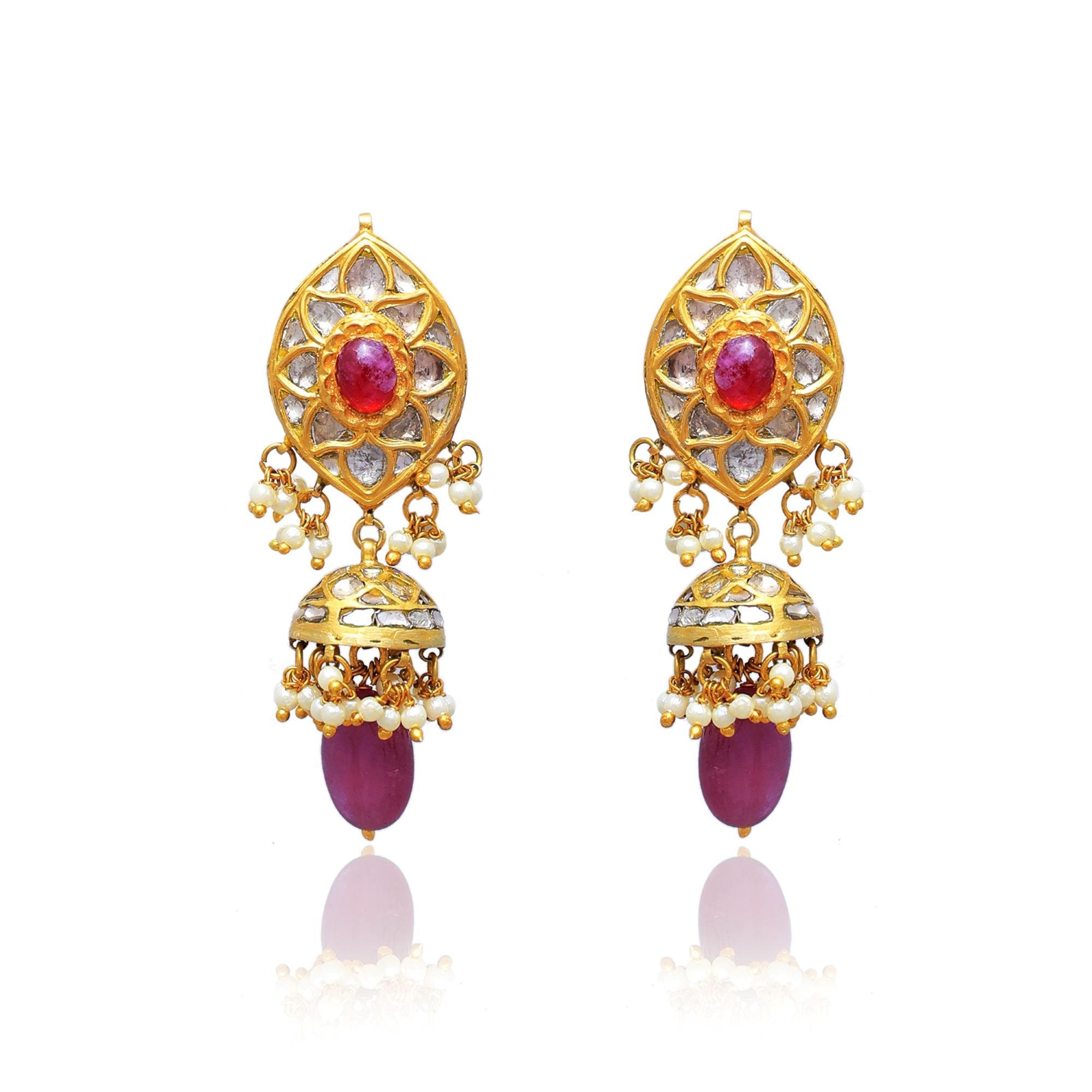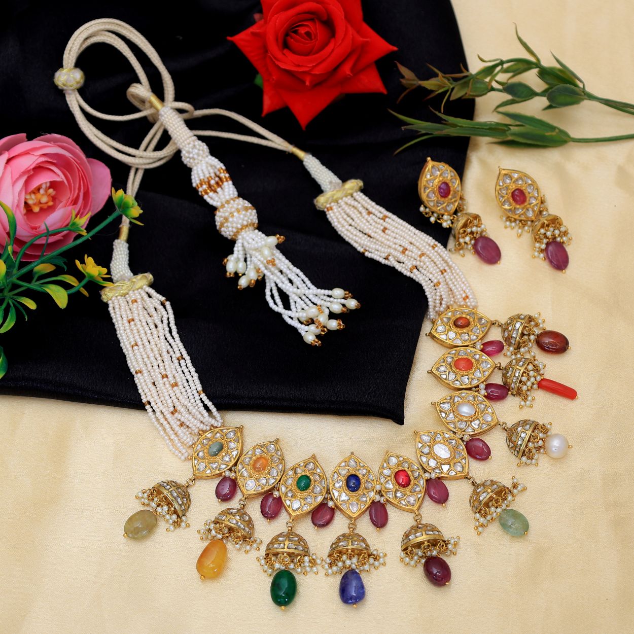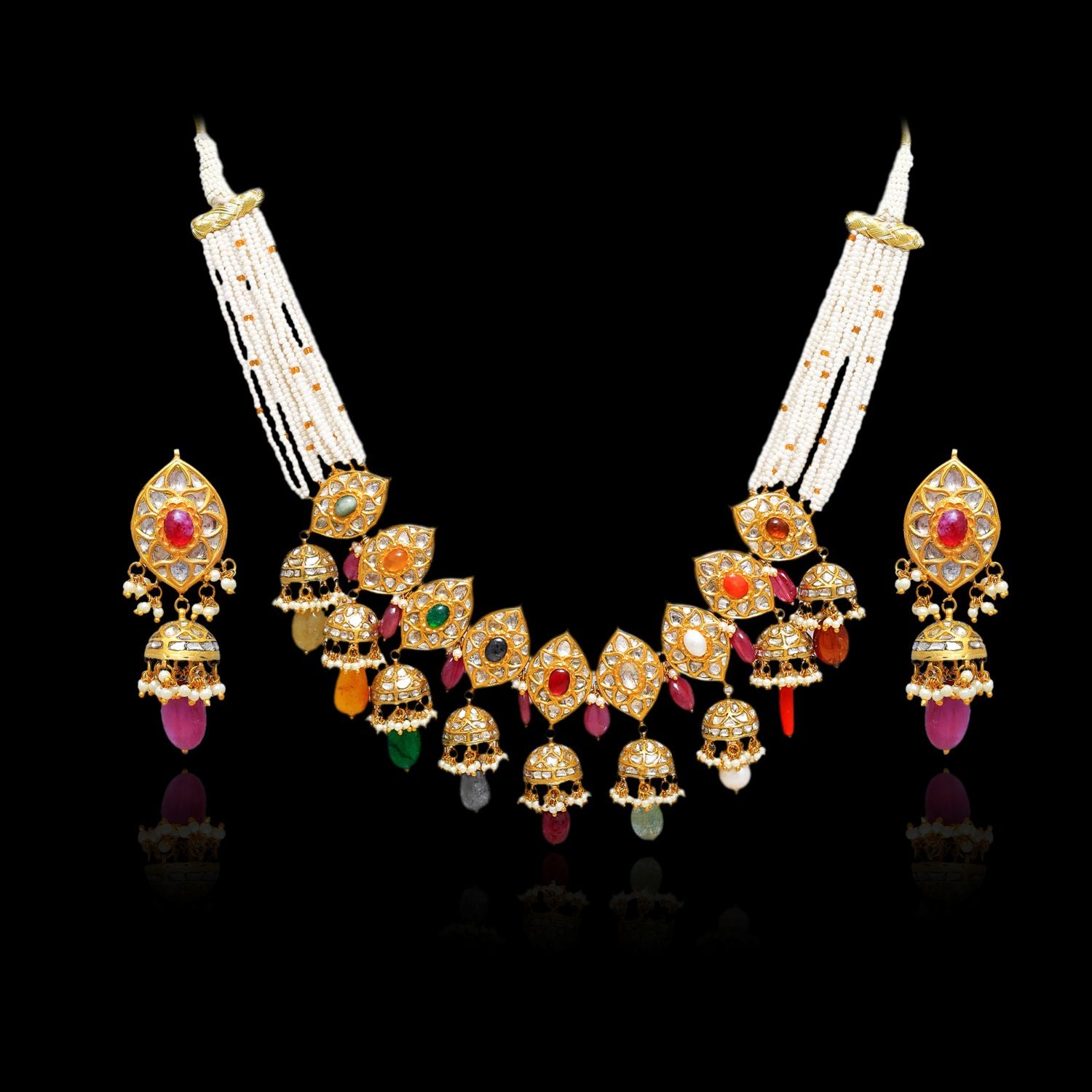 This Marcus-shaped Mango Kathla necklace set features a unique mango leaf-inspired design. Each element is intricately studded with dazzling real diamond Polki and vibrant real Navratan gemstones. Delicate dangling Jhumki earrings complement the richly detailed necklace, creating a traditional yet opulent jewelry ensemble.