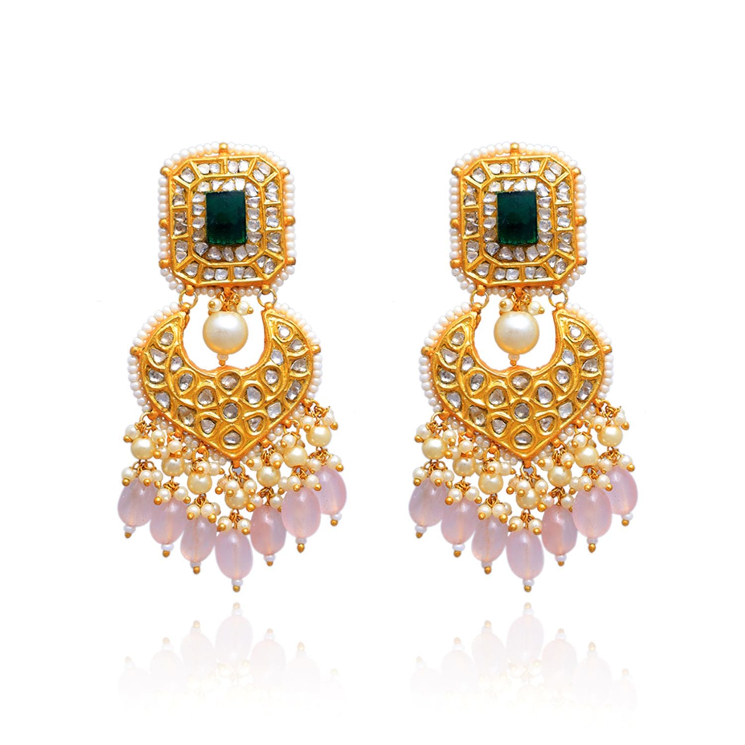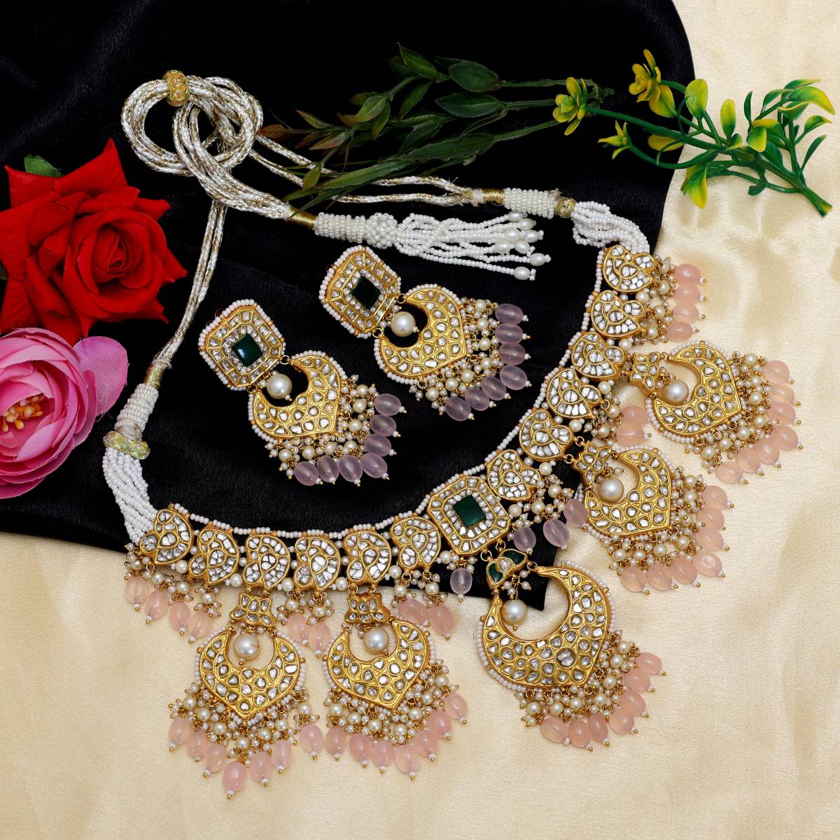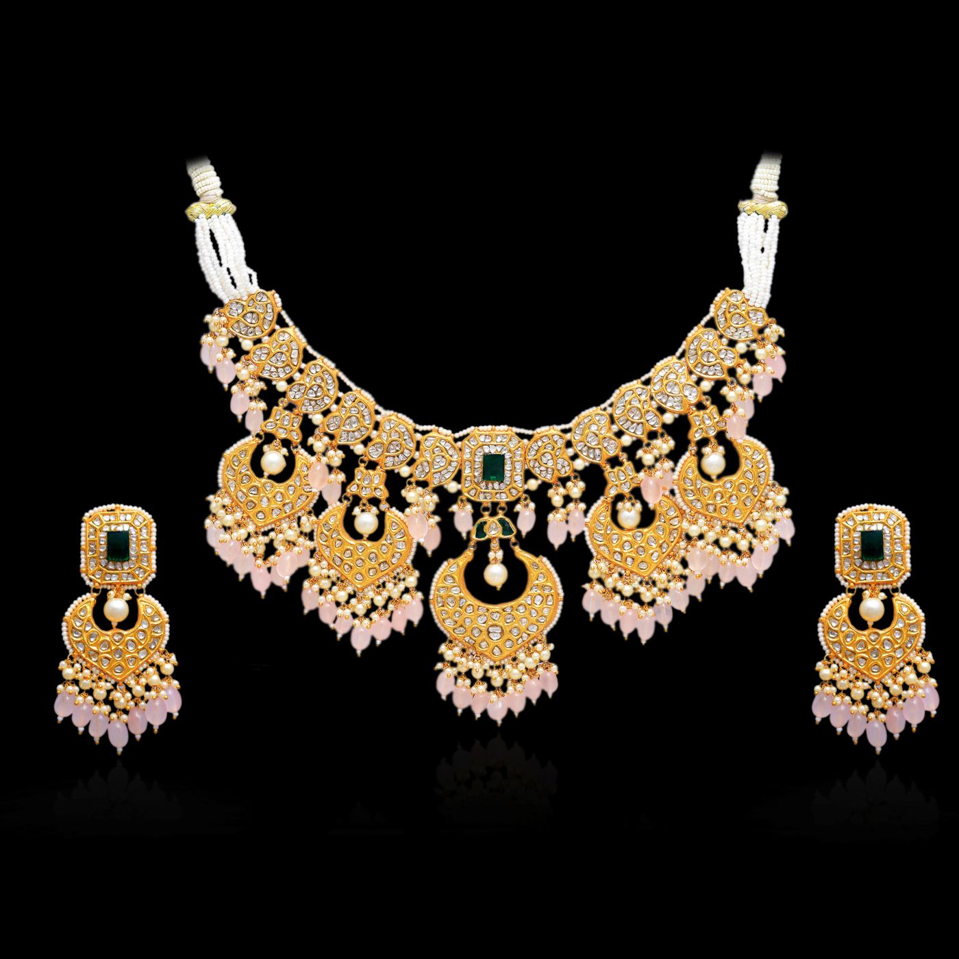 This Ishhaara Kundan Jadau Polki necklace set showcases a traditional Indian design with intricate gold foil work. The necklace features a central pendant with embedded stones and dangling elements, complemented by matching earrings. Delicate pink beads and faux pearls add a touch of elegance to this handcrafted jewelry, perfect for special occasions.