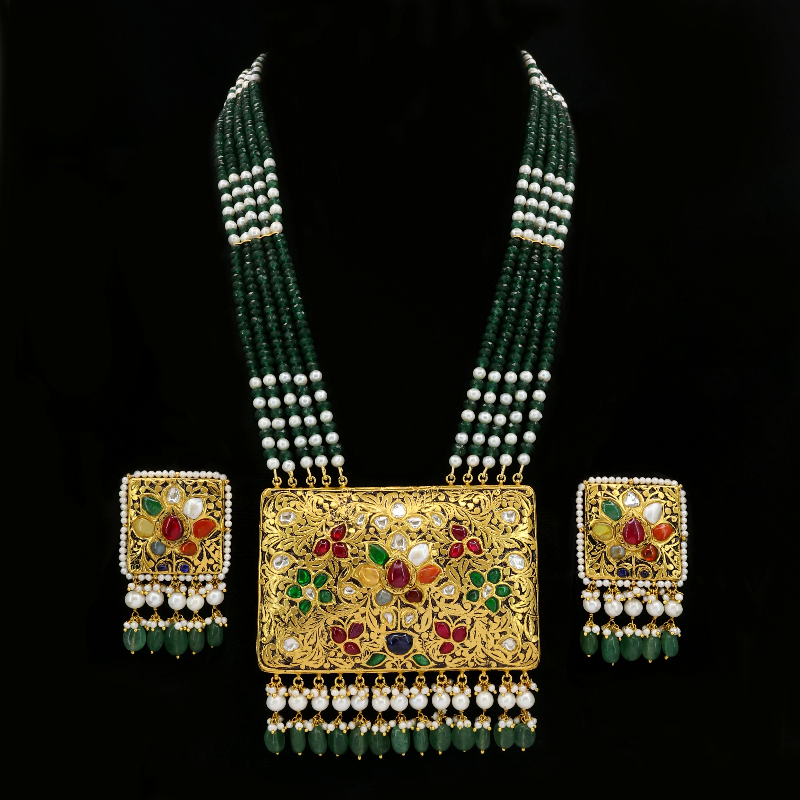 Exquisite gold-studded necklace set featuring Natural Syndicate Polki diamonds and vibrant Navratna stones. The design is elegantly finished with stringed pearls and glass-filled emerald beads, blending traditional craftsmanship with timeless luxury for a regal, sophisticated look.