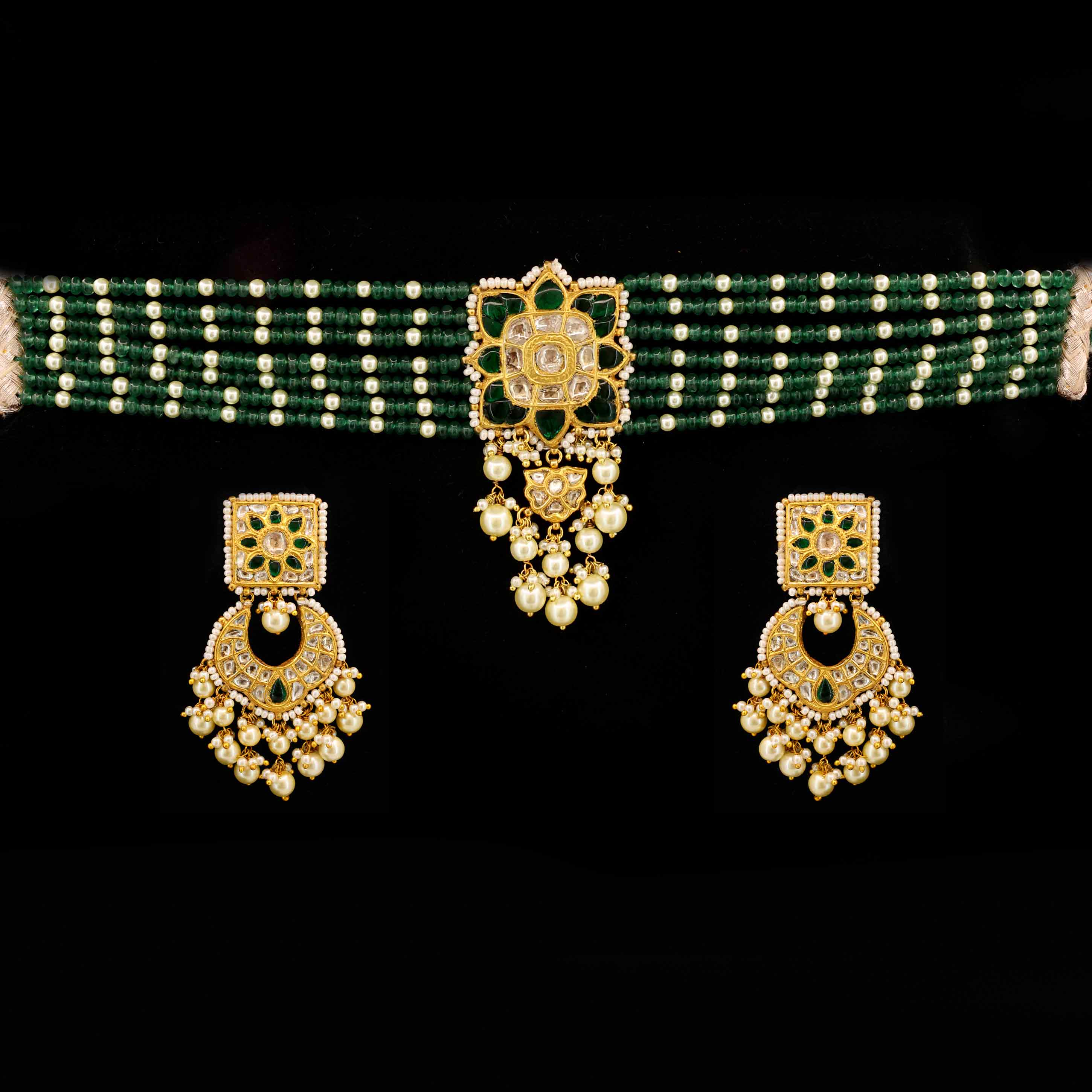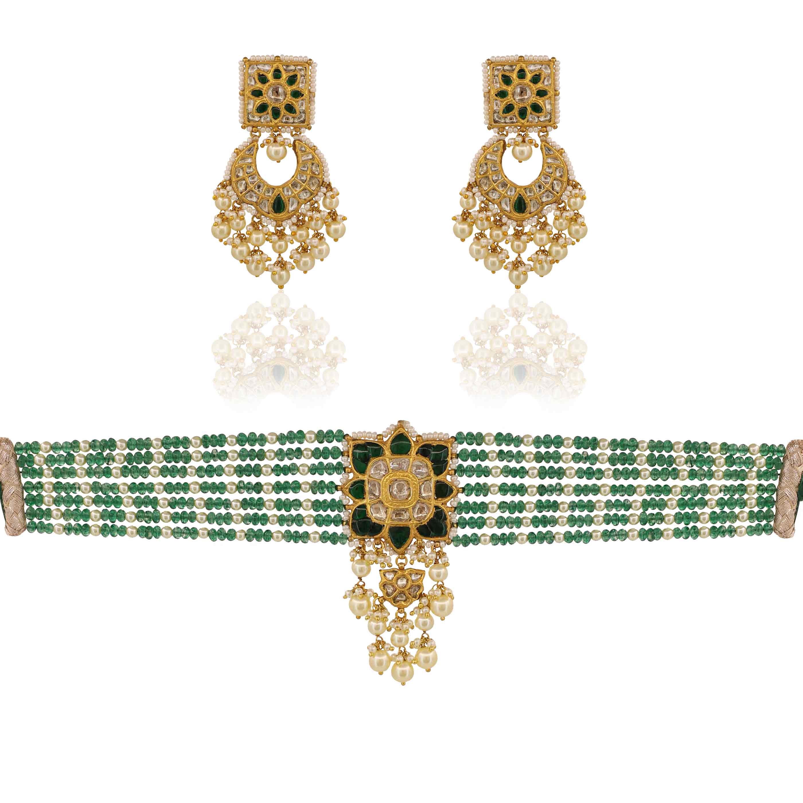 Emerald and Pearl Choker Set featuring five strands of green beads and pearls. It showcases a central Polki diamond and emerald-studded pendant with matching Chandbaali earrings and pearl drops—a perfect statement of royal elegance.