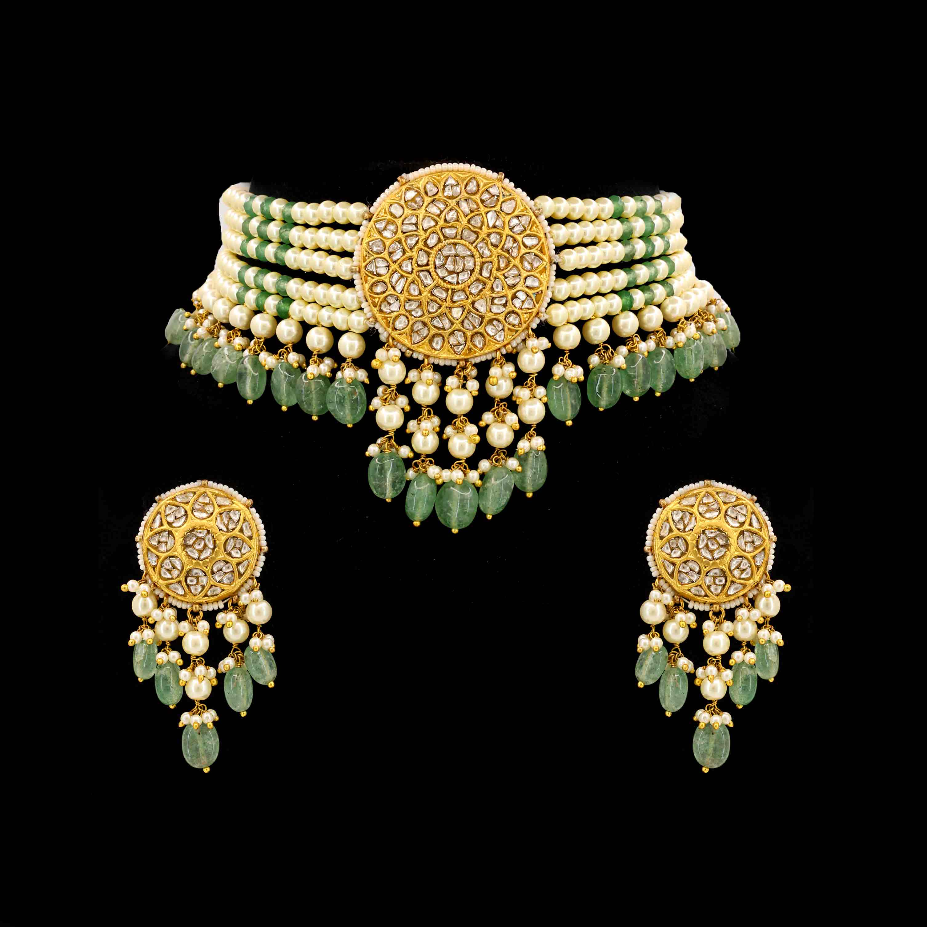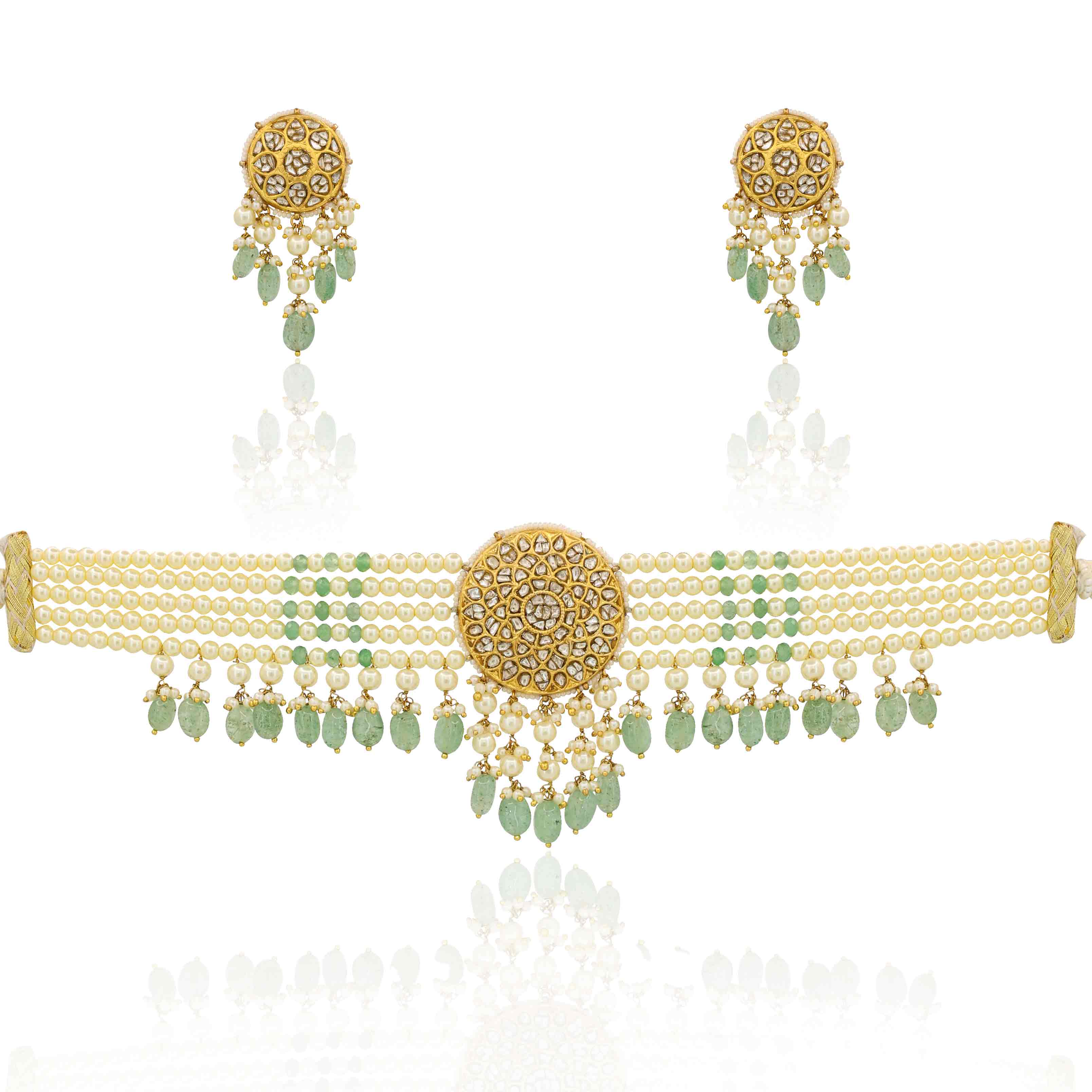 beautiful Gold Polki Choker Set featuring multi-strands of pearls and green emerald beads. The central medallion is studded with natural Polki diamonds, with delicate dangling emerald drops. It comes complete with matching earrings.
