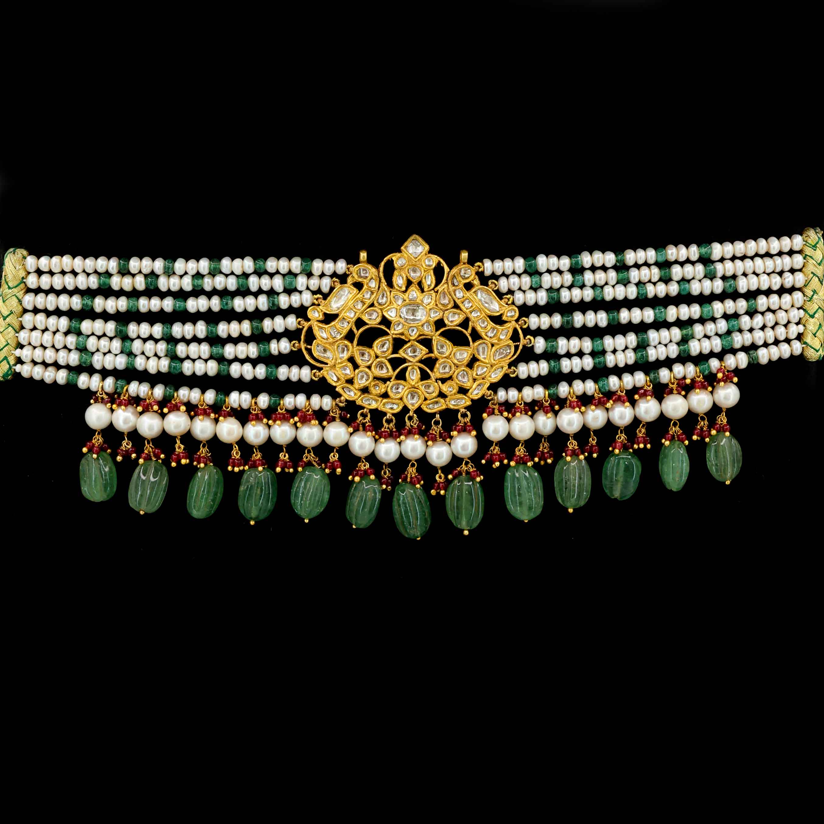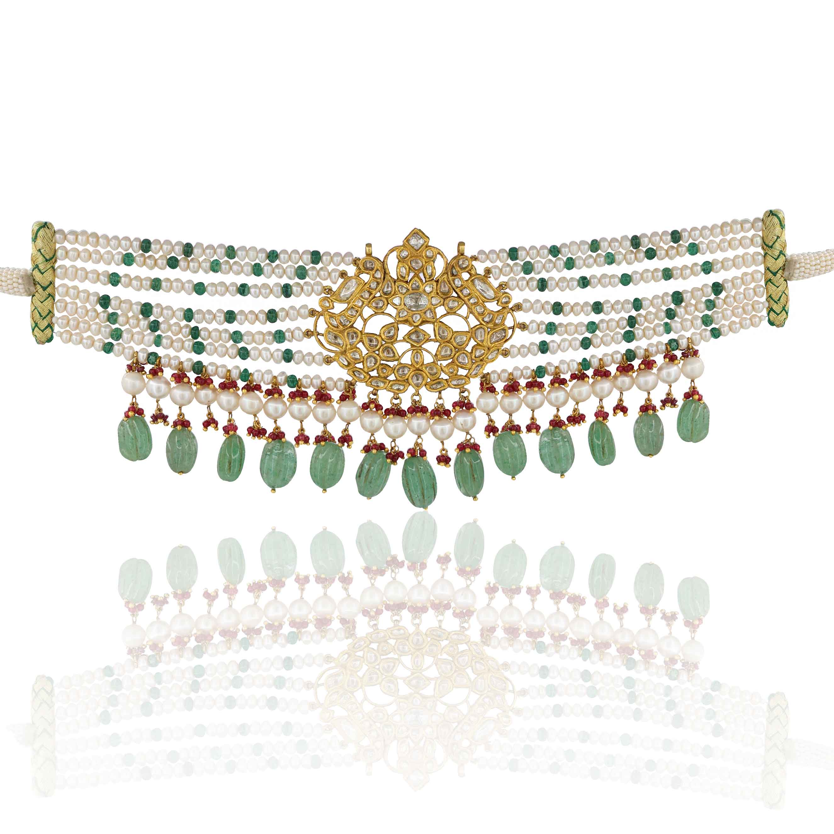 Polki Diamond choker strung with multiple tiers of pearls and tiny green emerald beads. It features drops of carved emerald and ruby glass.