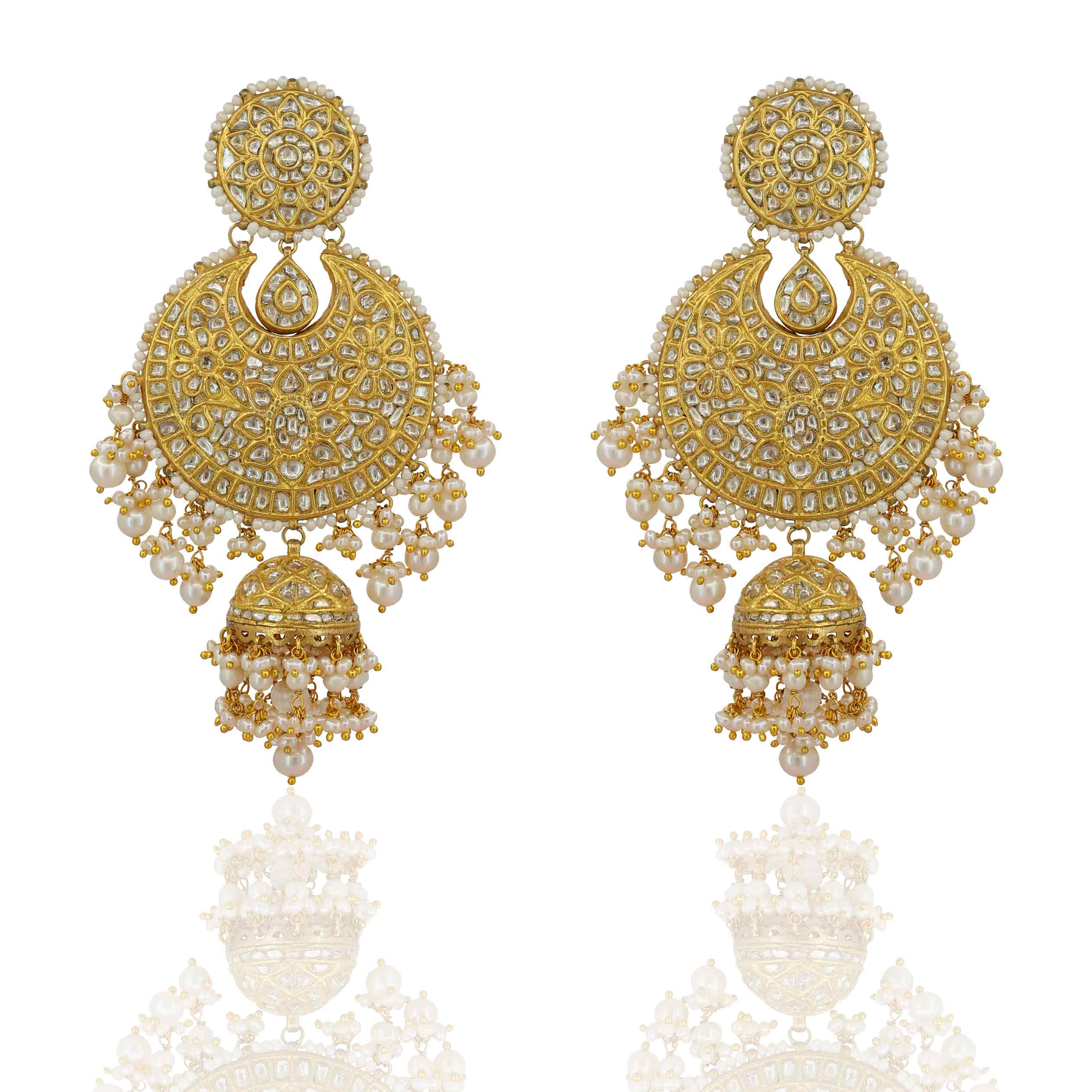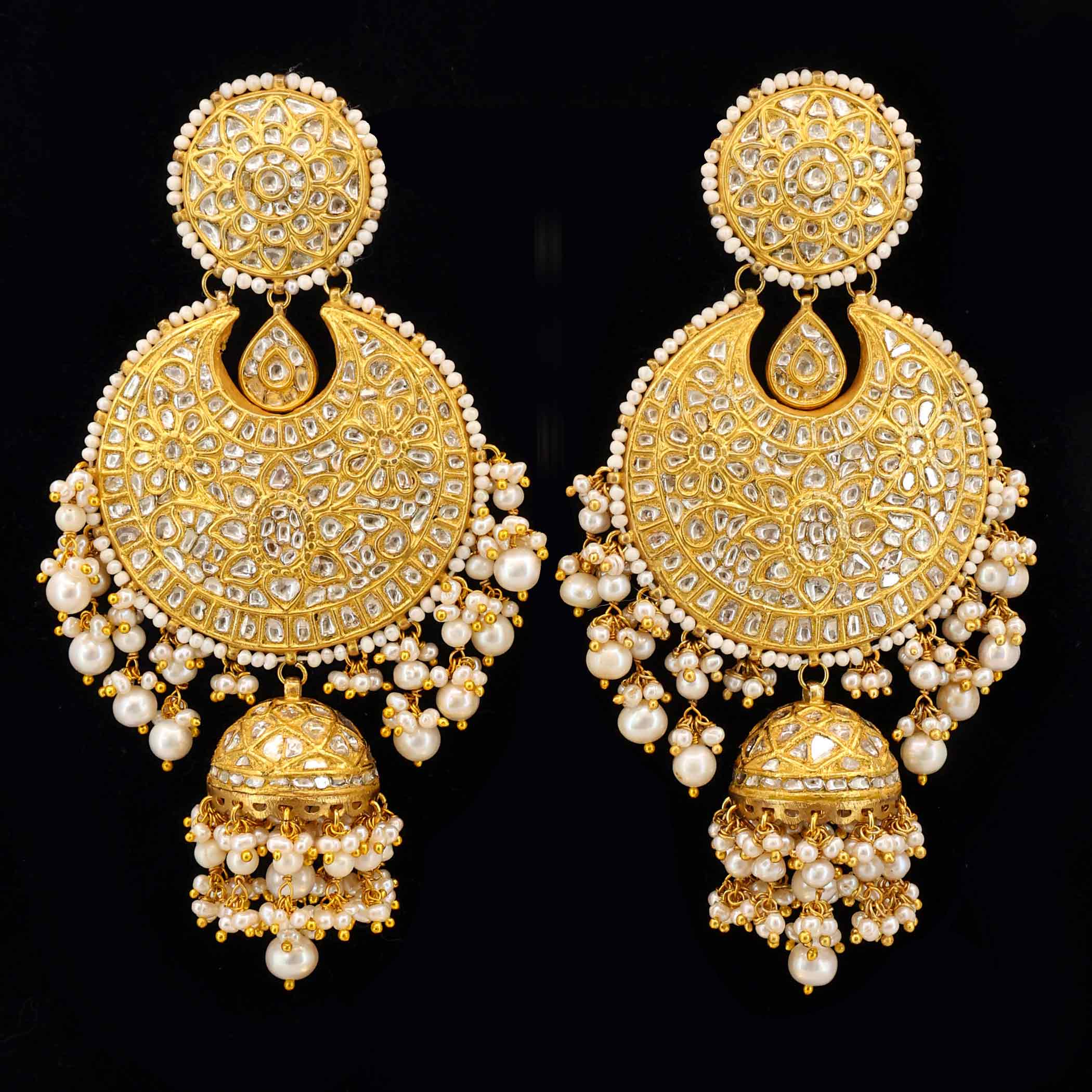 gold Chandbali earrings feature a broad, crescent moon (Chandbaali) set with numerous Natural Polki Diamonds. A miniature jhumki (bell) drops from the center. The entire earring is lavishly trimmed with clusters of delicate pearls, creating a grand and traditional statement piece.