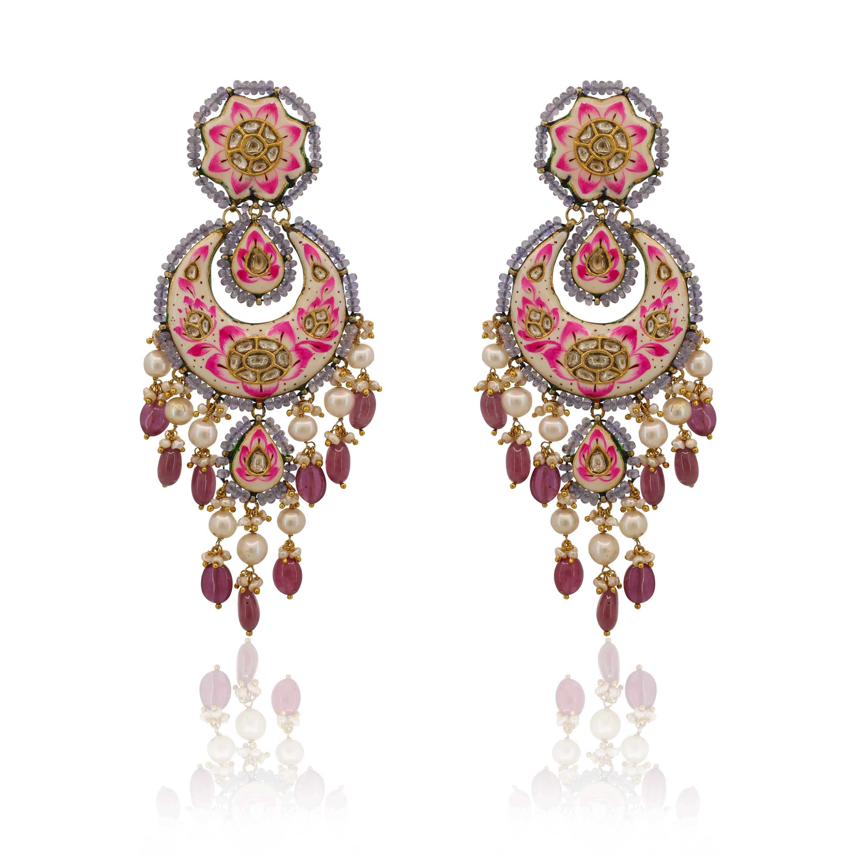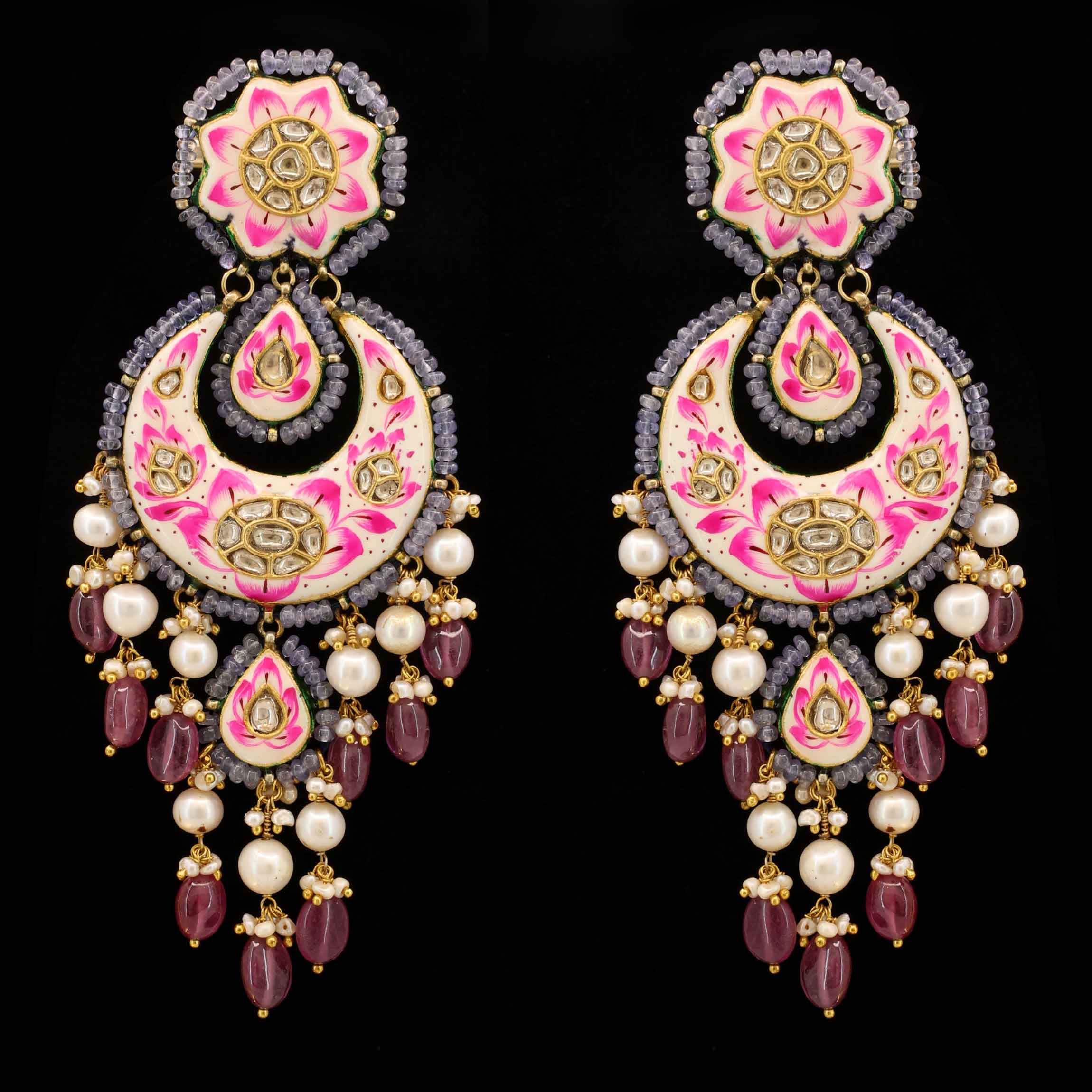 These artistic Chandbalis feature stunning hand-painted pink enamel work (Meenakari) with Polki diamonds. The vibrant design is completed with dangling Tanzanite beads, glass-filled rubies, and pearls, creating a unique and opulent statement piece.