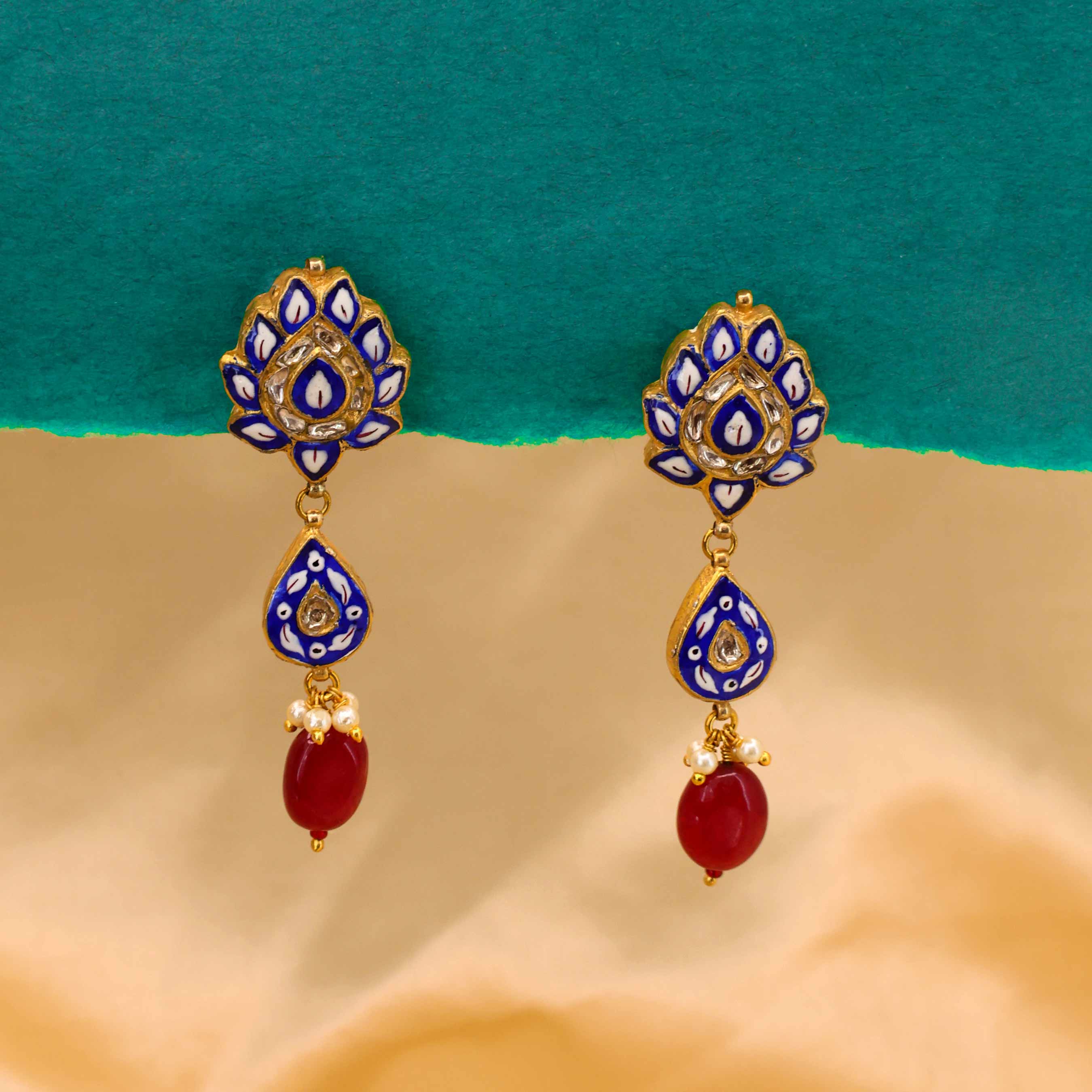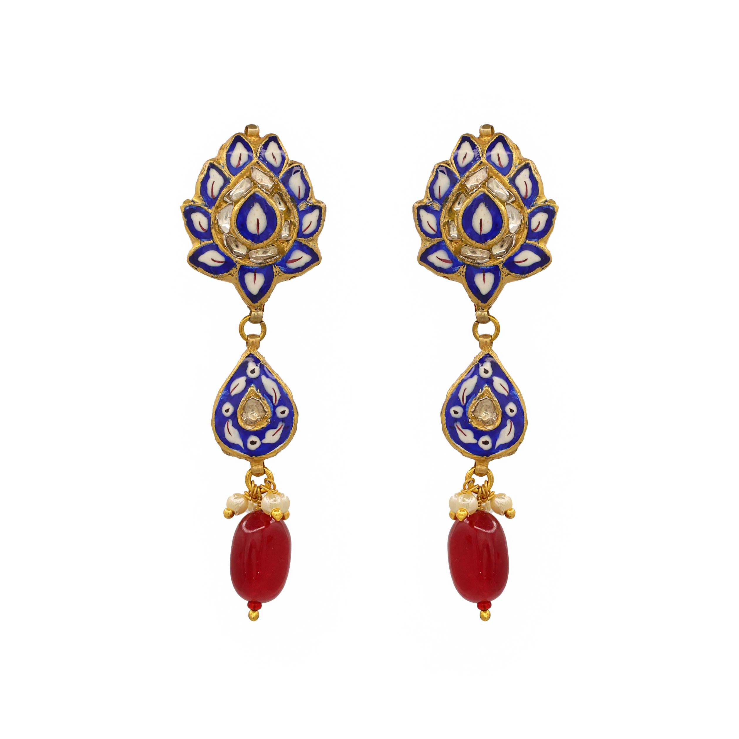 These traditional gold earrings feature a floral design with intricate blue and white enamel work and a Polki diamond at the center of each floral section. Below the main stud, a gold drop piece with matching enamel and another Polki diamond dangles, terminating in a red gemstone bead. The elegant and detailed design makes them a striking accessory.