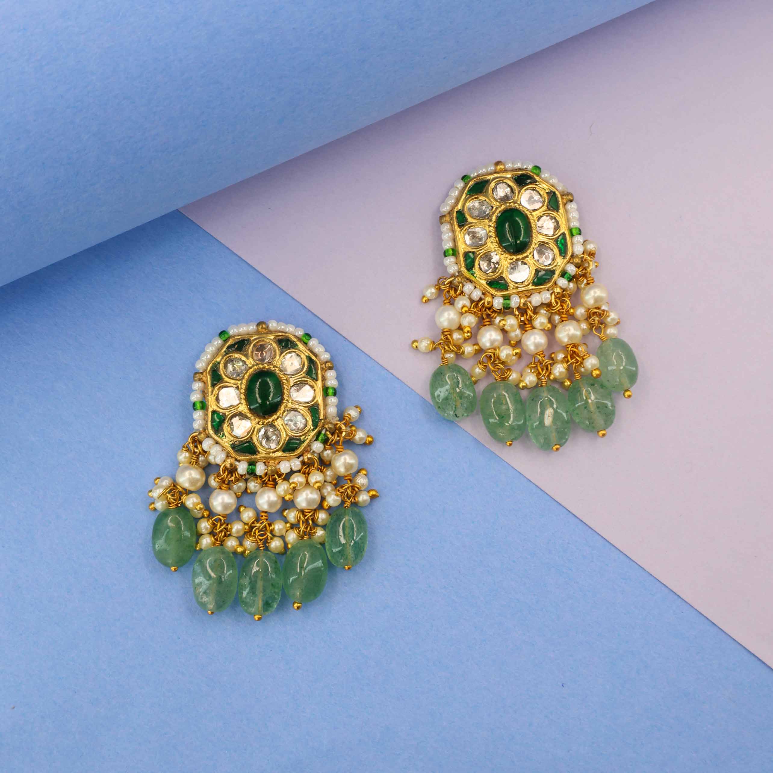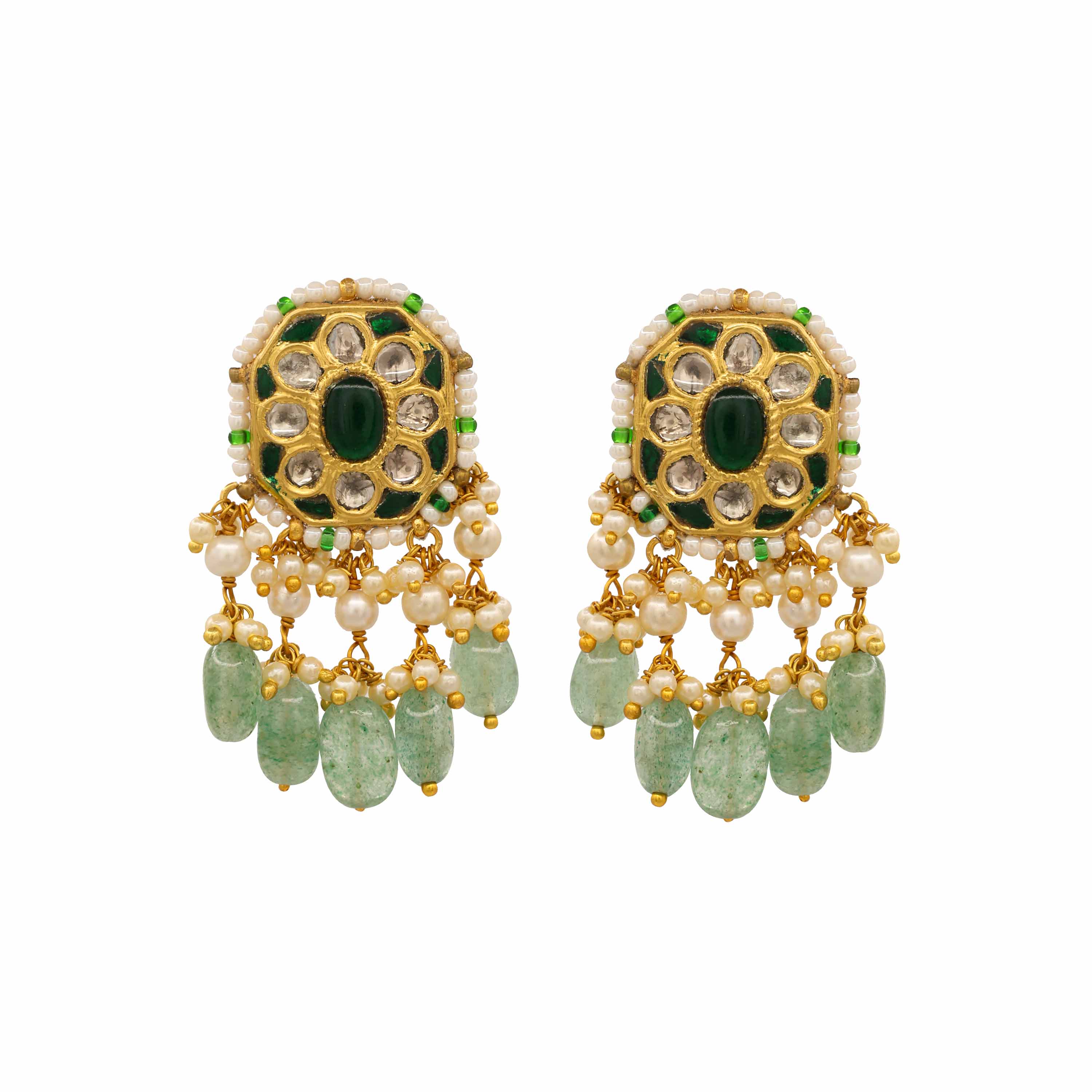 These beautiful earrings feature a central Polki diamond surrounded by an oval green gemstone, set in a gold frame. The intricate design is bordered with white and green beads, with a graceful cascade of pearls and faceted green gemstones dangling below.