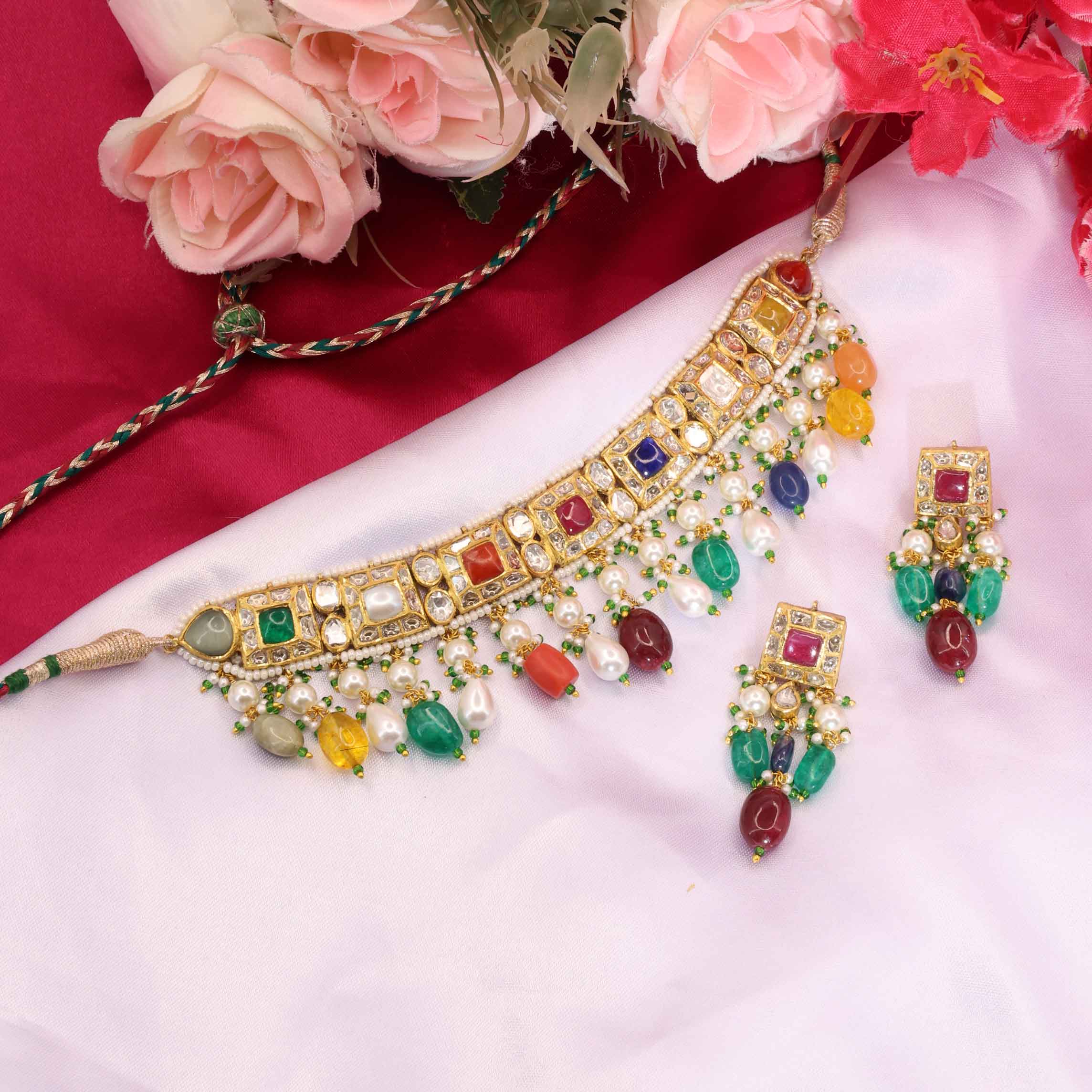 This regal Jadau Navratna Choker features Polki diamonds set around nine multi-colored gemstones. It is elegantly finished with dangling pearls and beads, creating an opulent, traditional statement set.