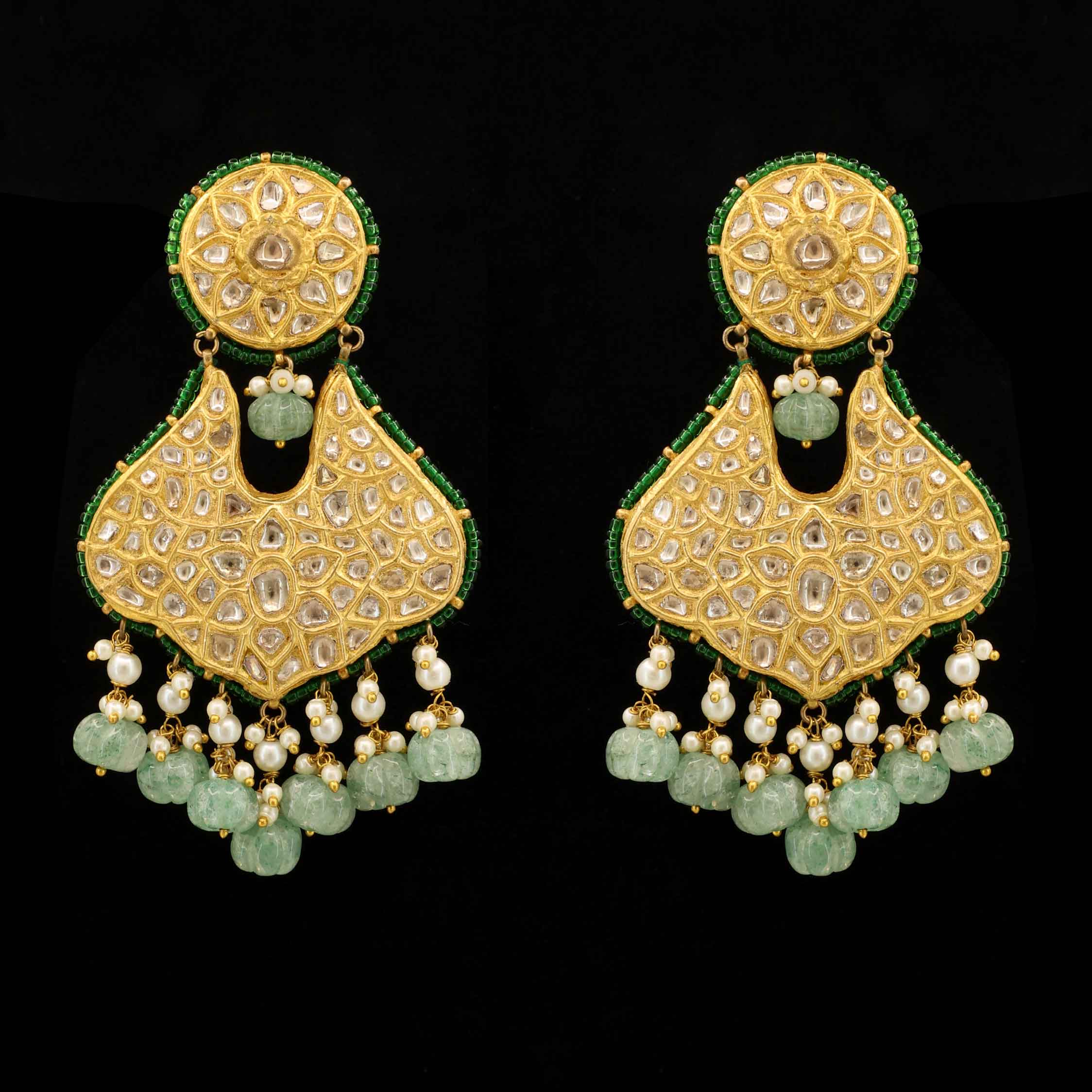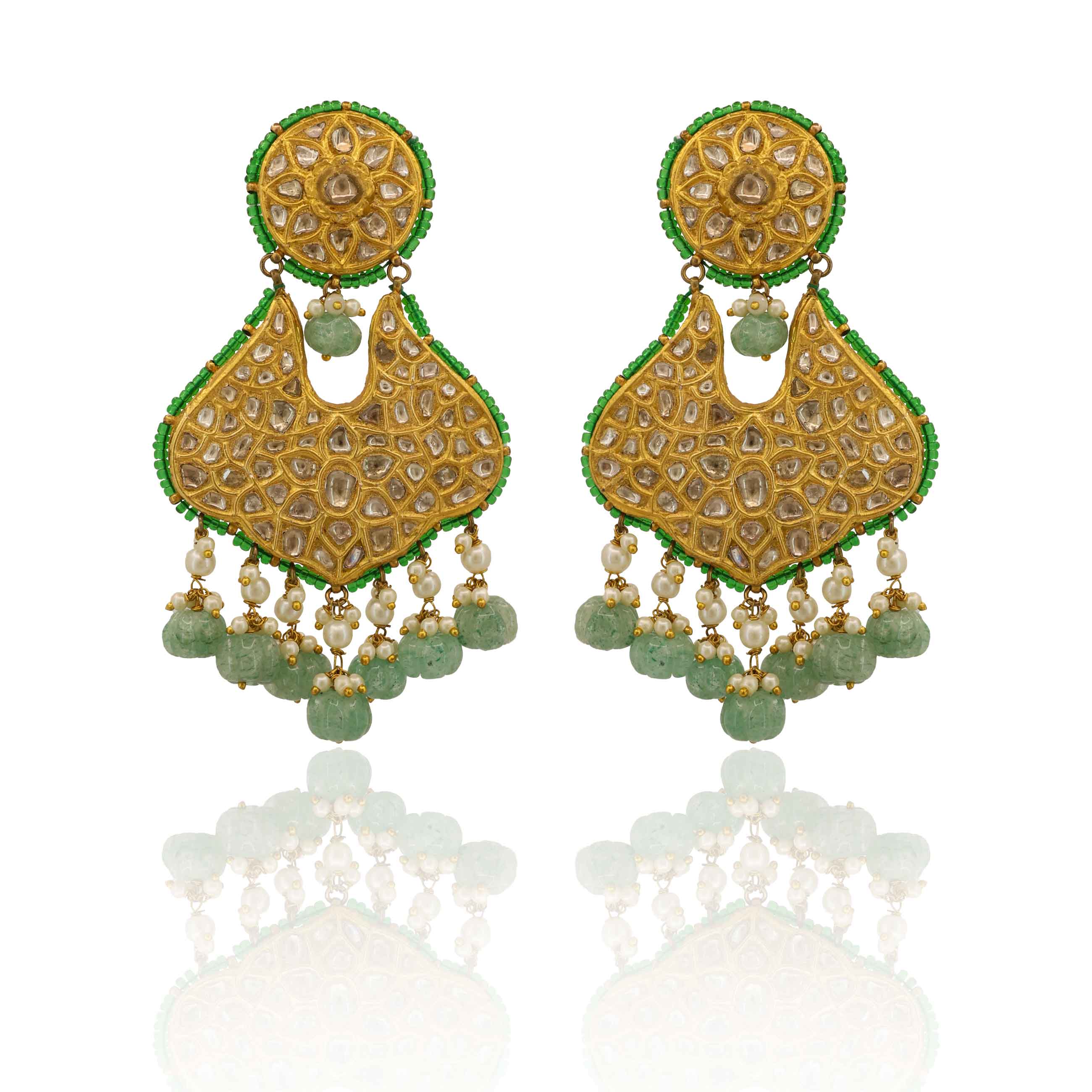 These regal Chandbalis feature Polki diamonds set around a beautiful carved emerald stone. The traditional crescent is adorned with dangling emerald beads and lustrous pearl clusters, creating a luxurious, heirloom-quality statement piece.