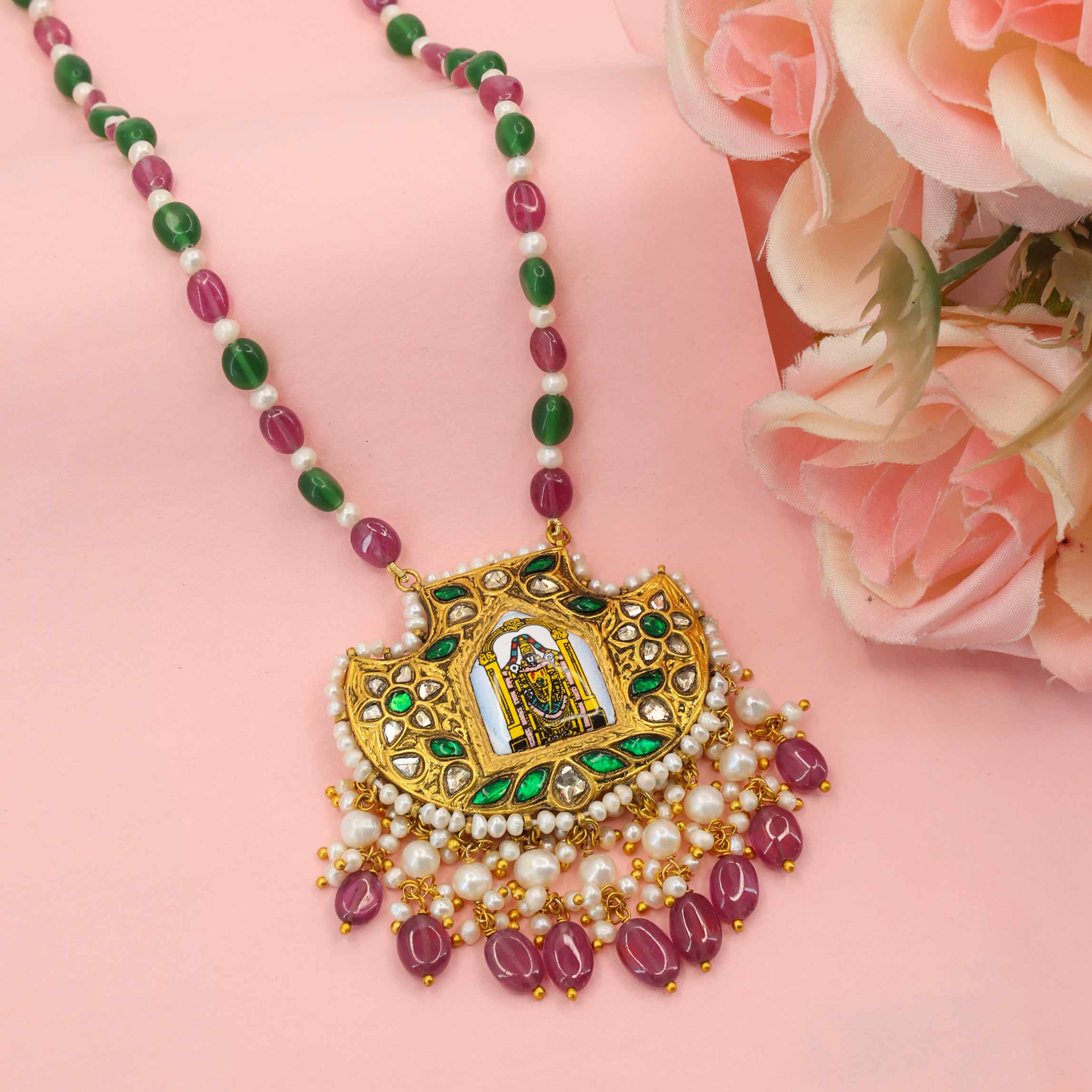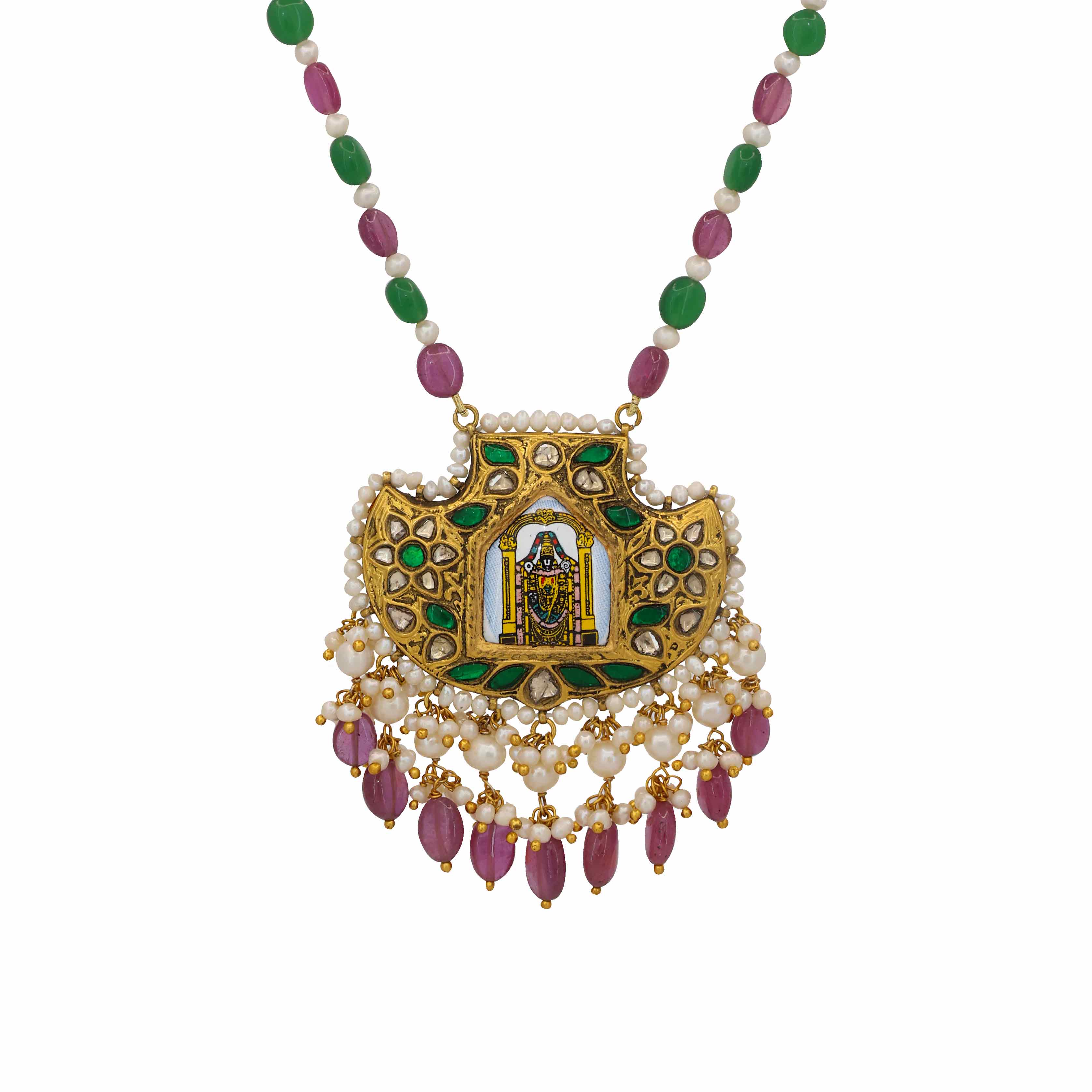This gold pendant necklace features a striking pendant with a hand-painted image of Shreenathji at its center, surrounded by green enamel work and natural syndicate polki diamonds. The bottom of the pendant is adorned with delicate pearl and ruby bead tassels. The piece hangs from a multi-strand necklace of alternating ruby and emerald beads.