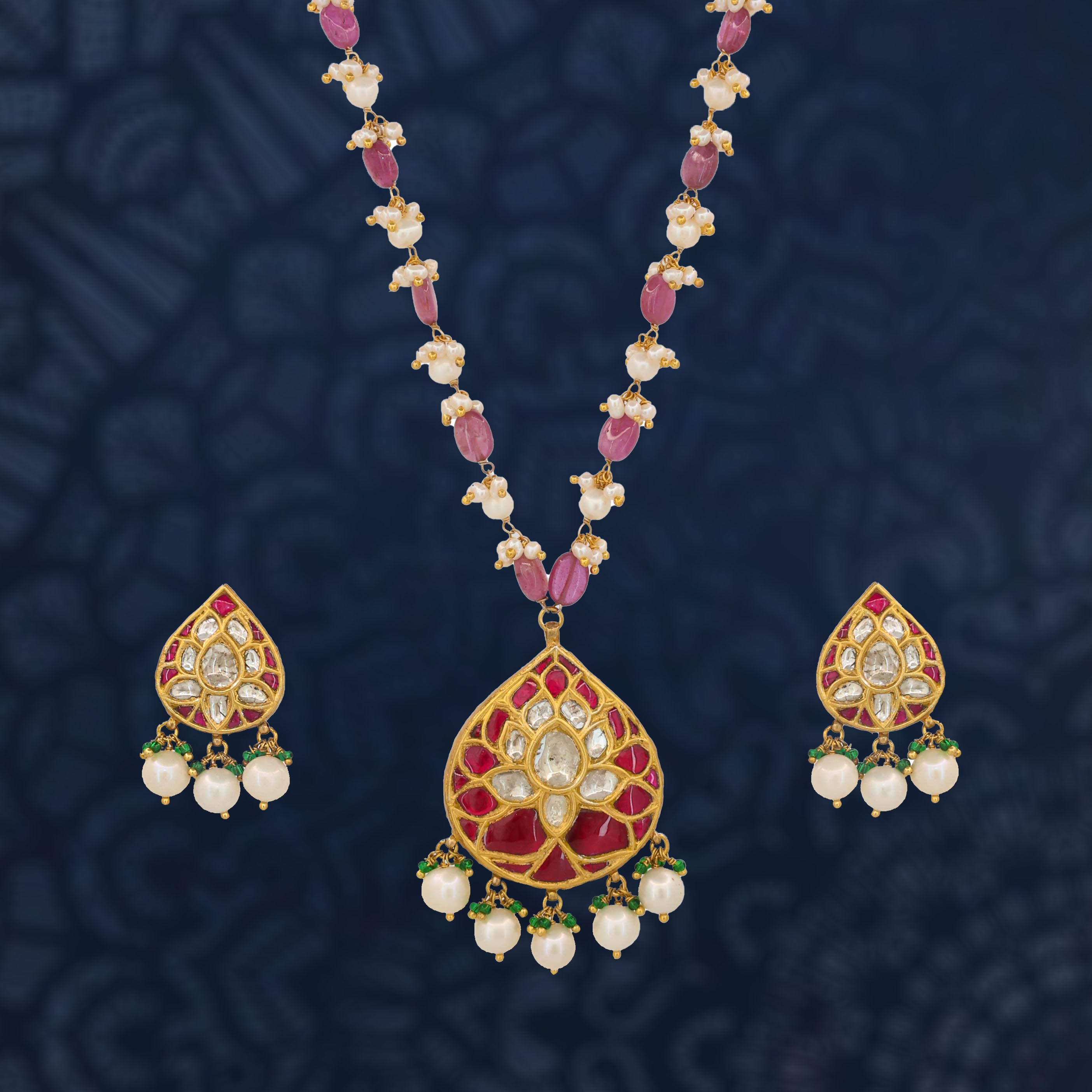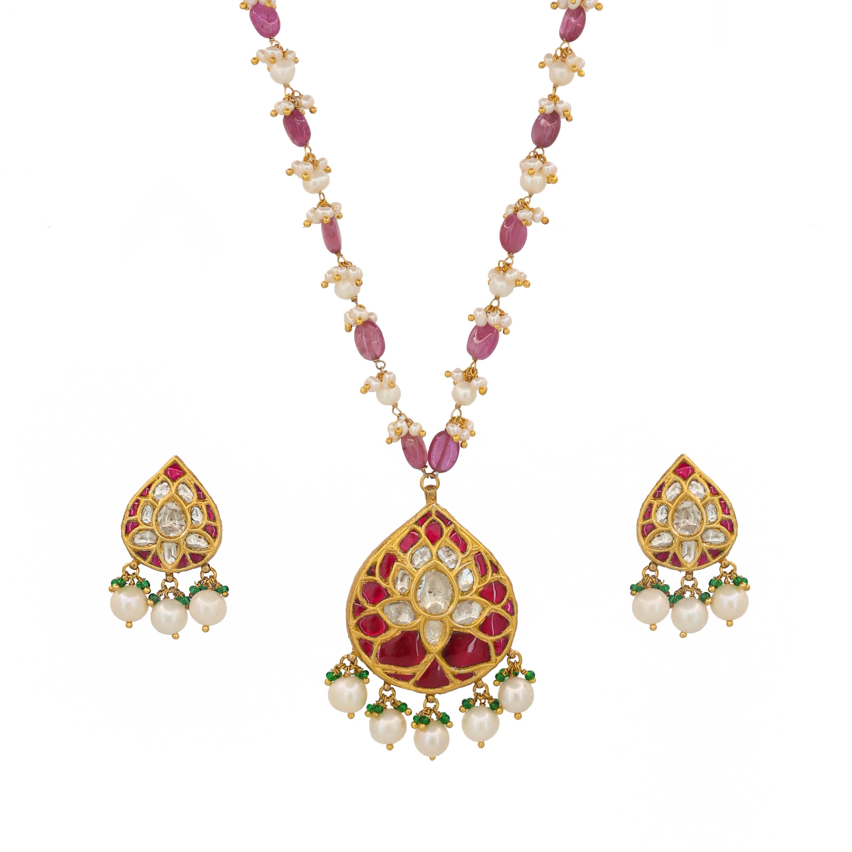 This gold polki diamond and ruby pendant set features a lotus floral design, strung with pearls and ruby beads.