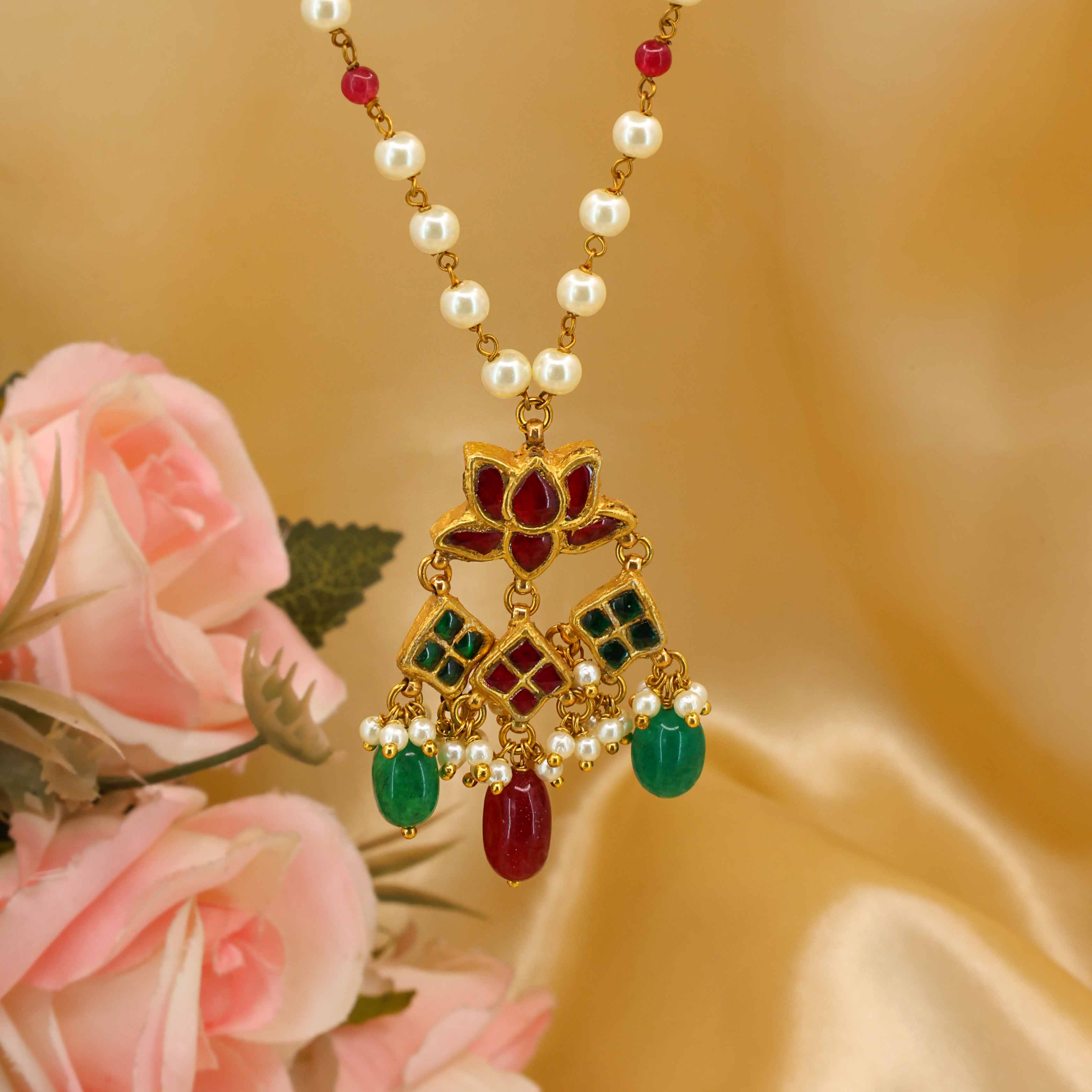 This exquisite gold necklace features a lotus-shaped pendant, meticulously crafted with glass-filled rubies and emeralds. The design gracefully hangs from a delicate strand of pearls and ruby beads. This piece perfectly blends traditional elegance with a touch of vibrant color.