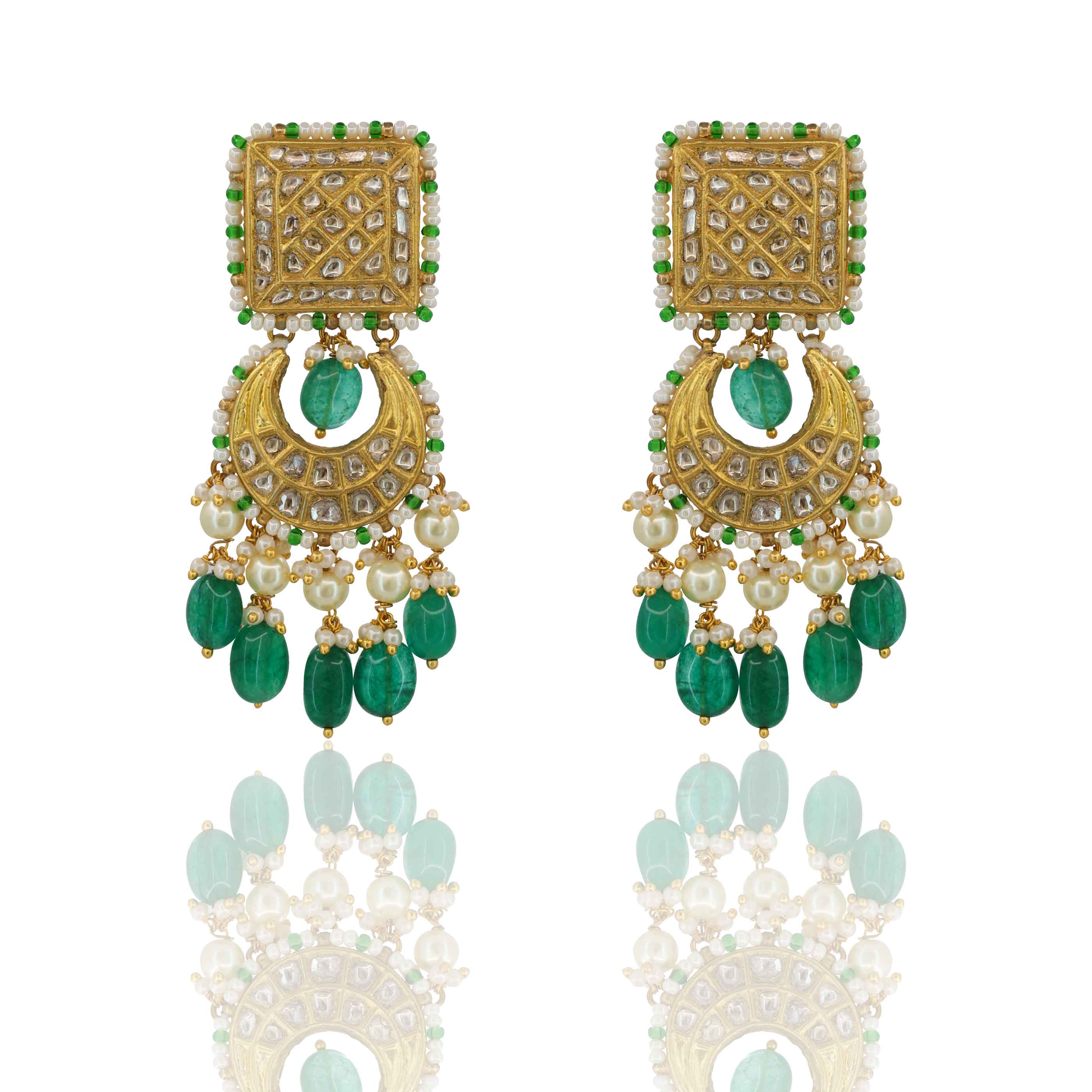 Gold Chandbaali Earrings featuring a square Polki Diamond top and crescent drop. They are beautifully accented with vibrant Glass Emerald bead drops and stringed Pearls, giving them a rich, traditional flair.
