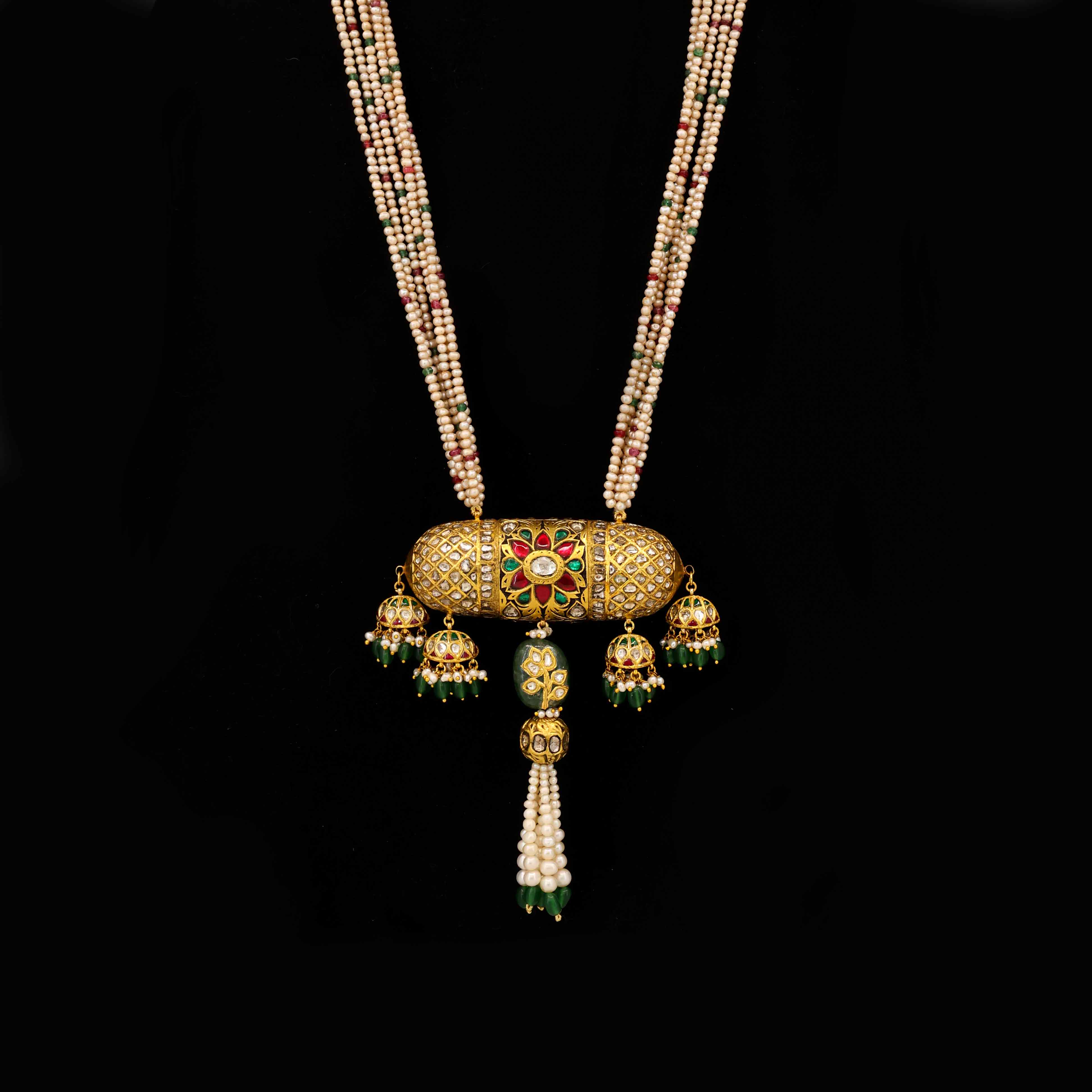 This striking gold pendant features a central cylindrical body with rounded ends, intricately detailed with colorful Partash work in floral and geometric patterns. Accents of sparkling polkis add richness. Dangling elements with green stones and pearls enhance its unique shape. The pendant connects to strands of delicate white pearls interspersed with green accents, creating a statement piece.