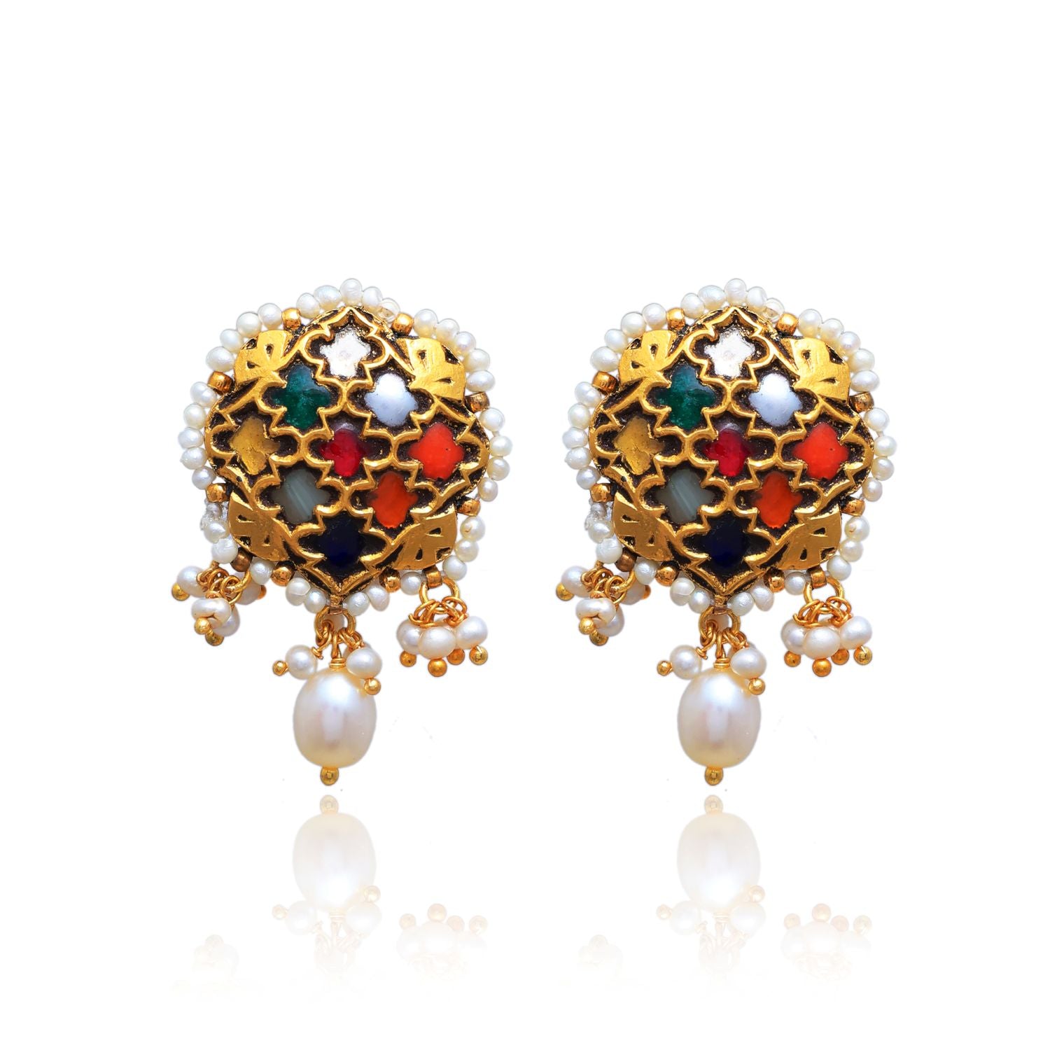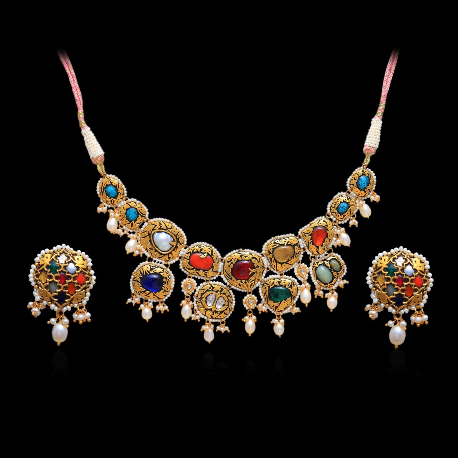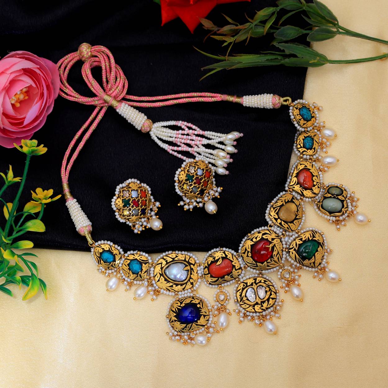This exquisite gold Navratan necklace set showcases traditional Partash craftsmanship. Each of the nine auspicious gemstones, including vibrant rubies, emeralds, and sapphires, is beautifully set alongside natural Polki diamonds. Delicate pearl drops enhance the intricate design, creating a regal and culturally rich jewelry ensemble.