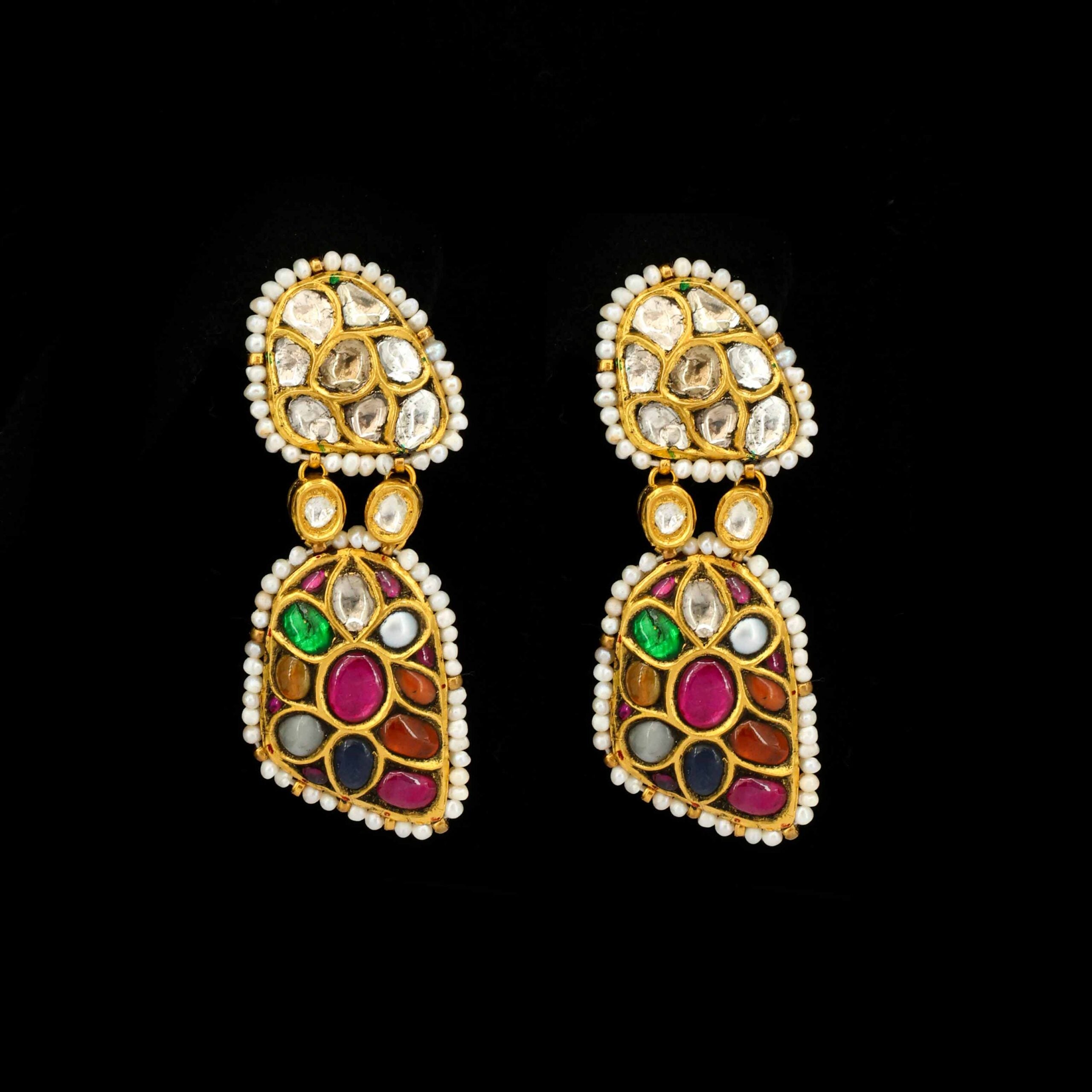 These captivating earrings feature a dazzling display of uncut Polki diamonds at the top. Below, a vibrant mosaic of multi-colored stones creates a rich, eye-catching design. Framed by delicate pearls, these pieces beautifully combine traditional Indian artistry with a playful burst of color, perfect for adding ethnic elegance.