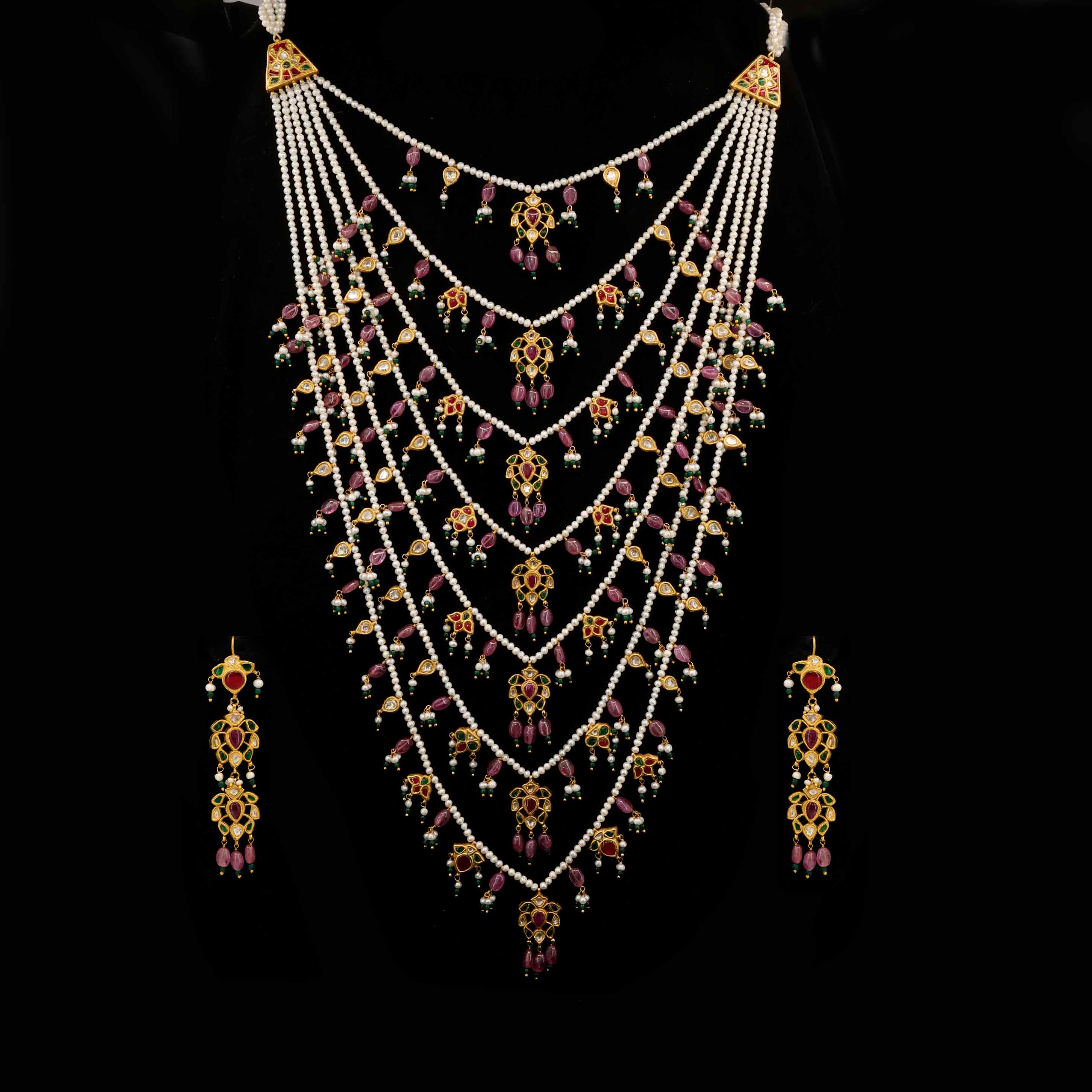 Gold Satlada Necklace Set features a dramatic seven-tiered cascade of pearls and ruby/emerald beads. It is intricately studded with Polki diamonds and ruby/emerald accents, forming a grand, opulent bridal statement.
