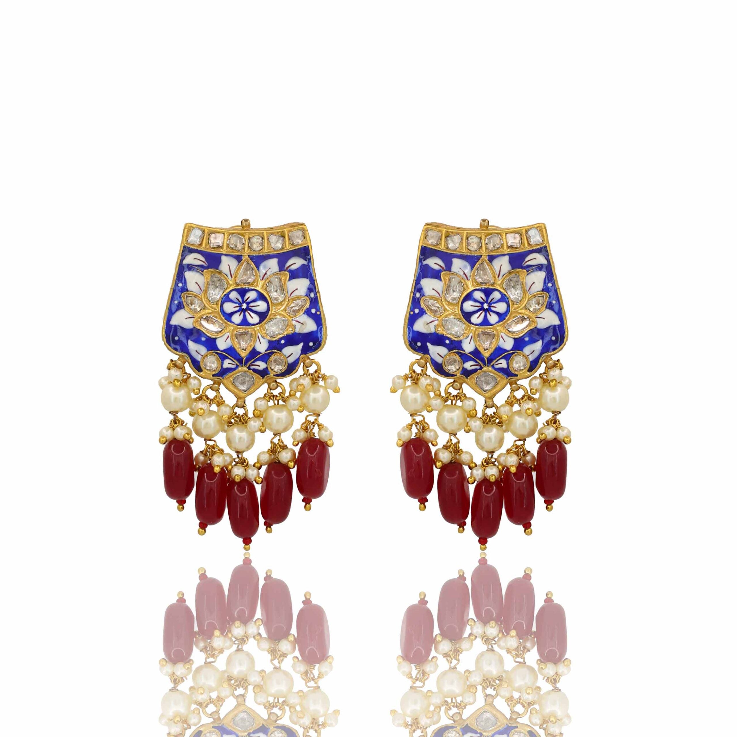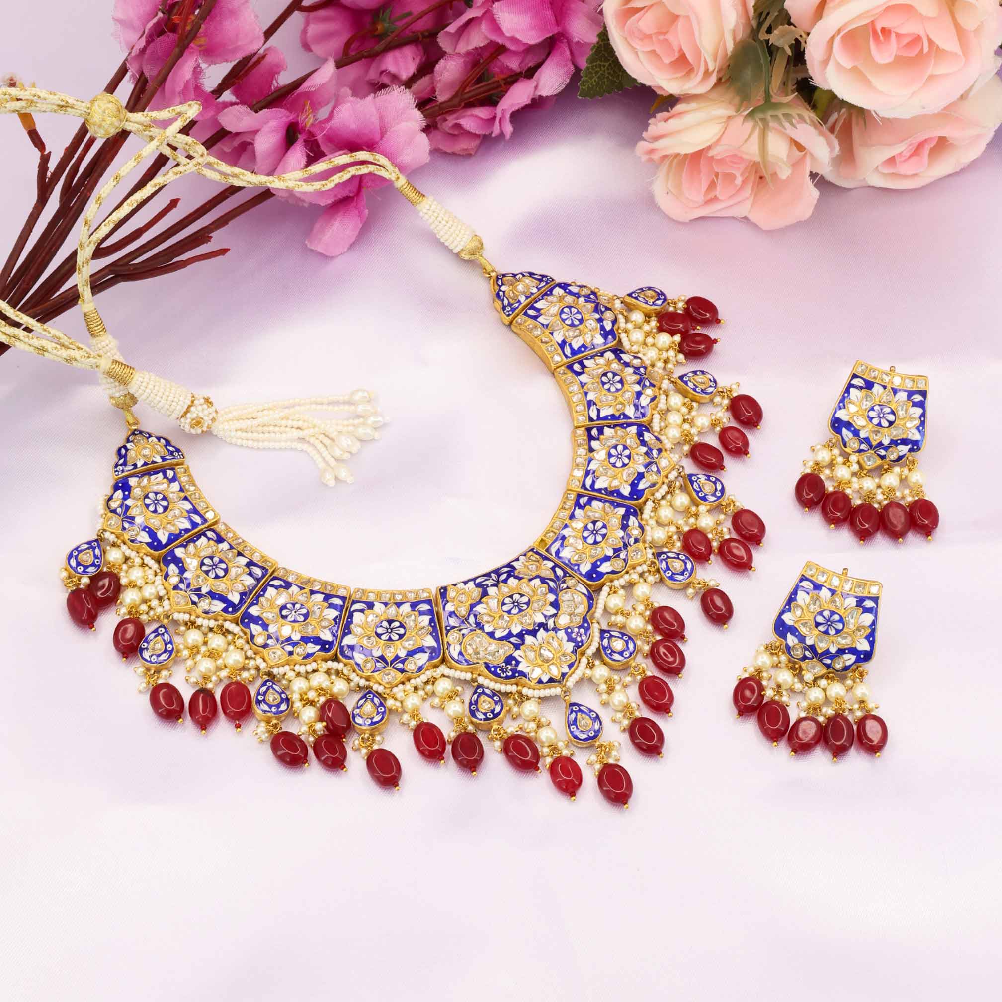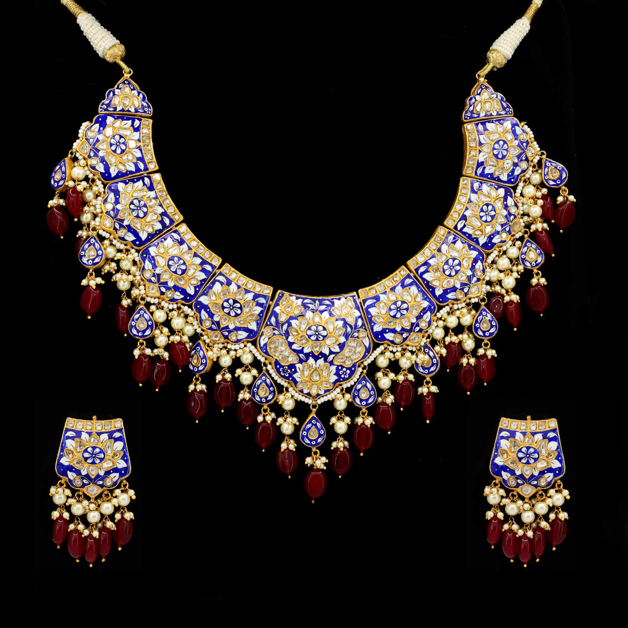 This exquisite enamel necklace set showcases intricate blue and white floral designs, set with natural polki diamonds. It’s adorned with dangling glass-filled ruby beads and delicate pearls, creating a rich, traditional aesthetic. Matching earrings complete this vibrant and elegant ensemble.